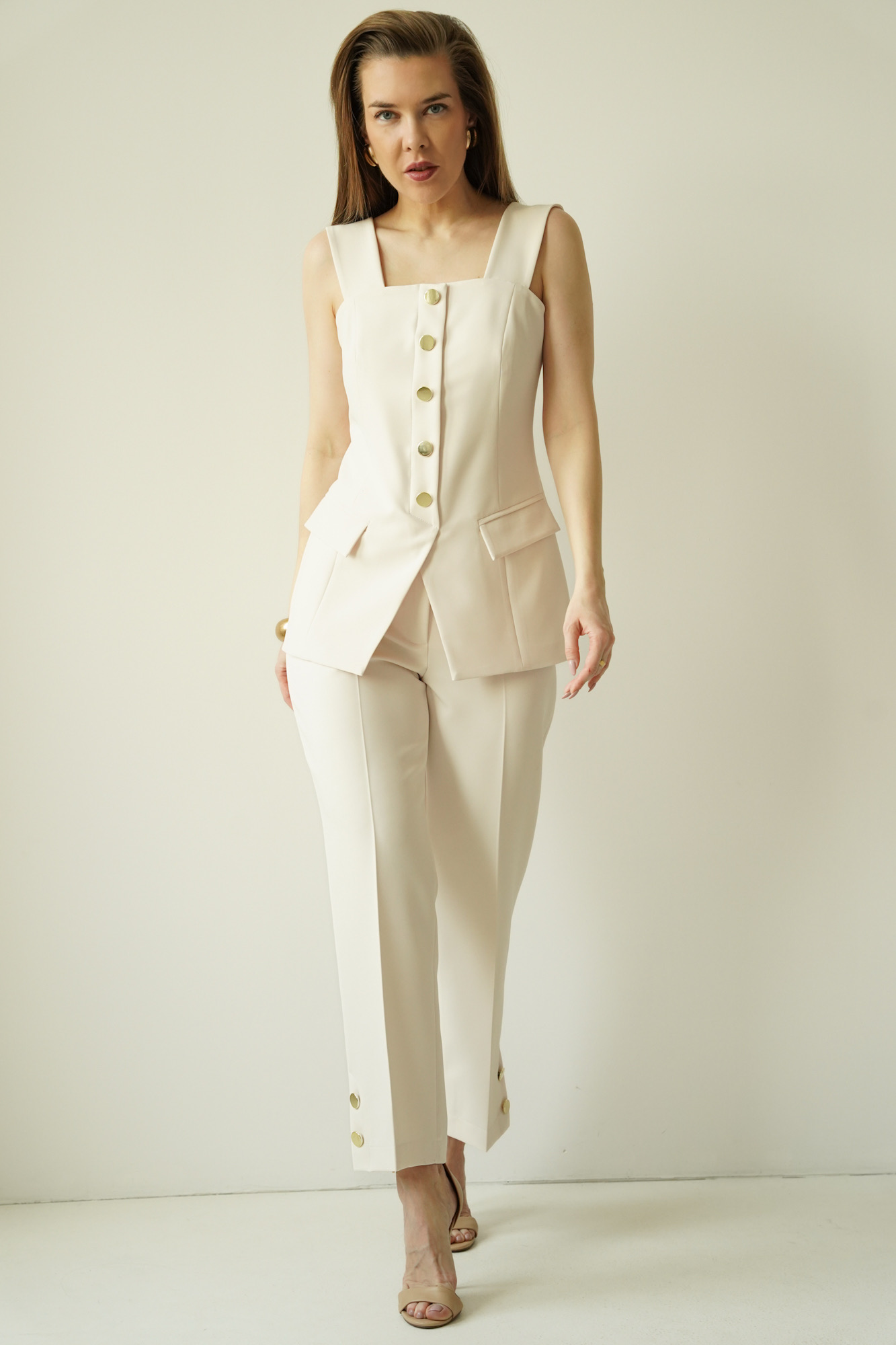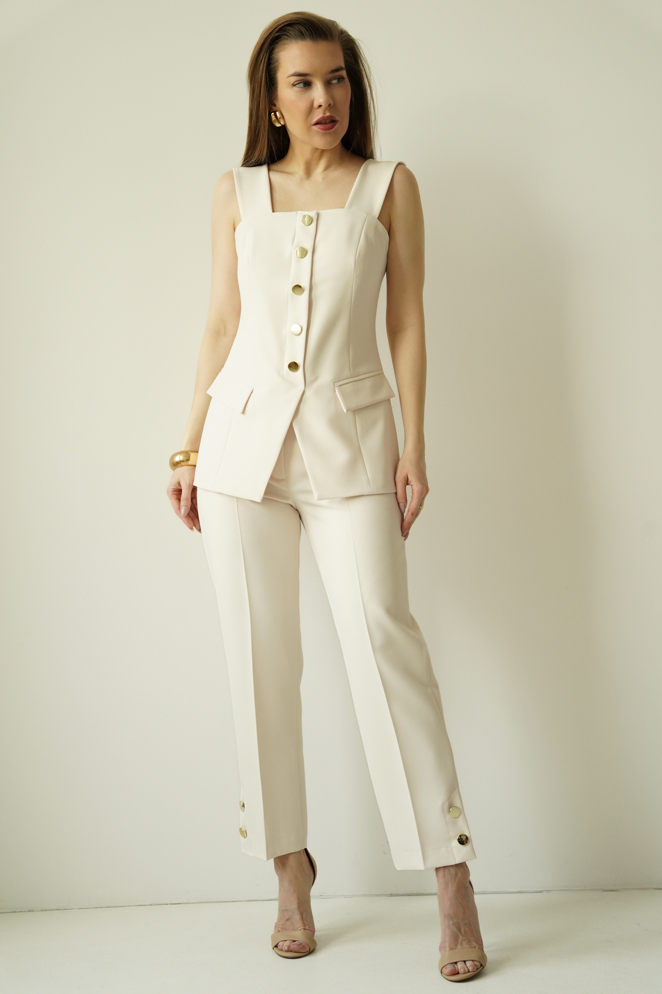 Megan to elegancki komplet składający się z dłuższej kamizelki na szerokich ramiączkach z dekoltem typu karo oraz spodni na kant zdobionych guzikami przy nogawkach. Model łączy klasyczne krawiectwo z nowoczesnym detalem. Idealny na uroczystości rodzinne, wesele, ale także w codziennych stylizacjach dla miłośniczek eleganckiego looku.