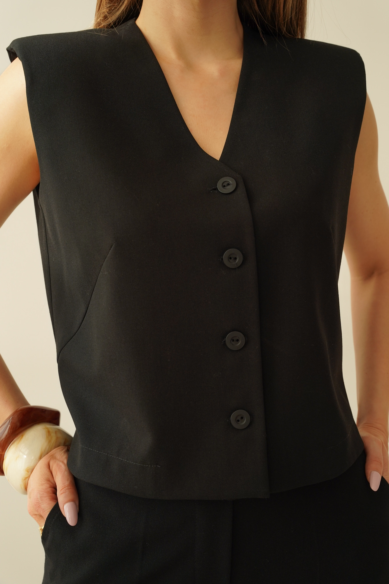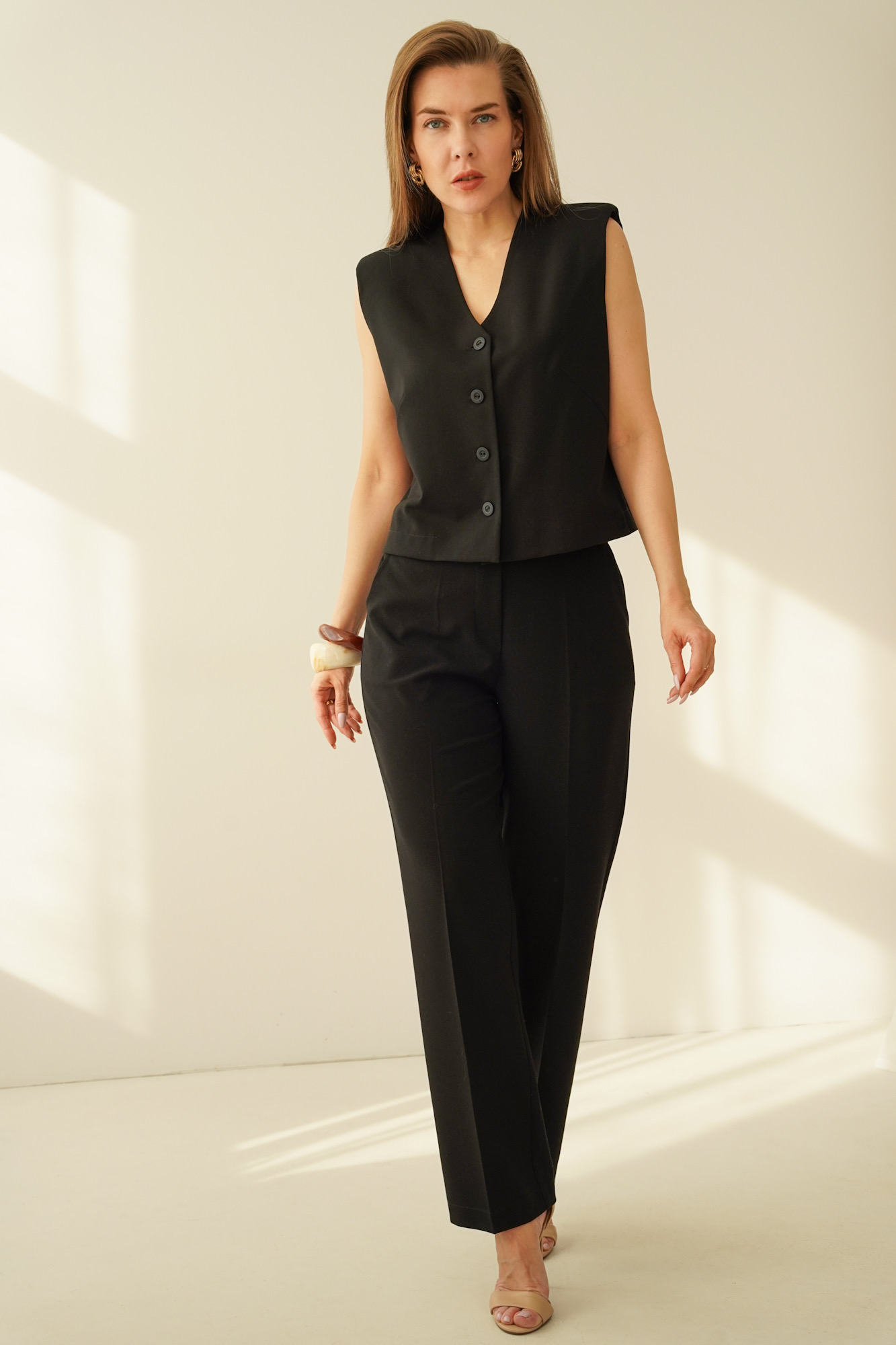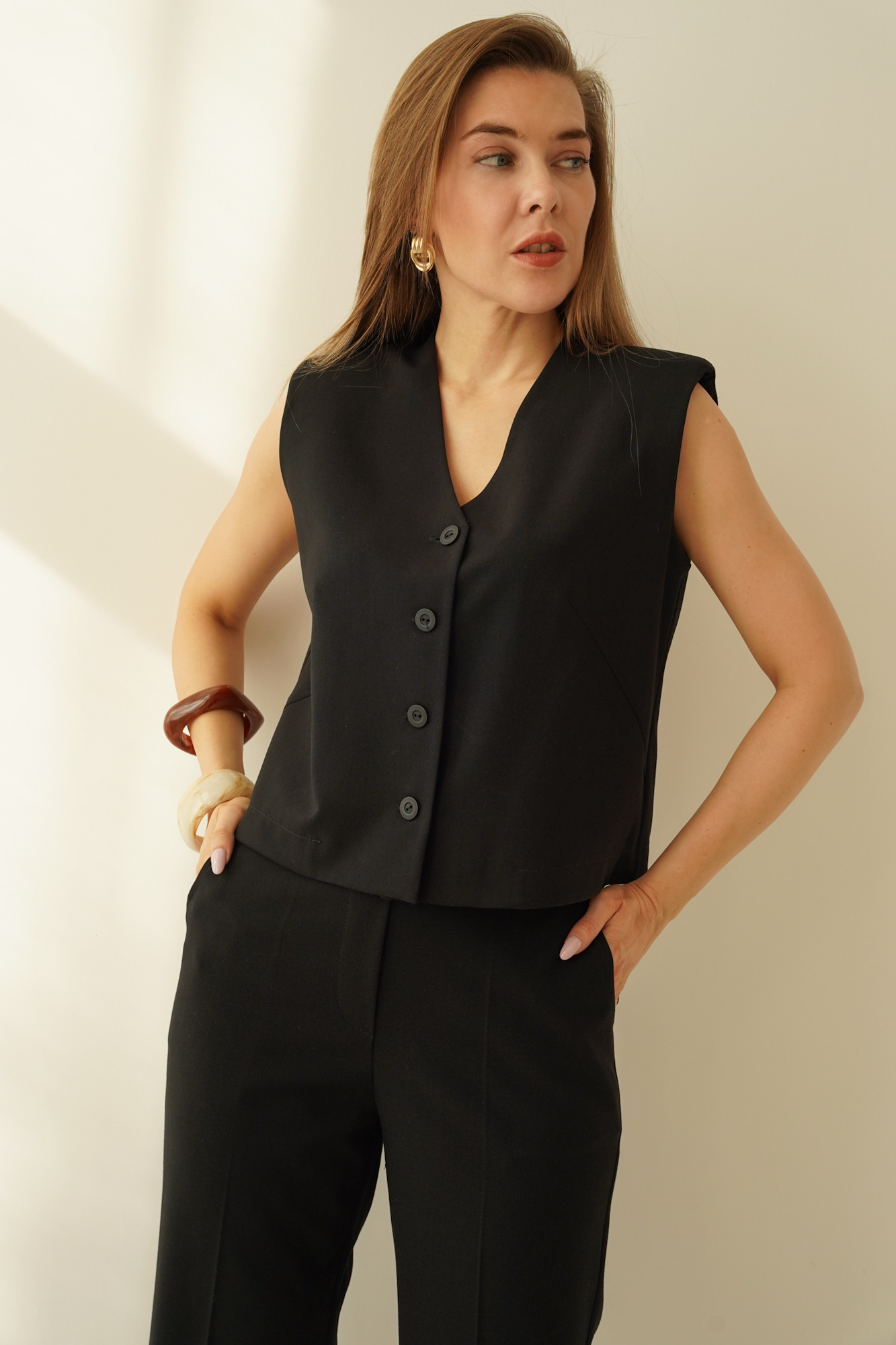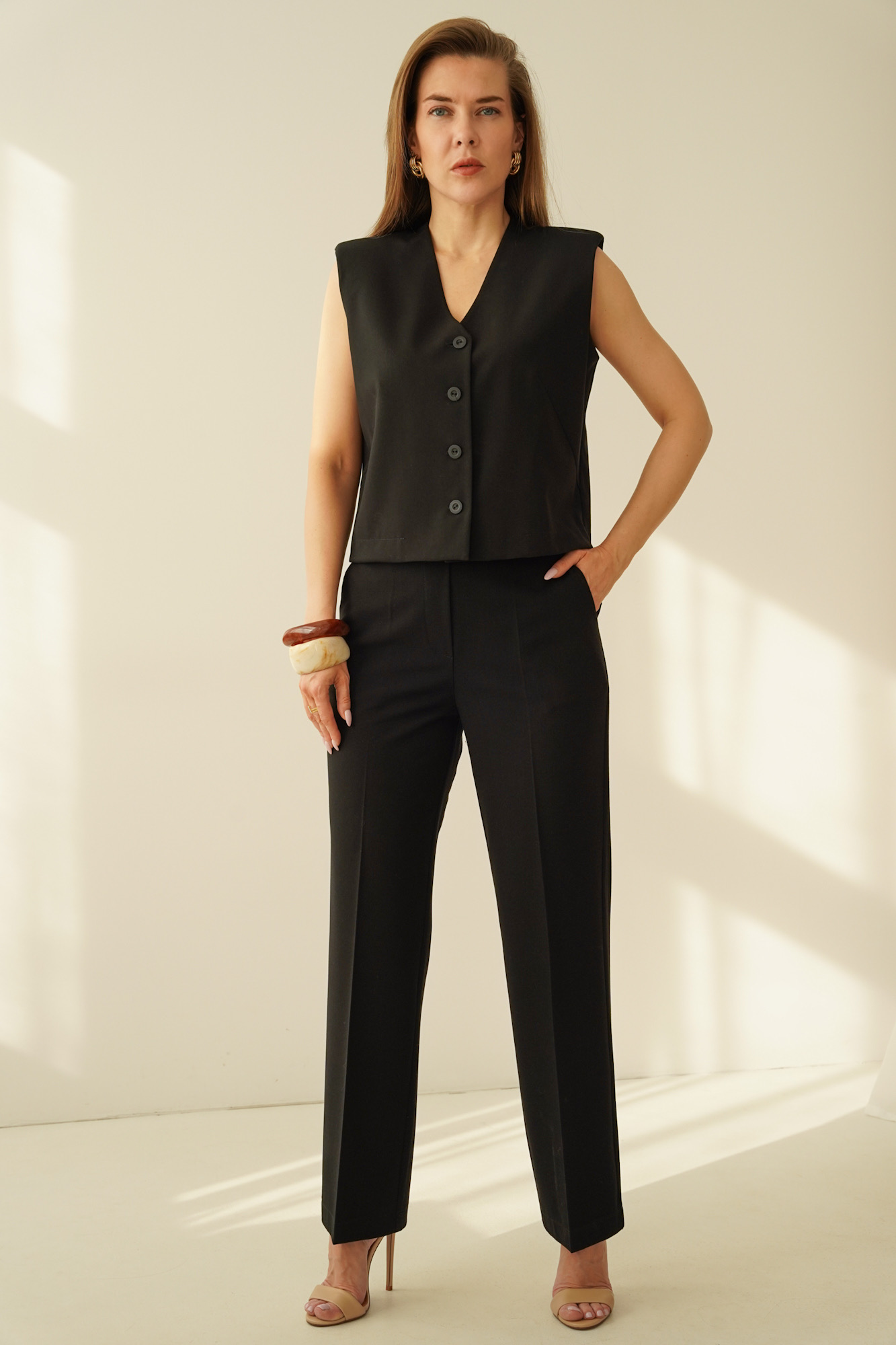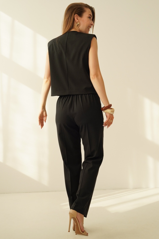 ISSA to elegancki komplet o ponadczasowym charakterze, który łączy klasyczną formę z nowoczesnym podejściem do komfortu. Zestaw składa się z kamizelki o subtelnie pudełkowym kroju oraz eleganckich spodni z kieszeniami i wygodną gumką w tylnej części pasa.