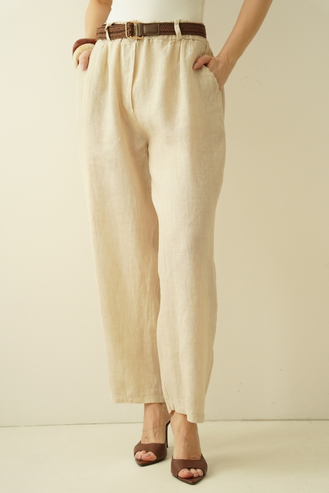 Kaila to stylowe lniane spodnie z wyższym stanem, uszyte ze 100% lnu. Lekki, przewiewny materiał sprawia, że model idealnie sprawdza się w ciepłe dni, zapewniając komfort i elegancki wygląd. Spodnie posiadają kieszeniegumkę w tylnej części pasa oraz zwężane ku dołowi nogawki, które subtelnie wysmuklają sylwetkę i nadają całości nowoczesnego charakteru. To ponadczasowy model, który doskonale uzupełni letnią garderobę premium.