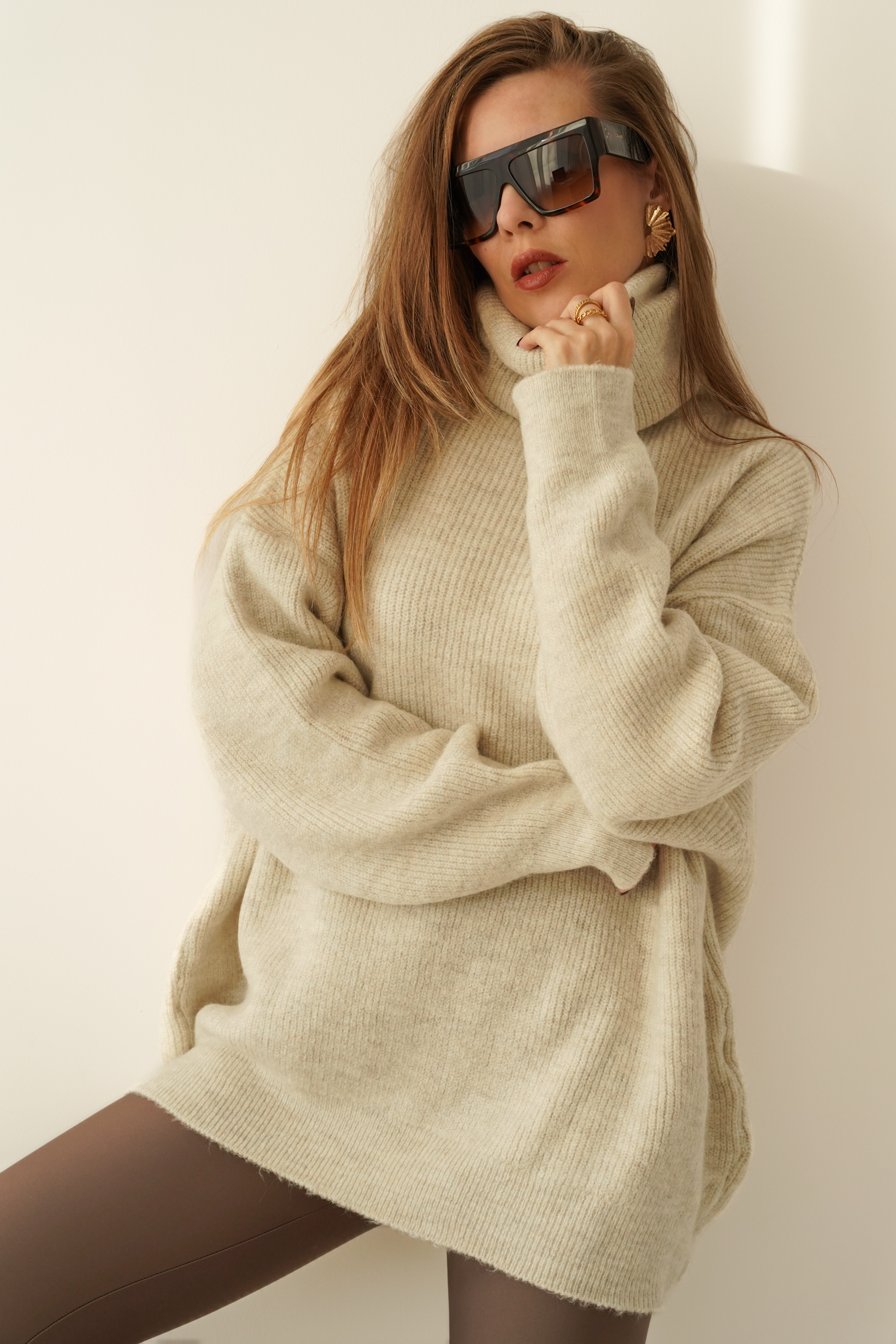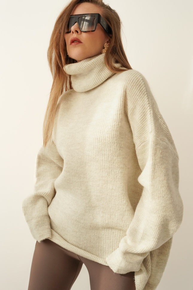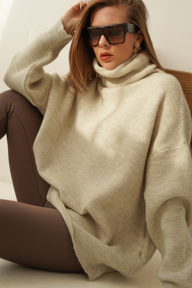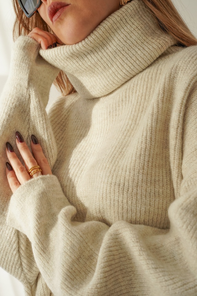 Miękki, oversizowy sweter o luźnym fasonie i wysokim golfie, wykonany z luksusowej przędzy z baby alpaki i wełny. Drobny prążek nadaje mu subtelnej elegancji, a klasyczny krój sprawia, że pasuje zarówno do jeansów, jak i legginsów. „Après” to ponadczasowy model, który otula ciepłem i wpisuje się w estetykę nowoczesnego minimalizmu.