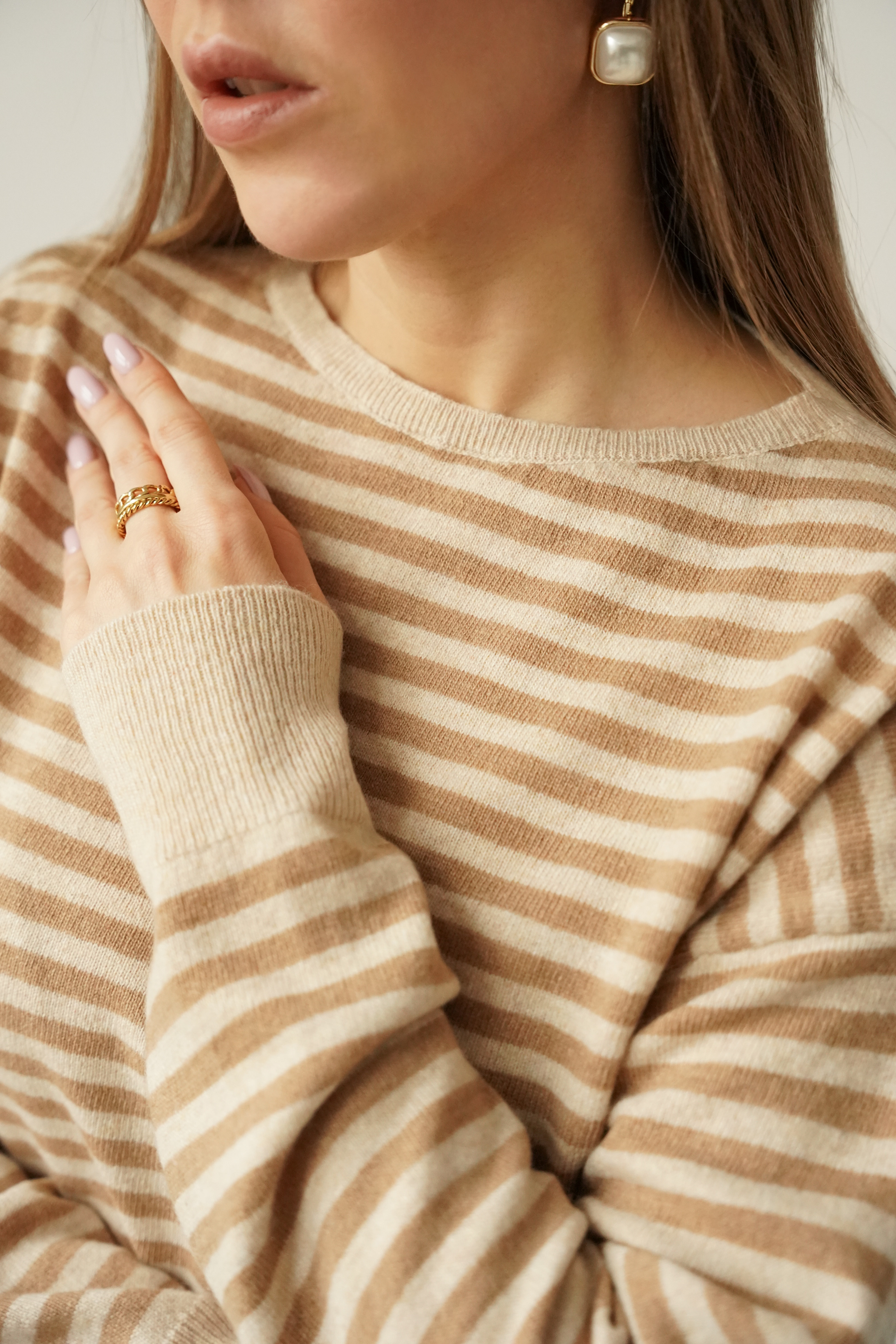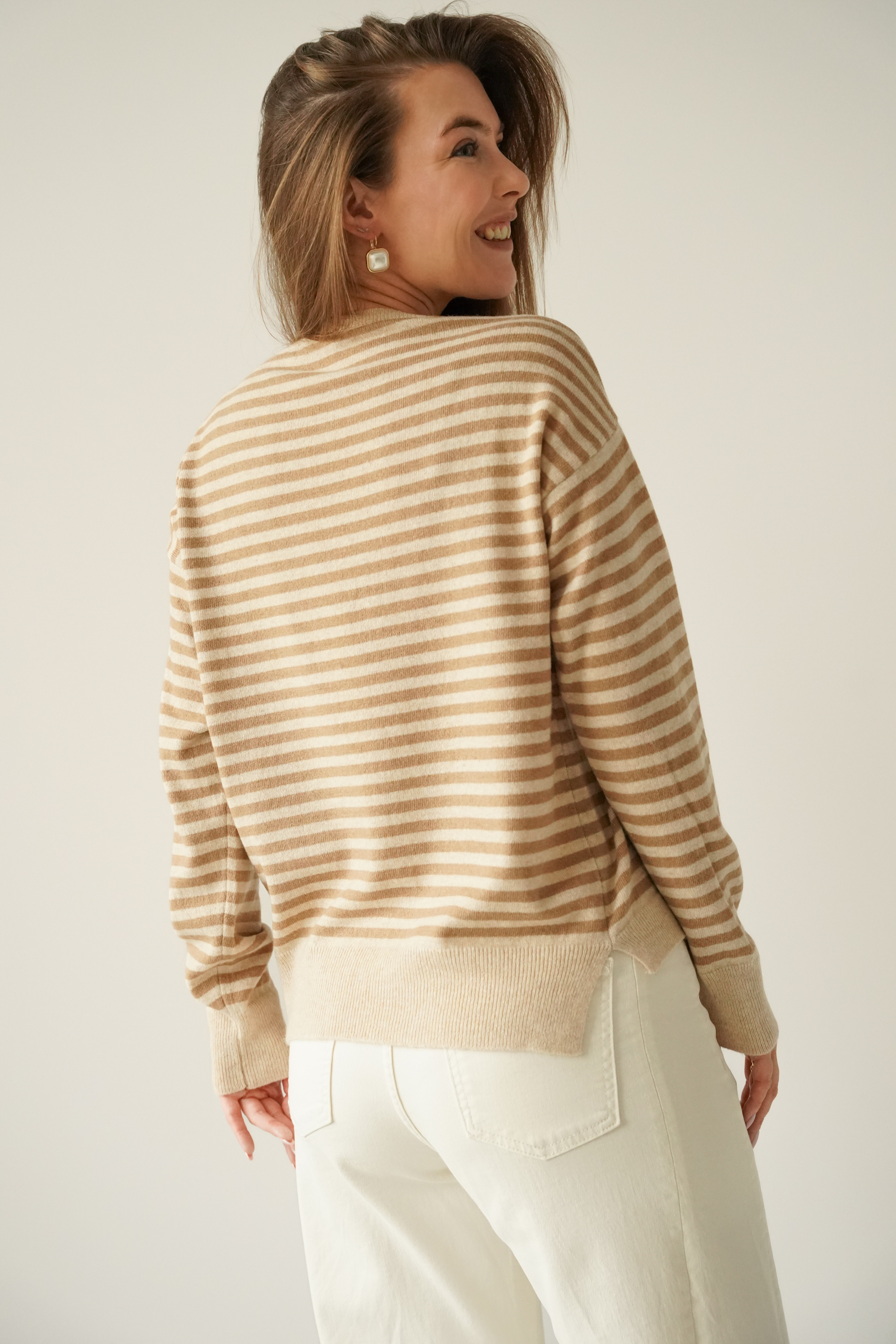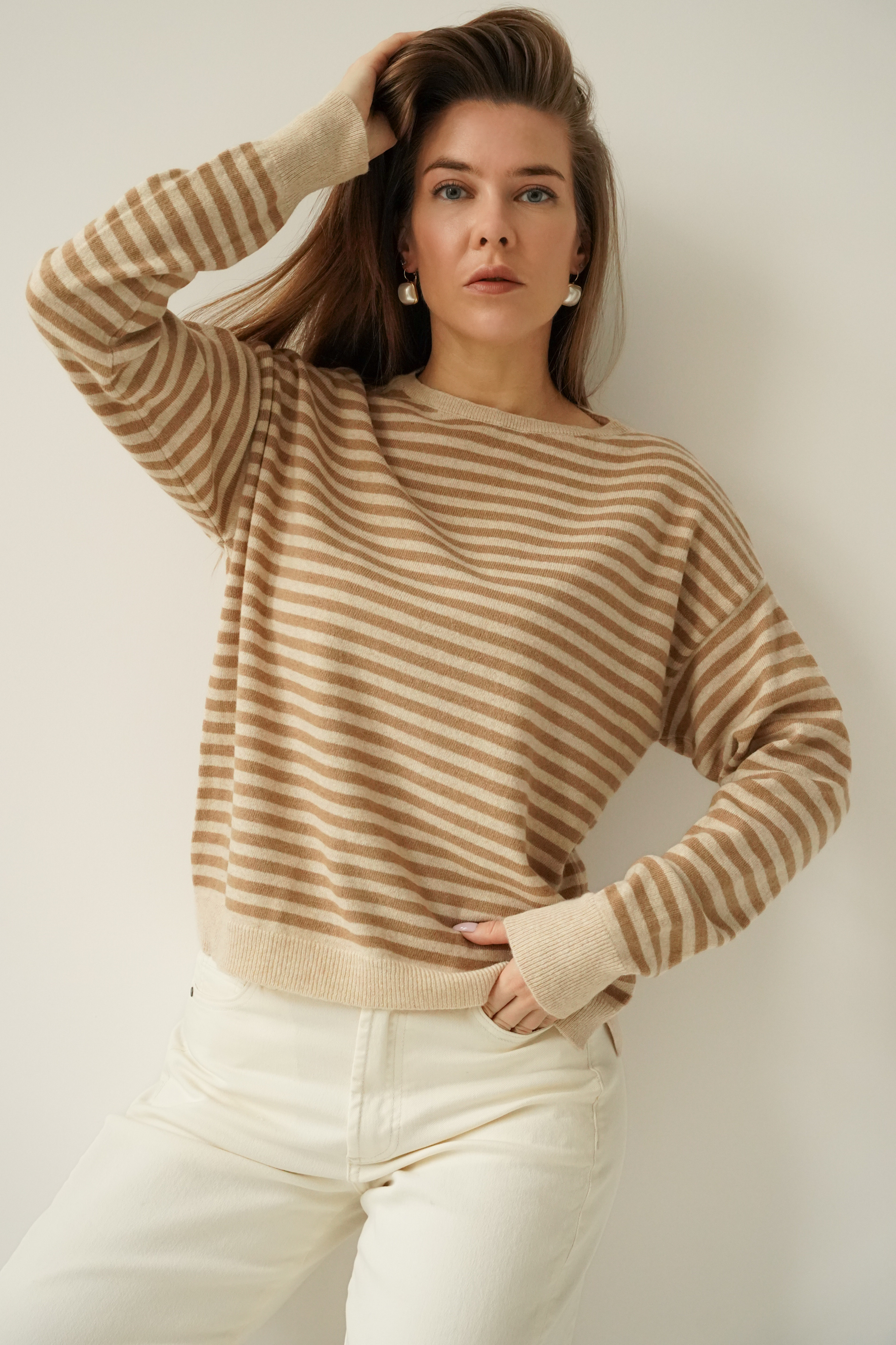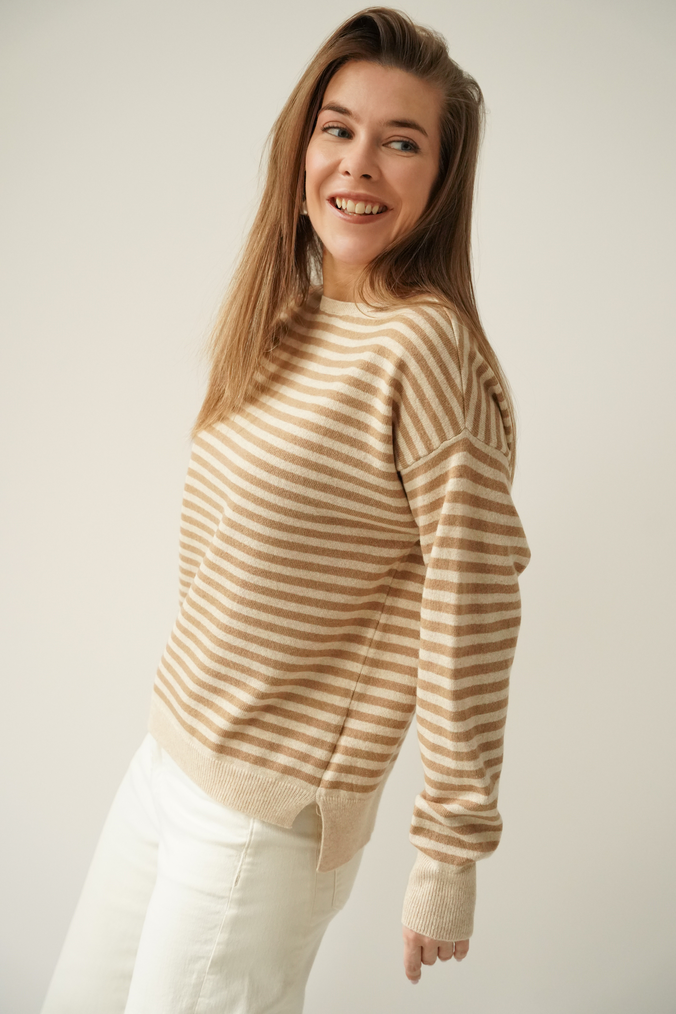 MAELLE to luźny, kobiecy sweter z lekko przedłużonym tyłem i bocznym rozcięciem. Wykonany z miękkiej mieszanki kaszmiru i wełny dziewiczej. Pastelowe paski i lekka gramatura czynią go idealnym wyborem na sezon wiosna–lato.