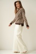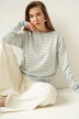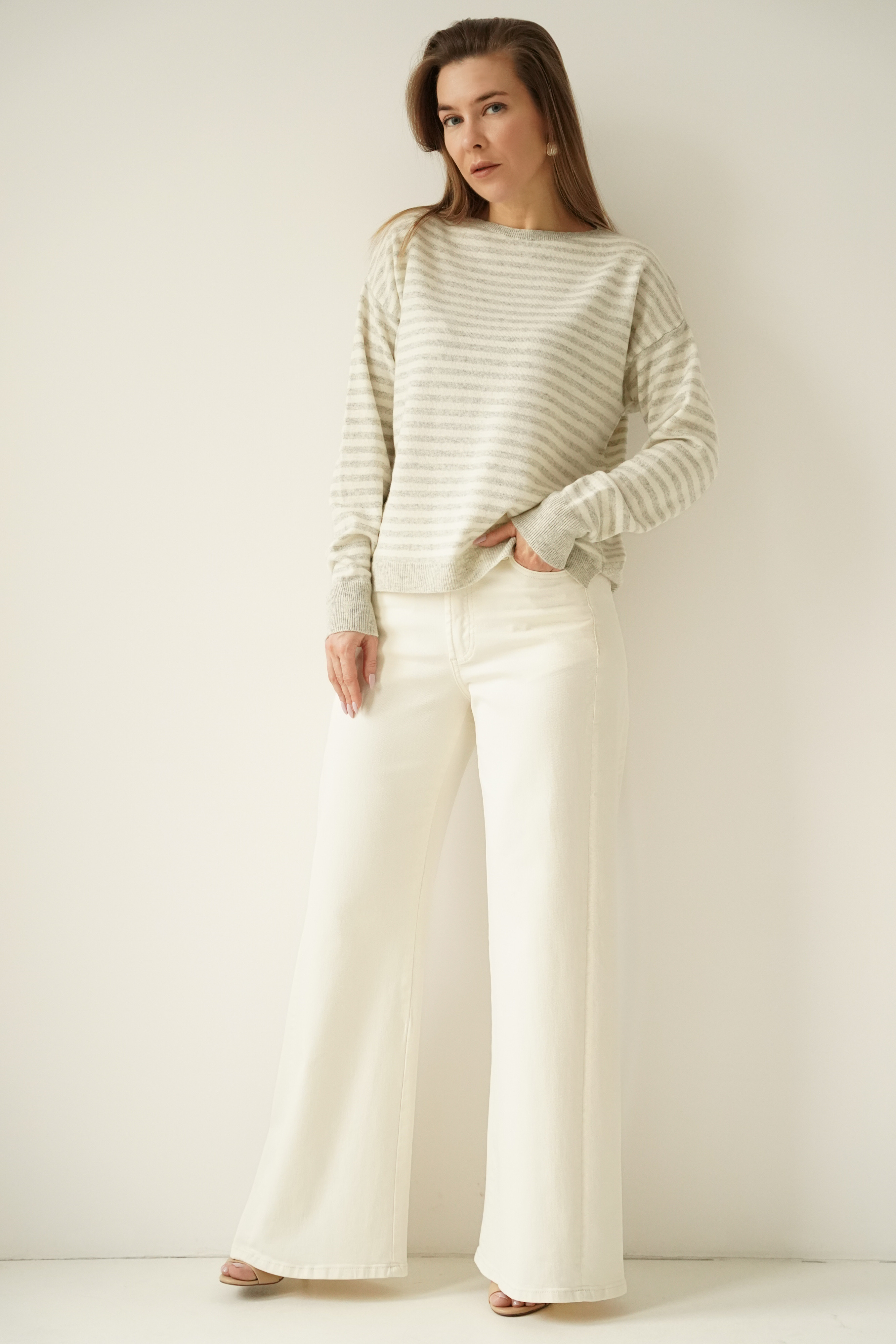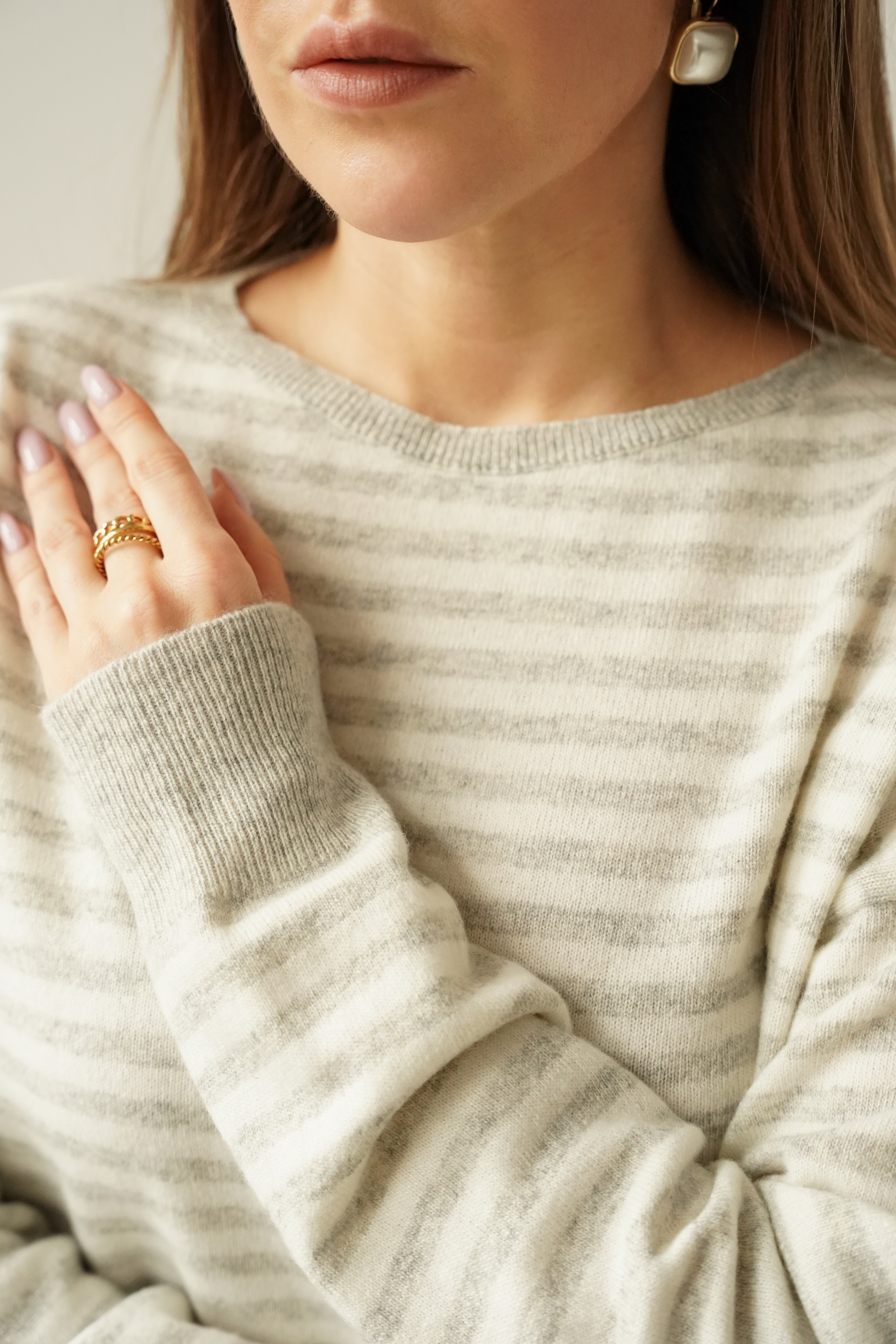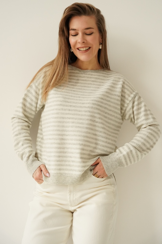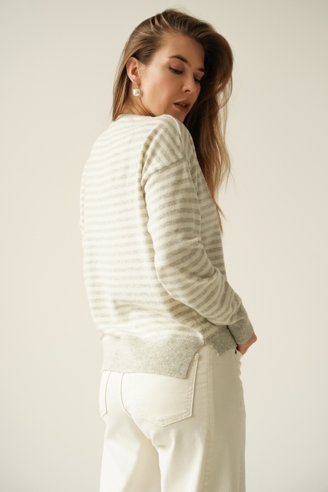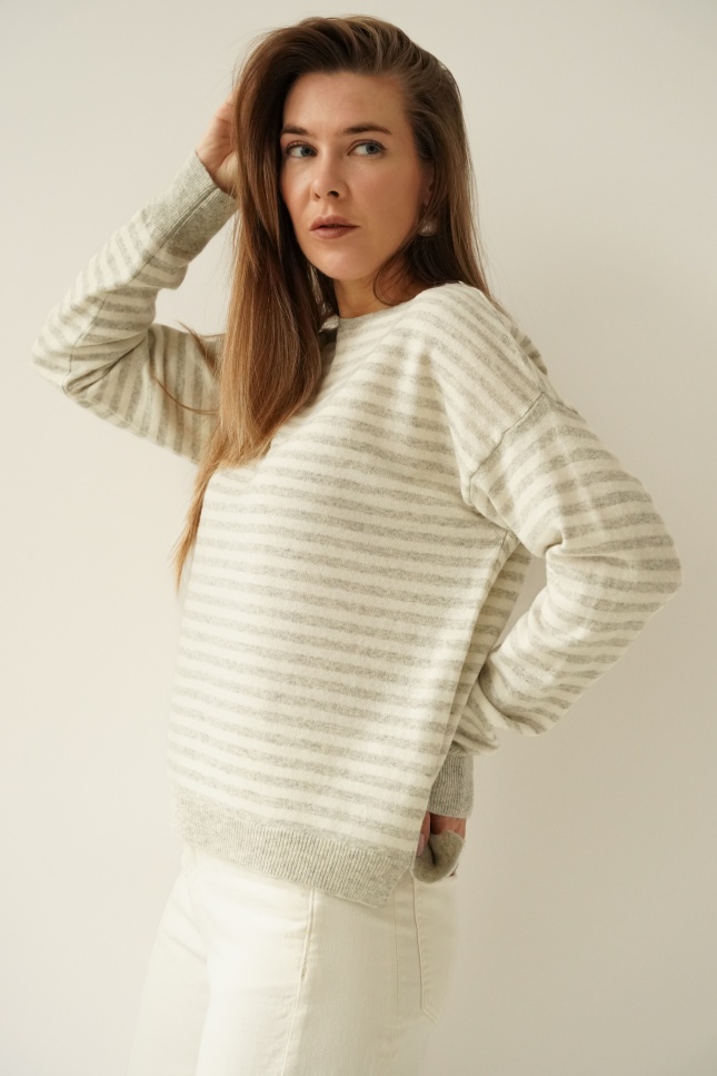 MAELLE to luźny, kobiecy sweter z lekko przedłużonym tyłem i bocznym rozcięciem. Wykonany z miękkiej mieszanki kaszmiru i wełny dziewiczej. Pastelowe paski i lekka gramatura czynią go idealnym wyborem na sezon wiosna–lato.