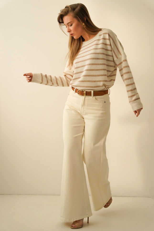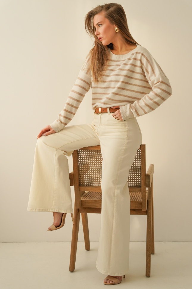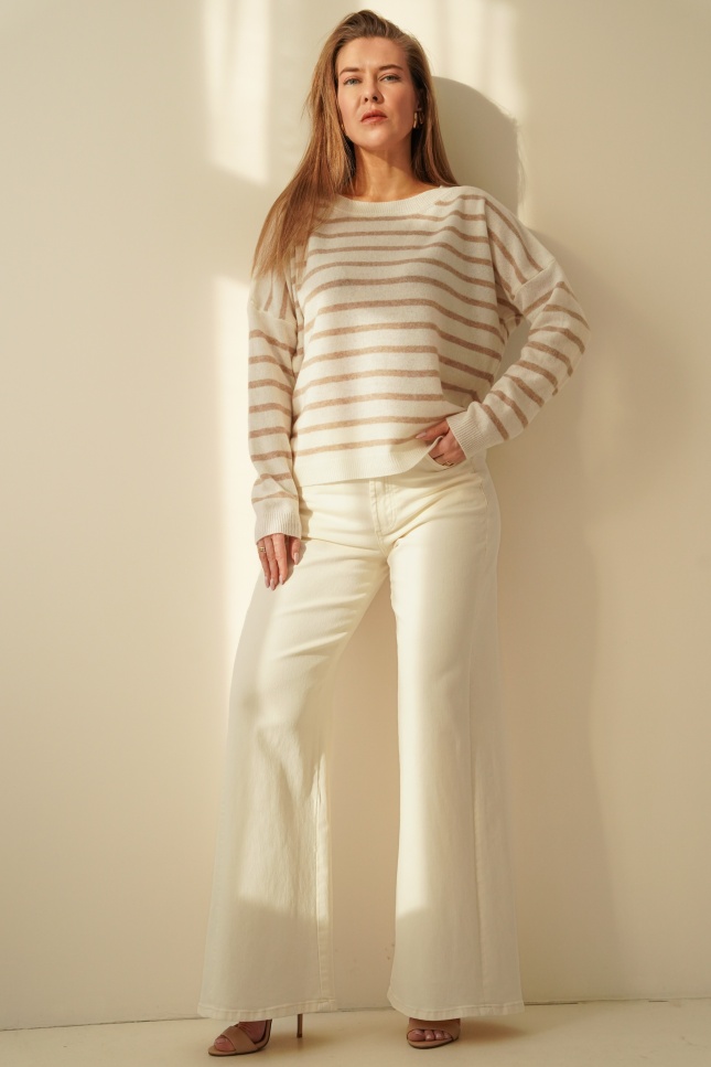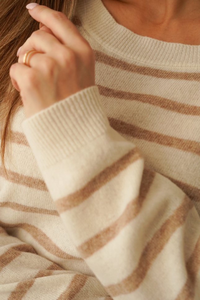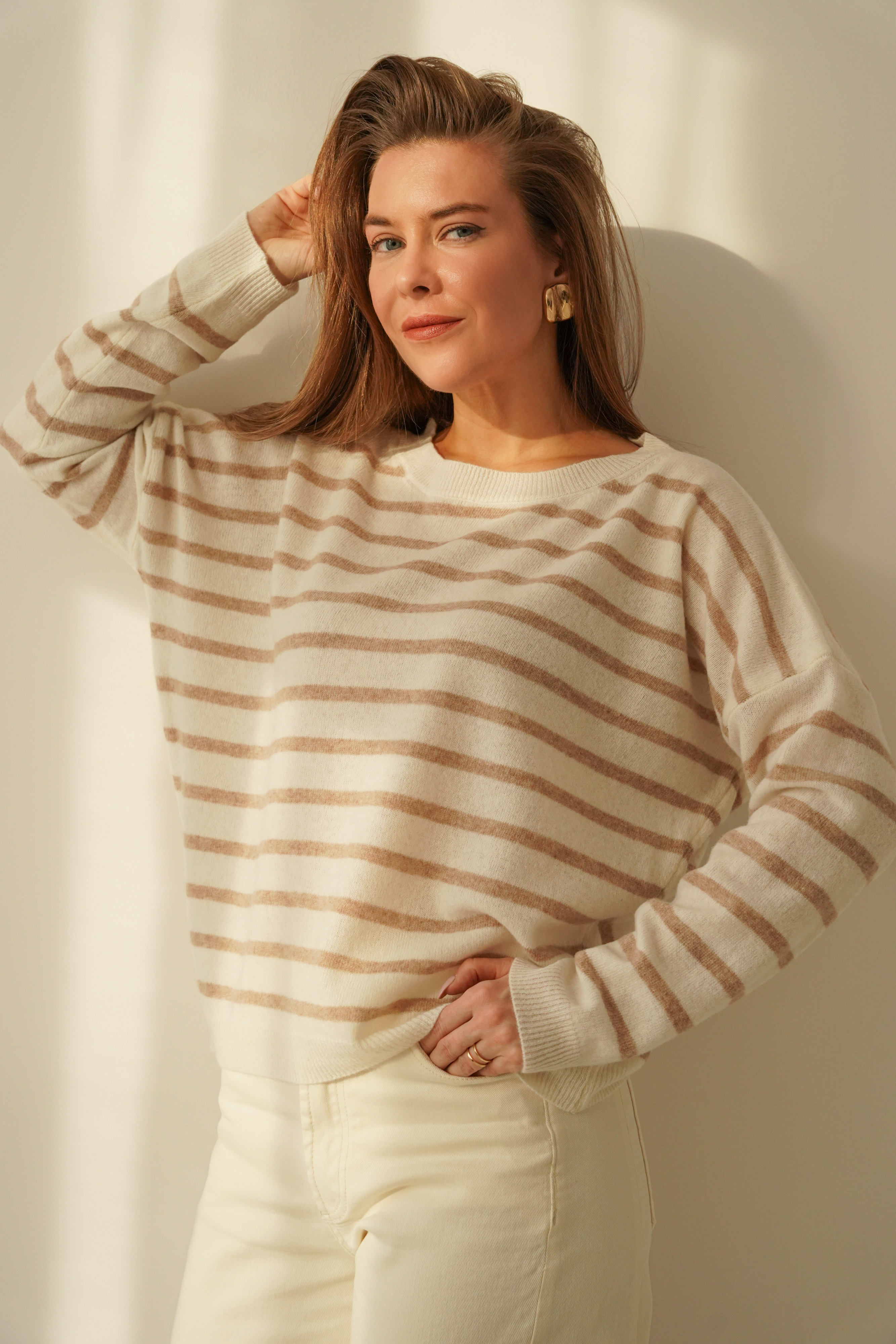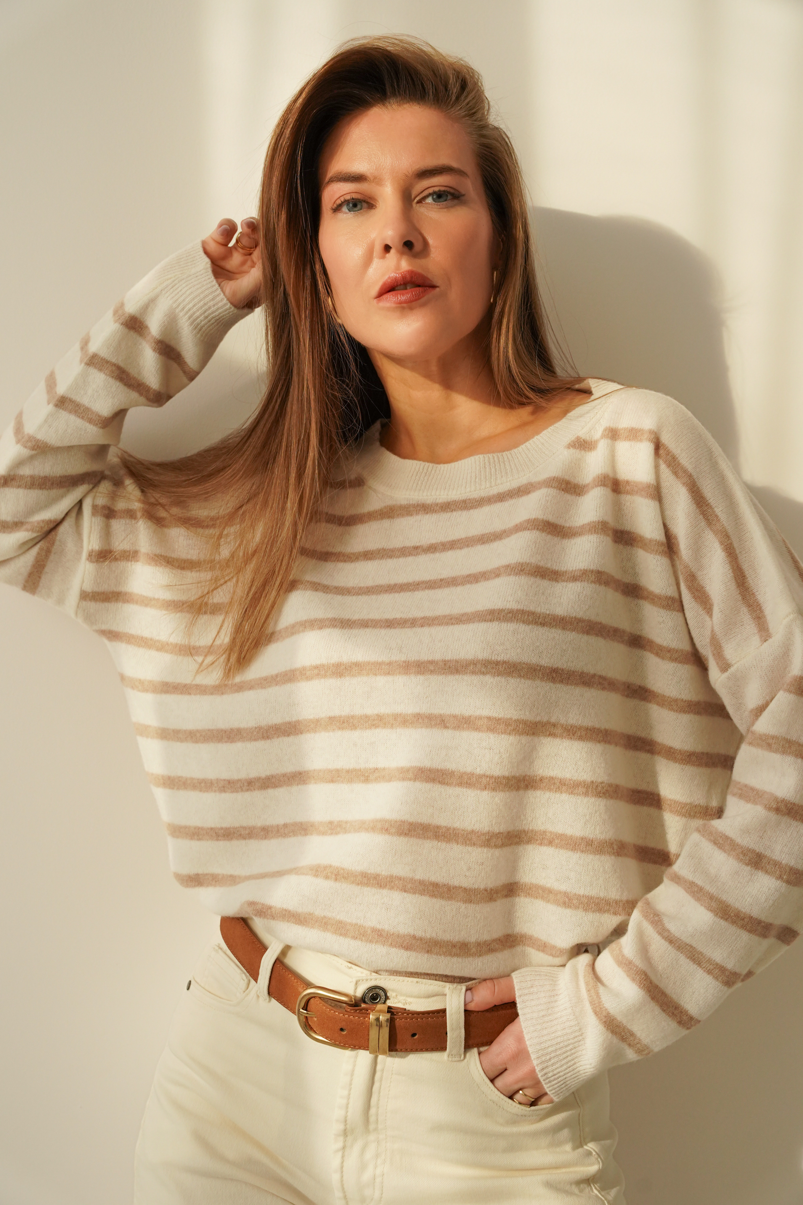 Klasyczny kobiecy sweter o luźniejszym kroju, wykonany z 100% wełny merino extra fine. Lekka dzianina idealna na sezon wiosna–lato. Pastelowe paski nadają mu subtelny, paryski charakter. Miękki, oddychający i przyjazny dla skóry.