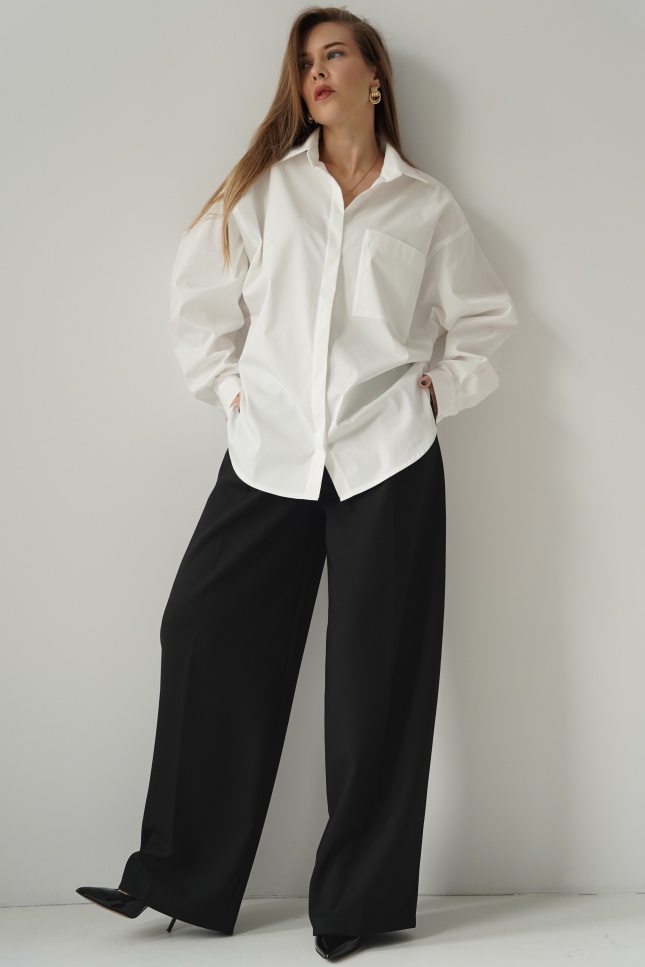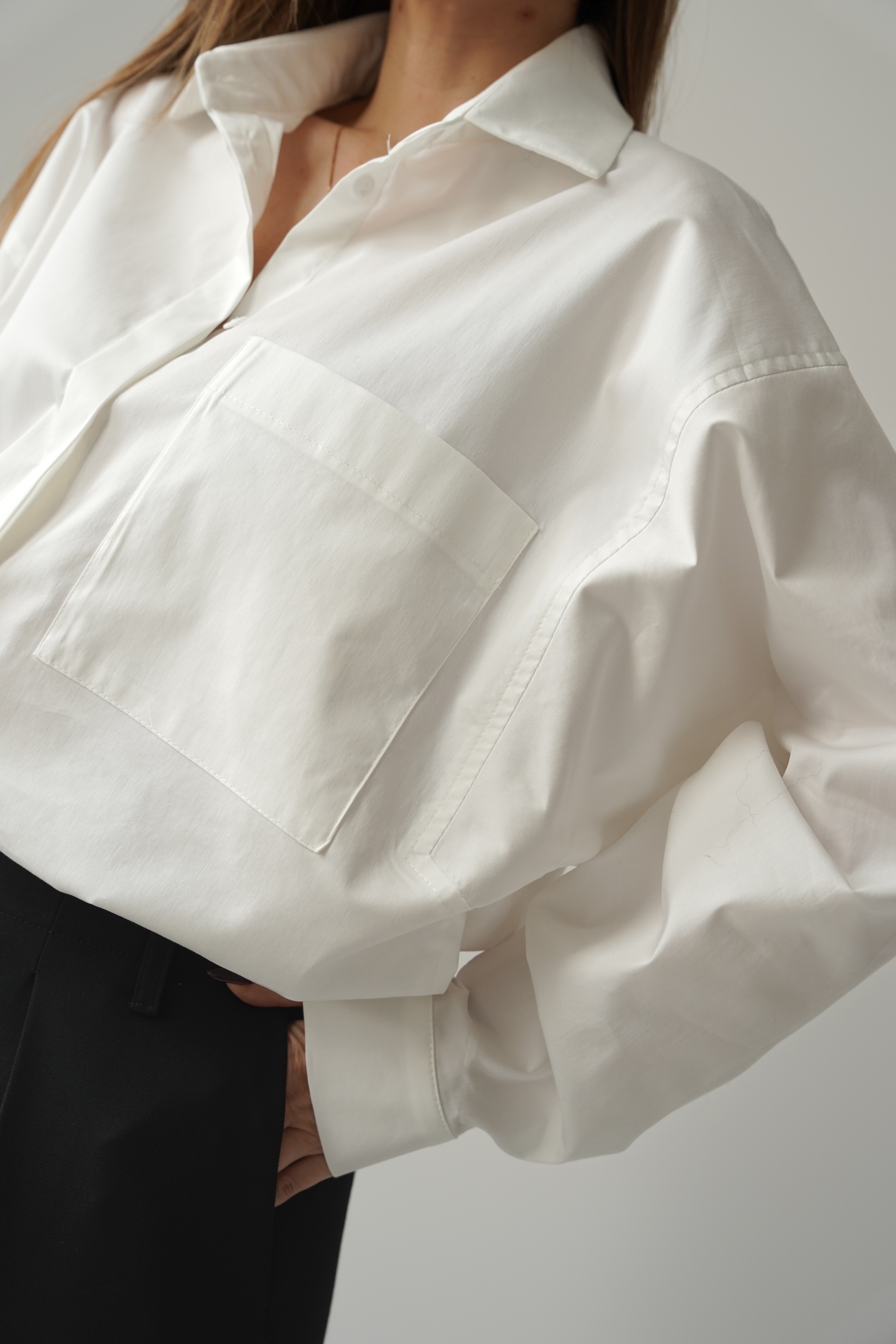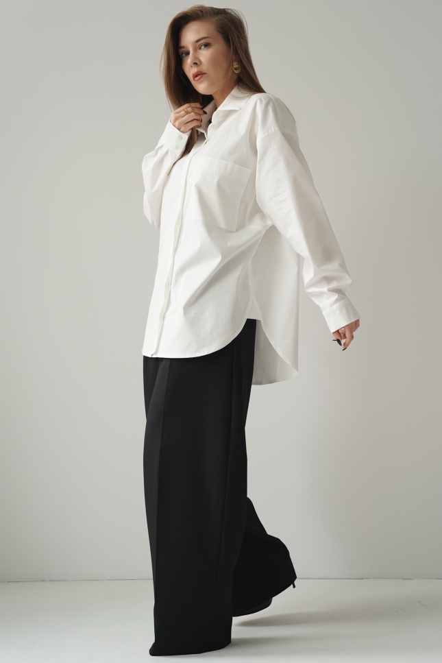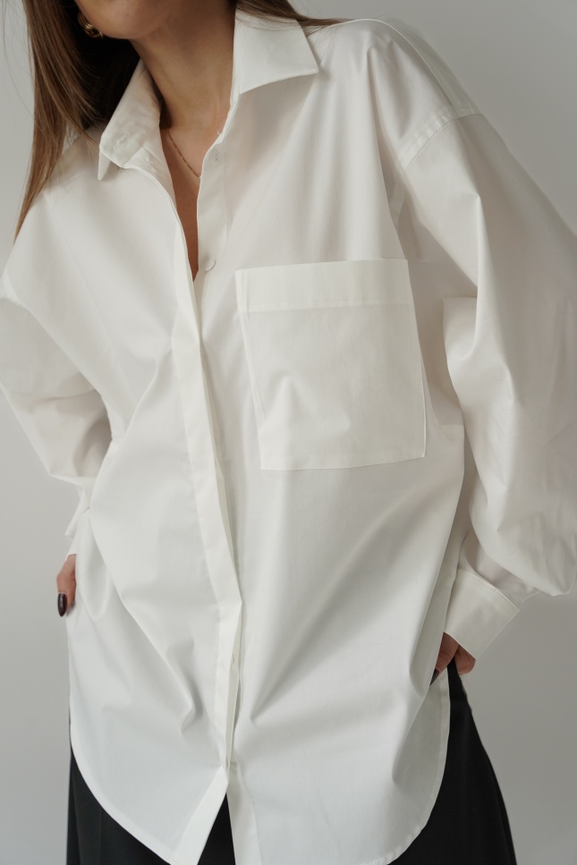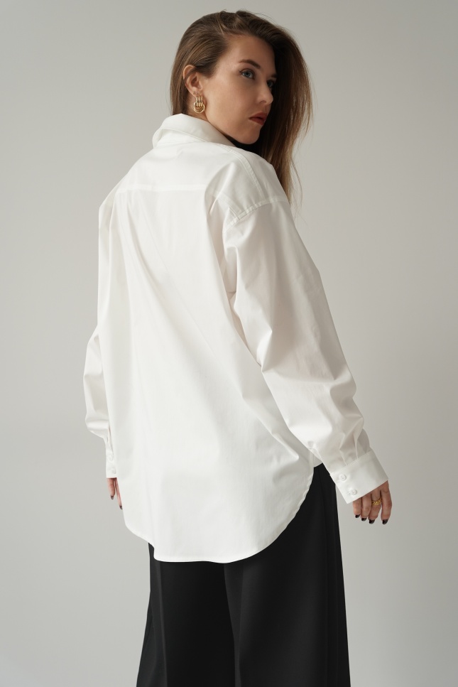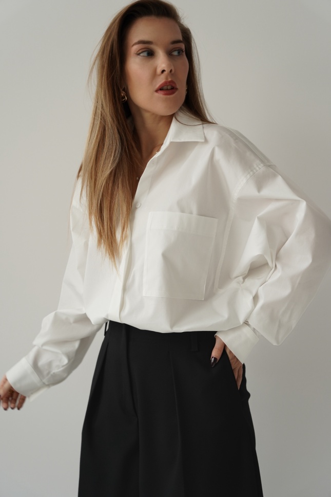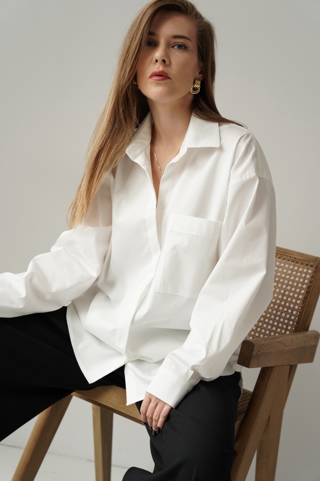„Celine” to elegancka, biała koszula o luźnym fasonie, uszyta z naturalnej mieszanki bawełny i wiskozy. Dopracowane detale – kołnierzyk, mankiety i kieszeń na linii biustu – nadają jej ponadczasowego charakteru. Miękka w dotyku i komfortowa w noszeniu, stanowi idealną bazę garderoby w duchu quiet luxury.