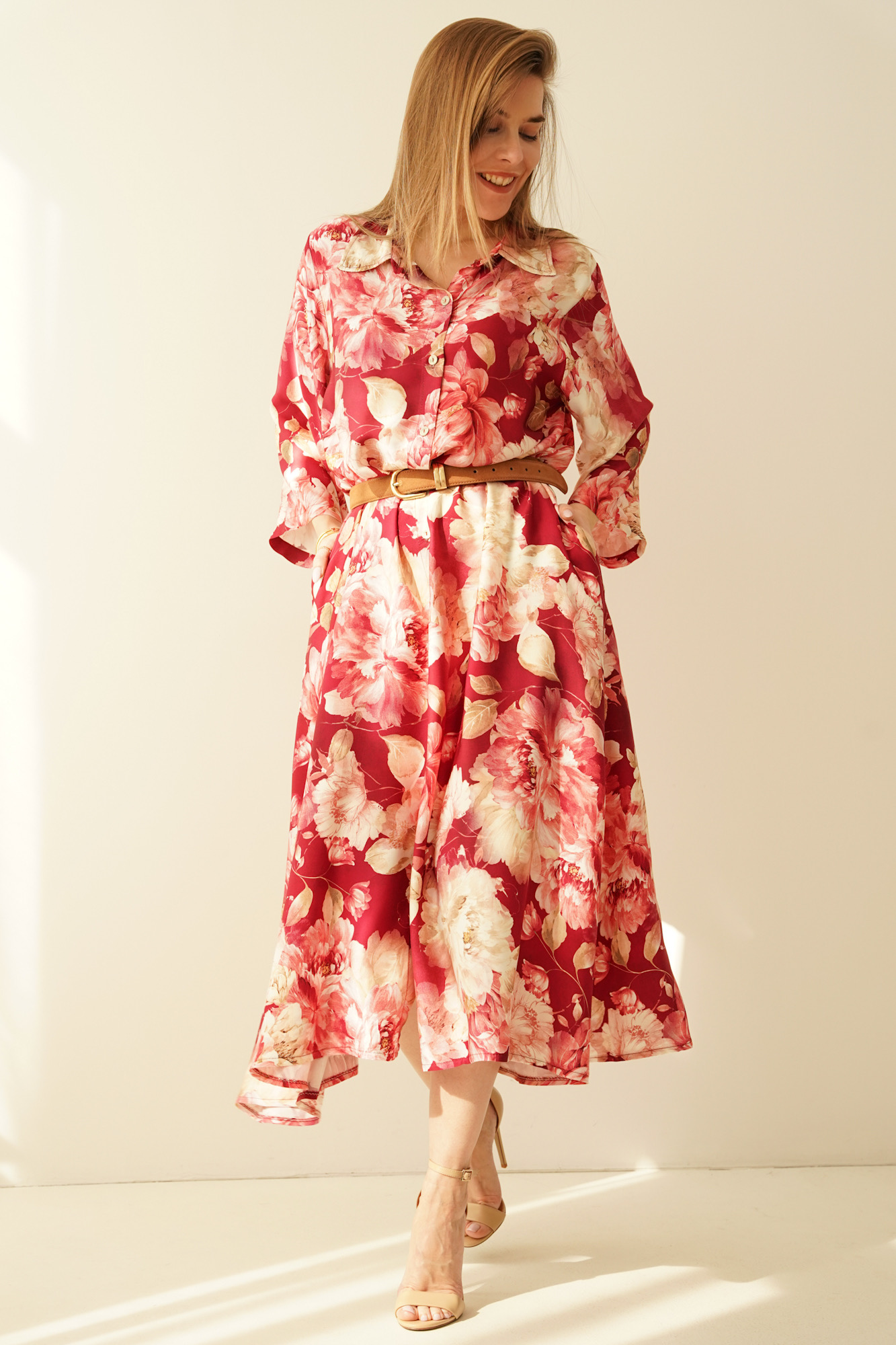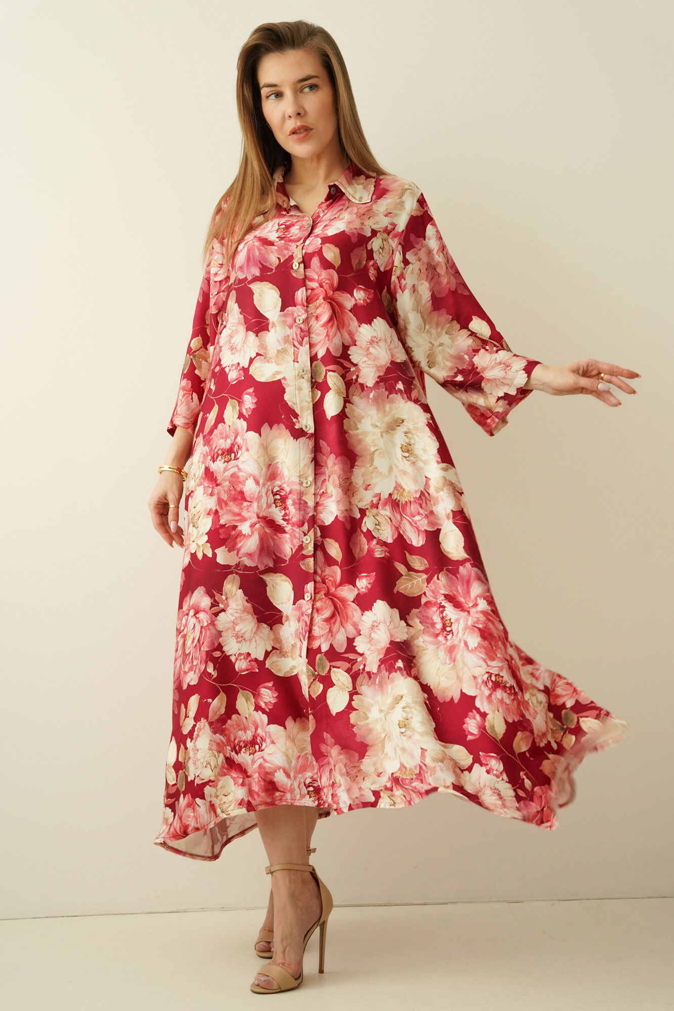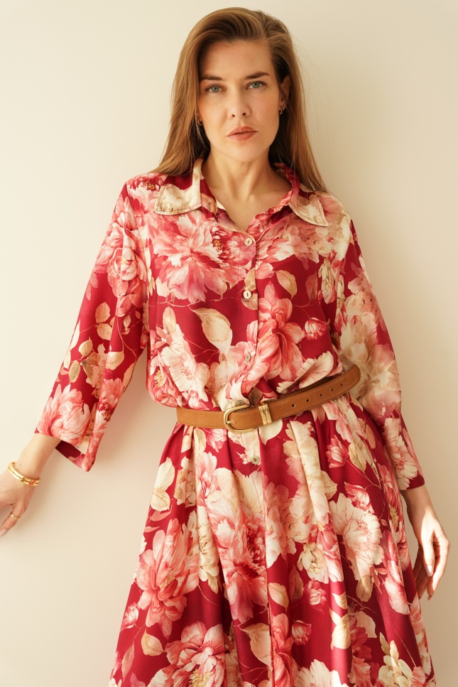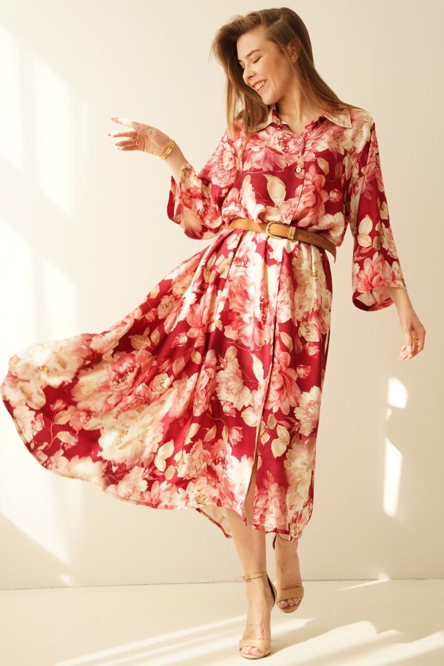 Luźna sukienka szmizjerka z domieszką jedwabiu Fiore marsala flowers