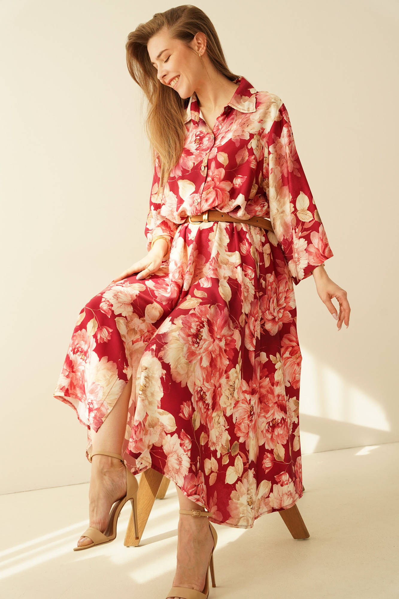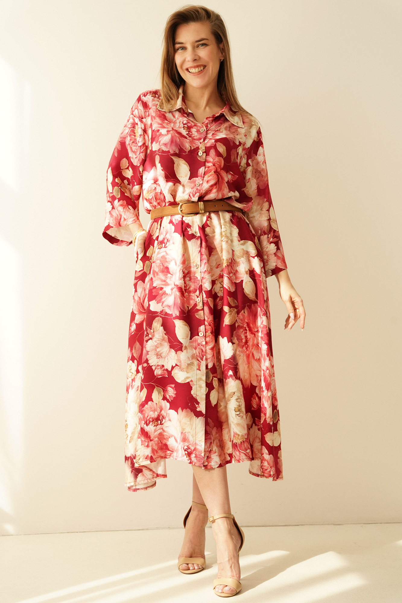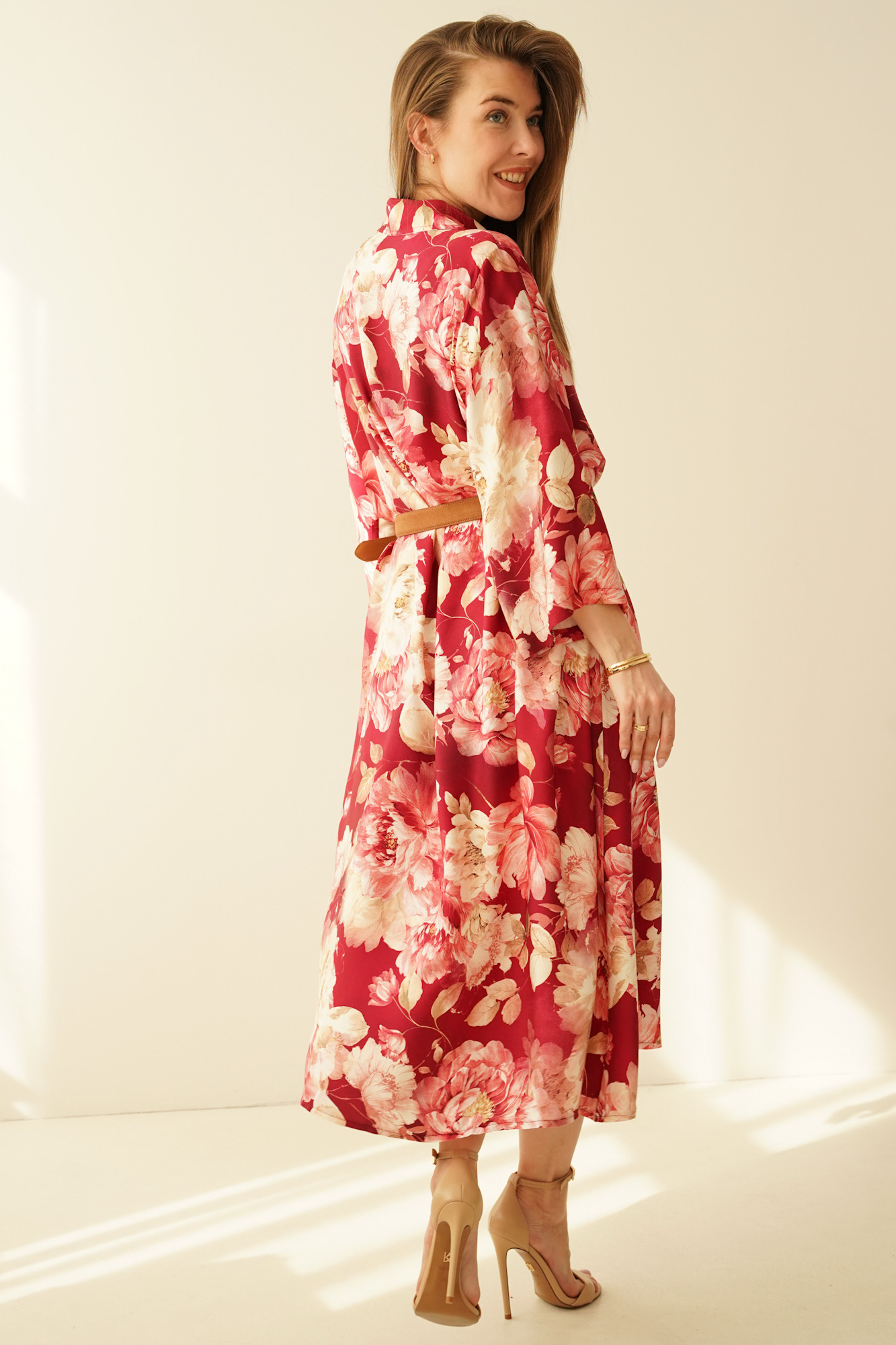 Luźna sukienka szmizjerka z domieszką jedwabiu Fiore marsala flowers