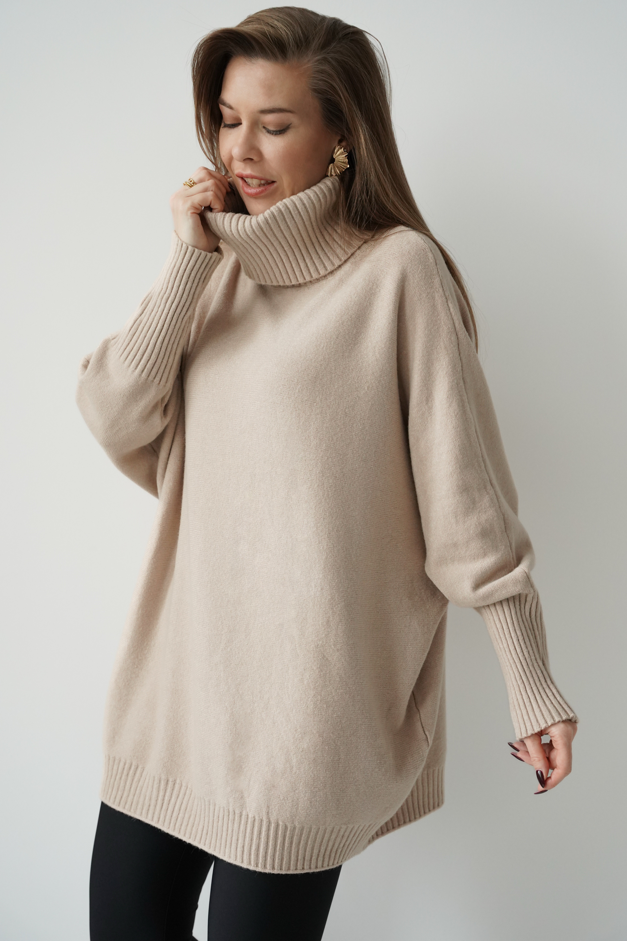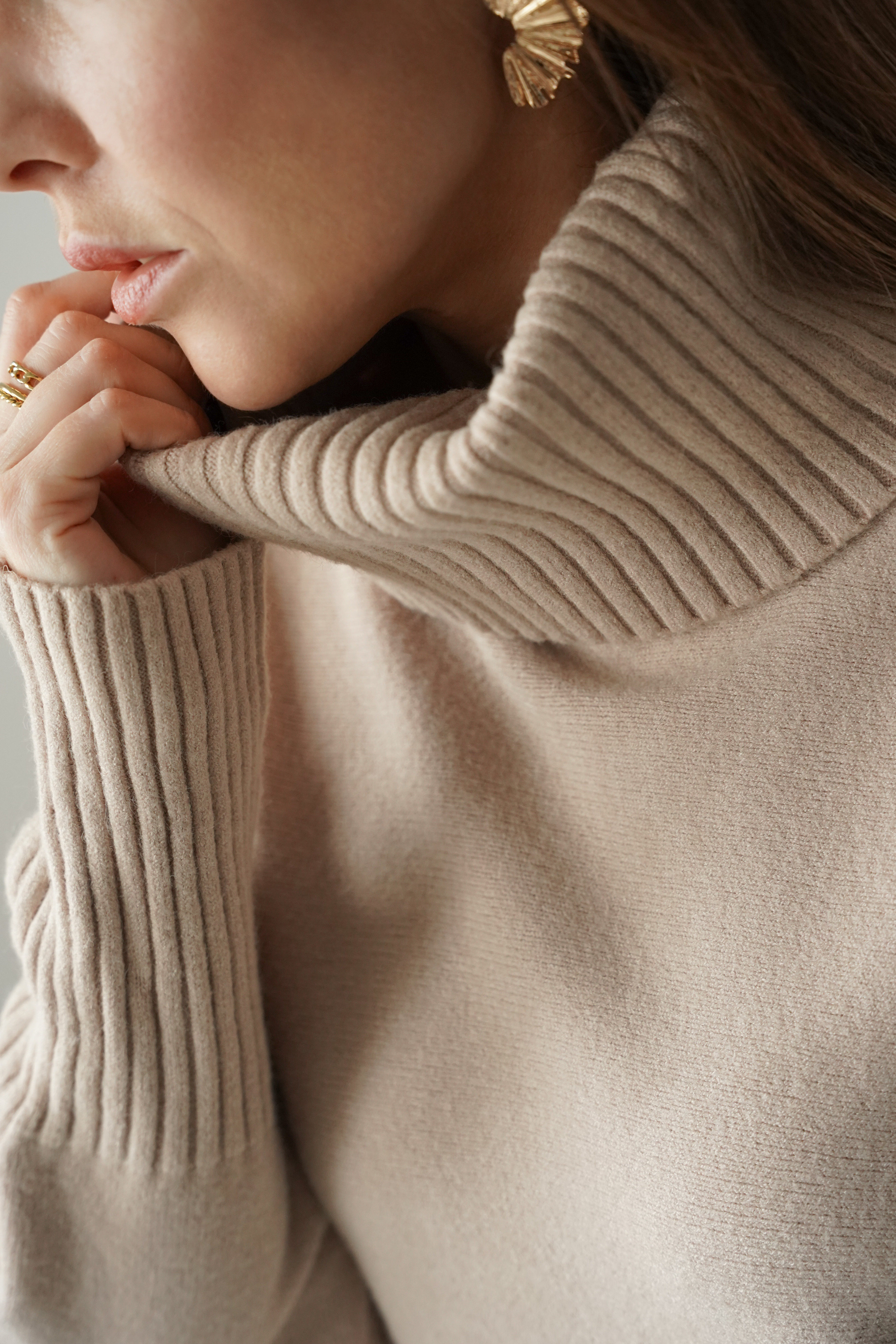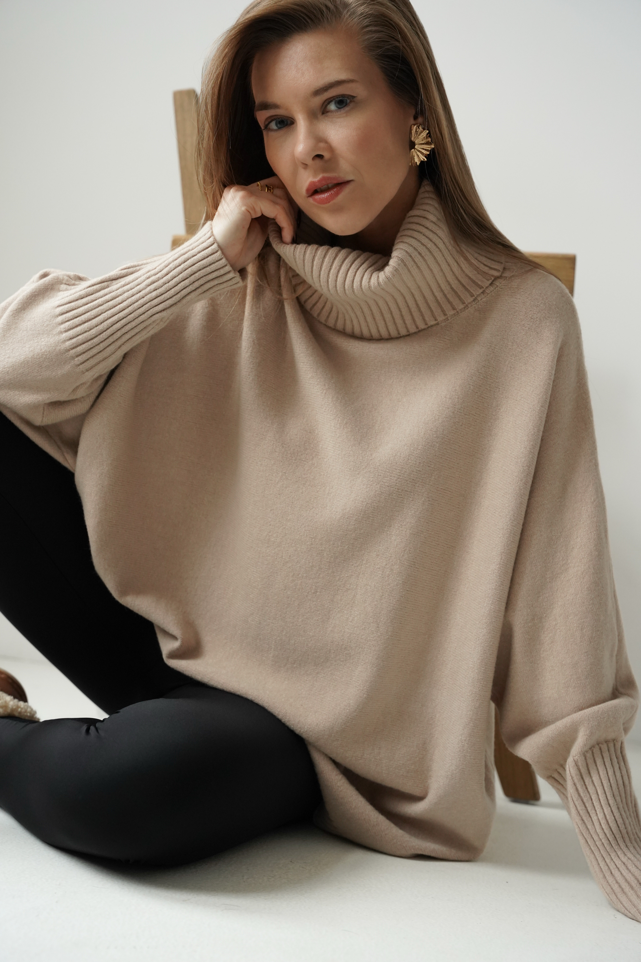 „Serene Cashmere” to oversizowy sweter z miękkiej, luksusowej przędzy (50% kaszmir, 40% wiskoza). Delikatny, ciepły i wyjątkowo przyjemny dla ciała. Wykończony golfem i subtelnymi ściągaczami. Ponadczasowy fason, idealny jako baza jesienno-zimowych stylizacji w duchu quiet luxury.