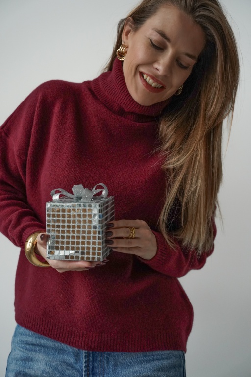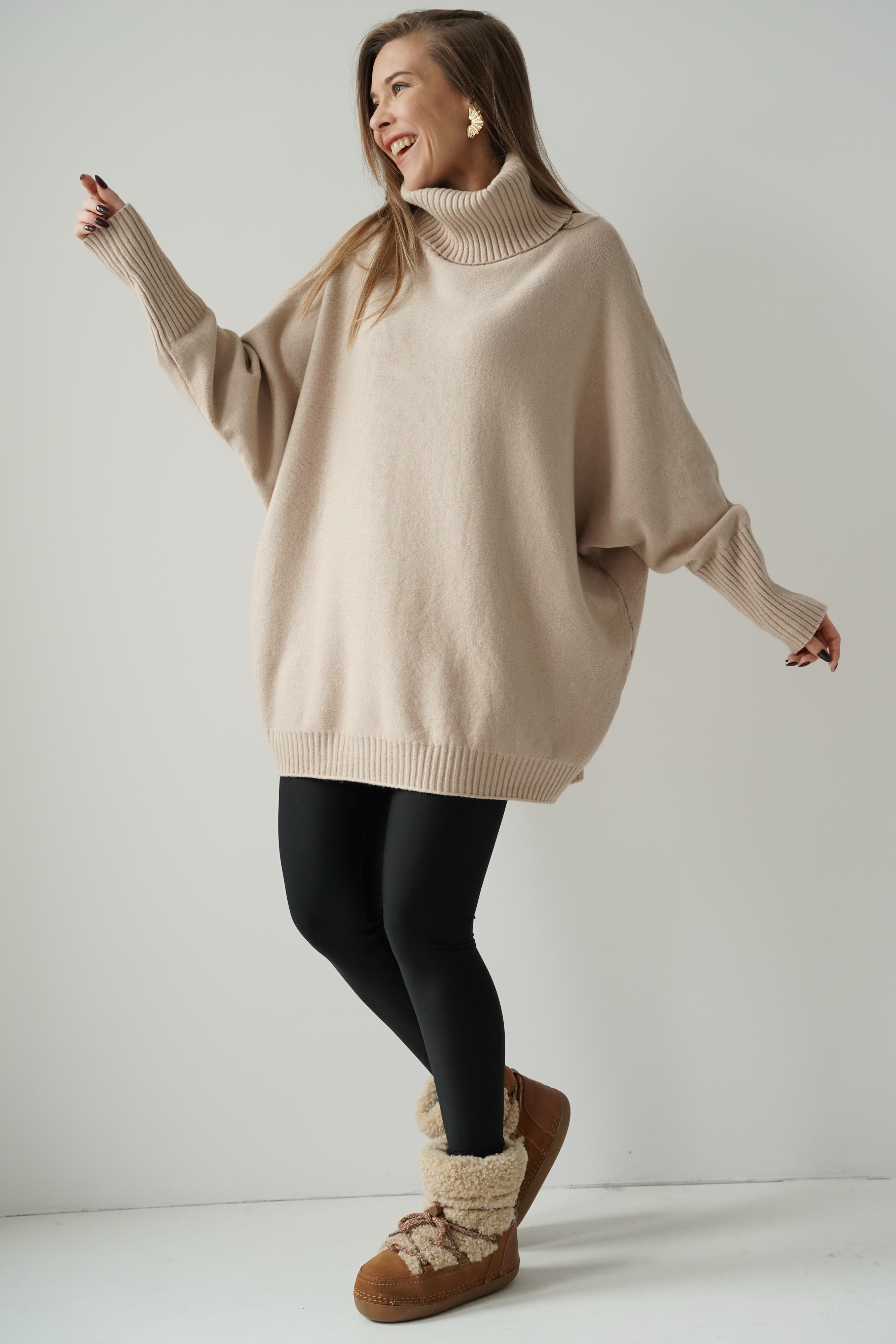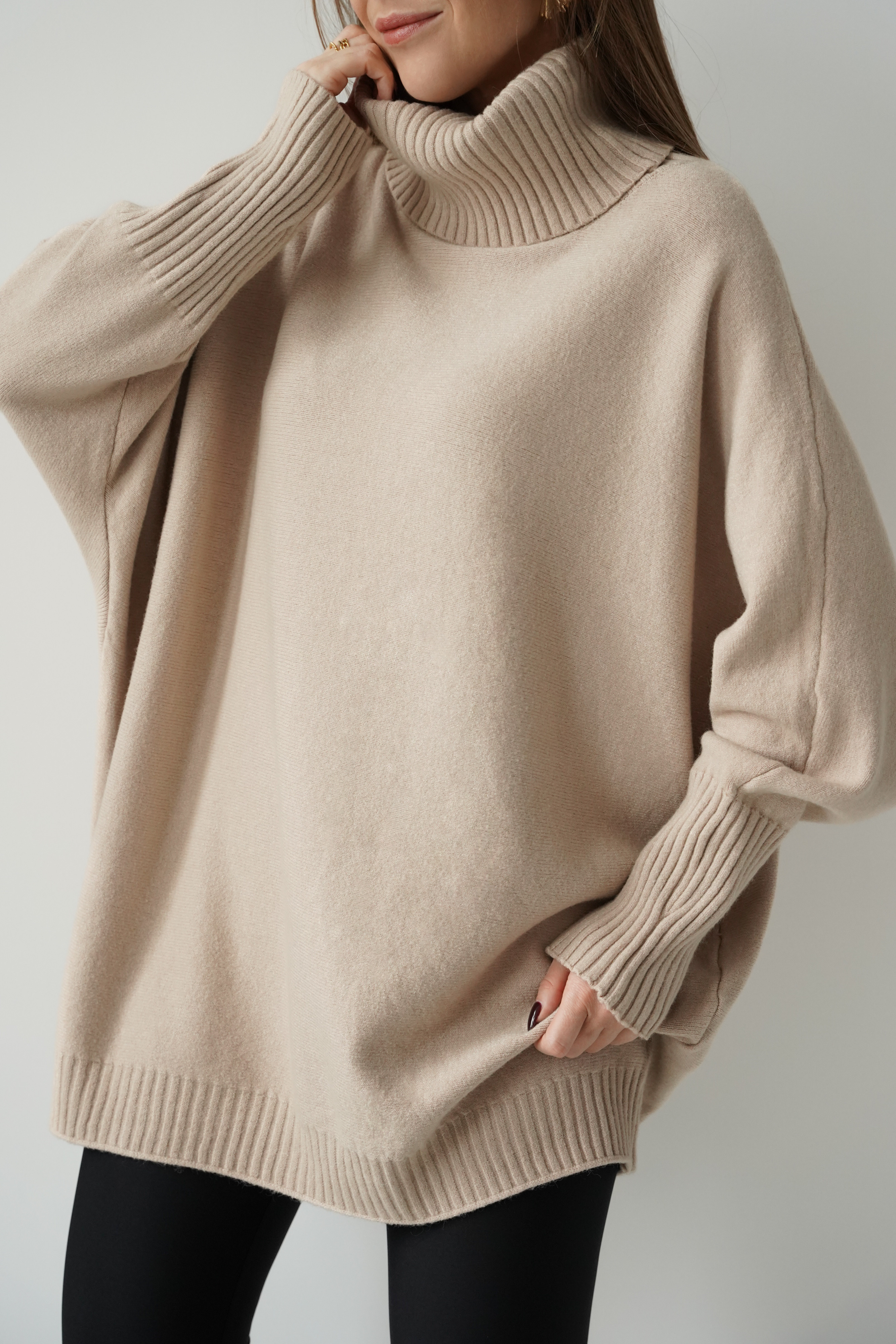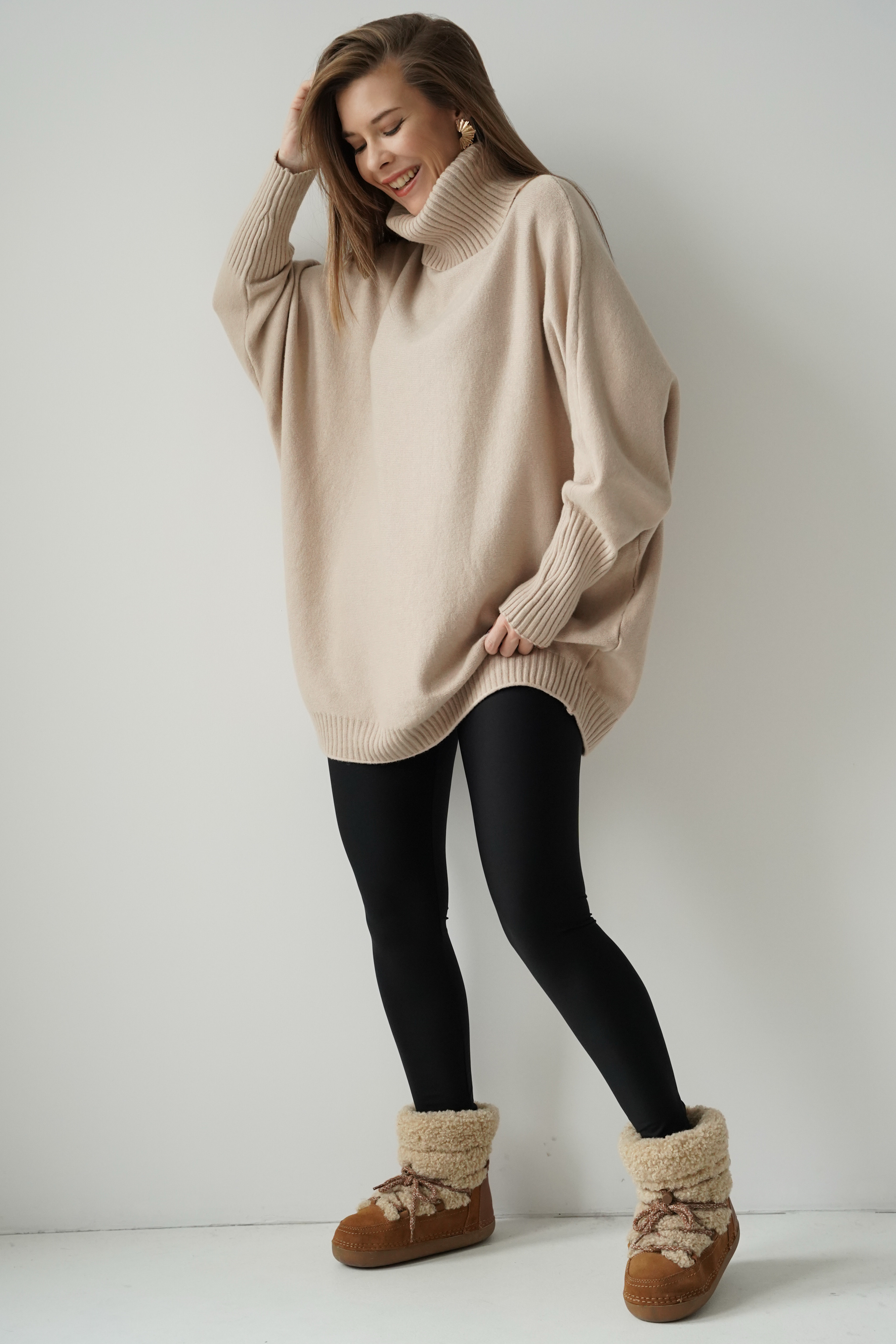 „Serene Cashmere” to oversizowy sweter z miękkiej, luksusowej przędzy (50% kaszmir, 40% wiskoza). Delikatny, ciepły i wyjątkowo przyjemny dla ciała. Wykończony golfem i subtelnymi ściągaczami. Ponadczasowy fason, idealny jako baza jesienno-zimowych stylizacji w duchu quiet luxury.