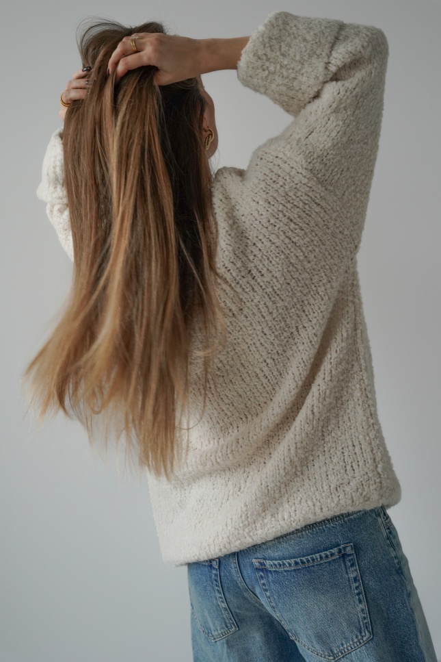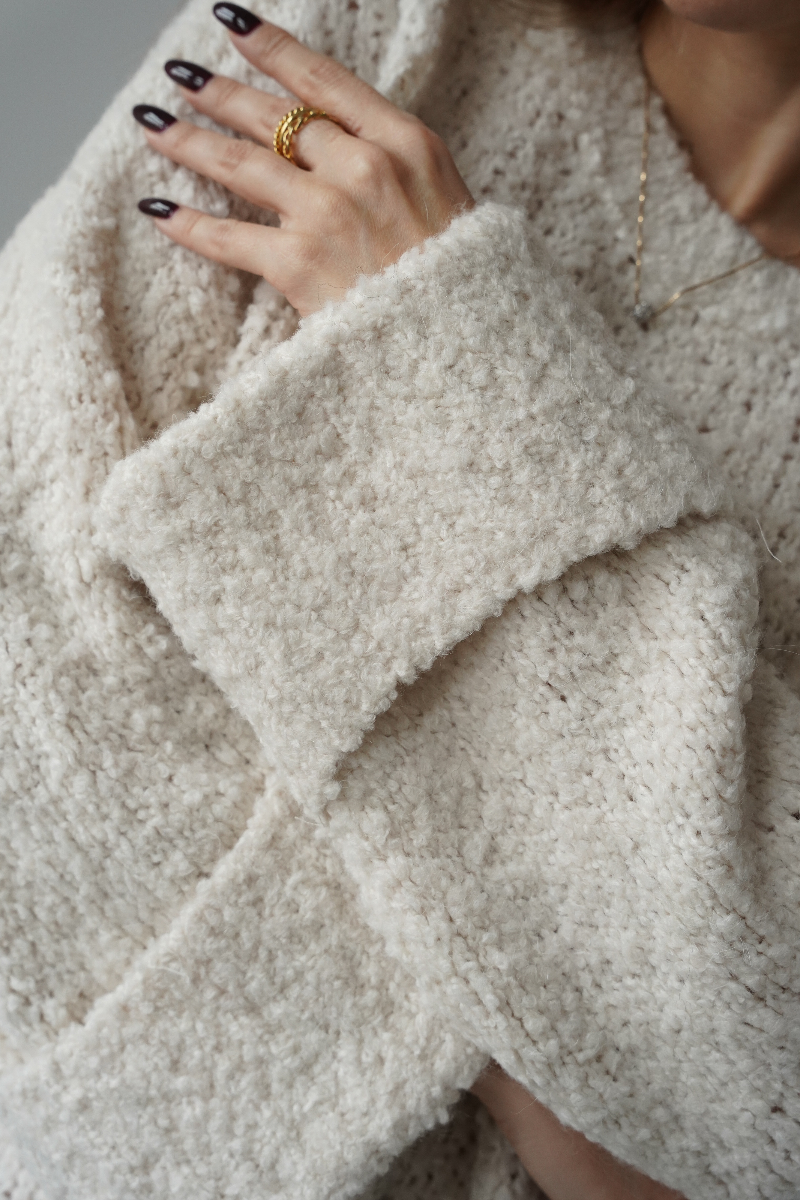 „NORDEN” to oversize’owy sweter o dłuższym kroju, wykonany z unikatowej przędzy typu bouclé, która nadaje mu puszystości i miękkości. Jego podwijane rękawy zakończone mankietem dodają nonszalancji i lekkości. To model inspirowany skandynawskim minimalizmem – ciepły, wygodny i pełen subtelnej elegancji. Idealny do noszenia na co dzień, w duchu quiet luxury.