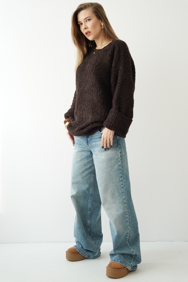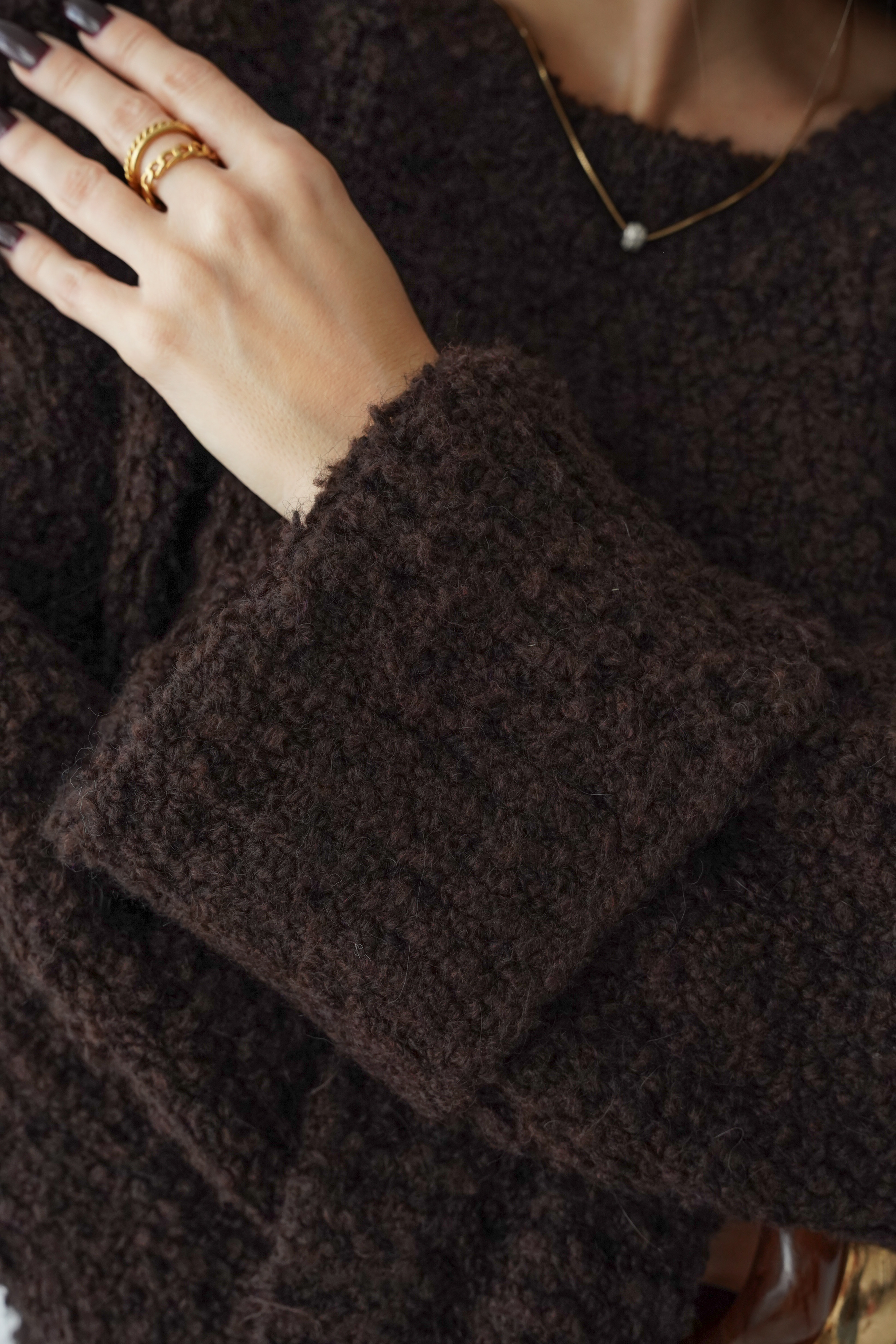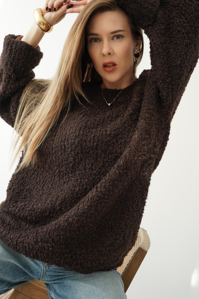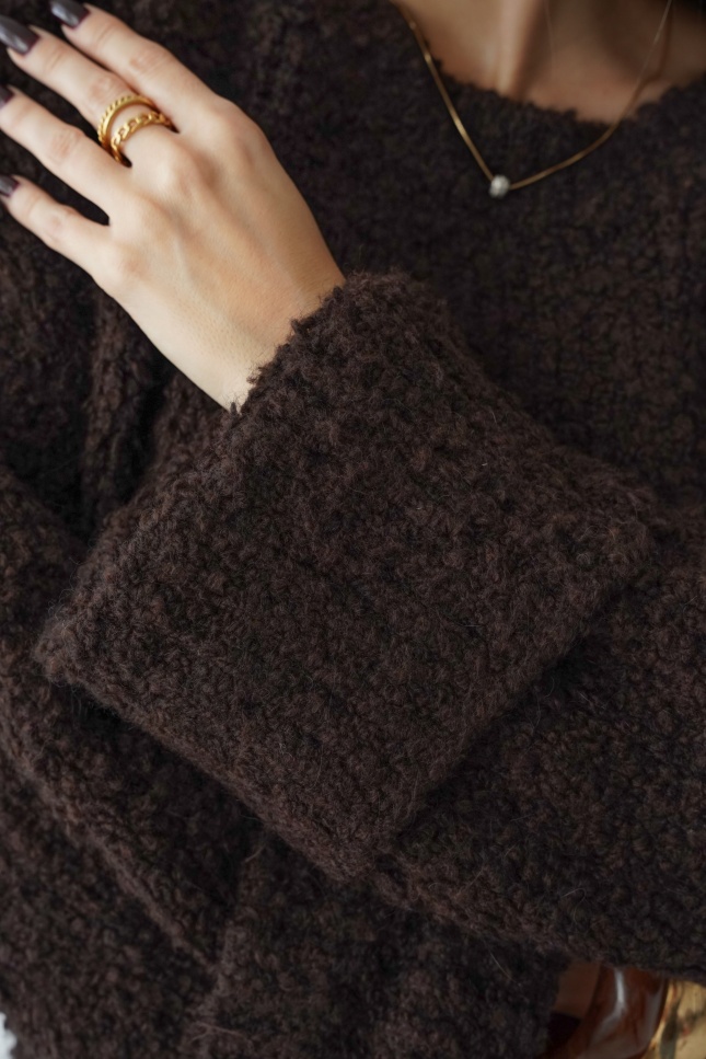 „NORDEN” to oversize’owy sweter o dłuższym kroju, wykonany z unikatowej przędzy typu bouclé, która nadaje mu puszystości i miękkości. Jego podwijane rękawy zakończone mankietem dodają nonszalancji i lekkości. To model inspirowany skandynawskim minimalizmem – ciepły, wygodny i pełen subtelnej elegancji. Idealny do noszenia na co dzień, w duchu quiet luxury.