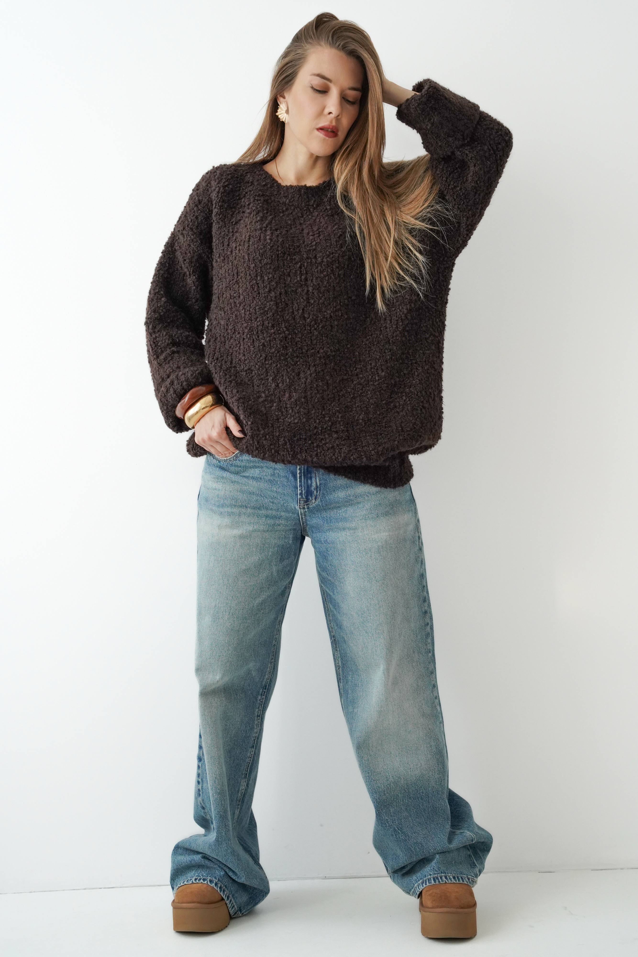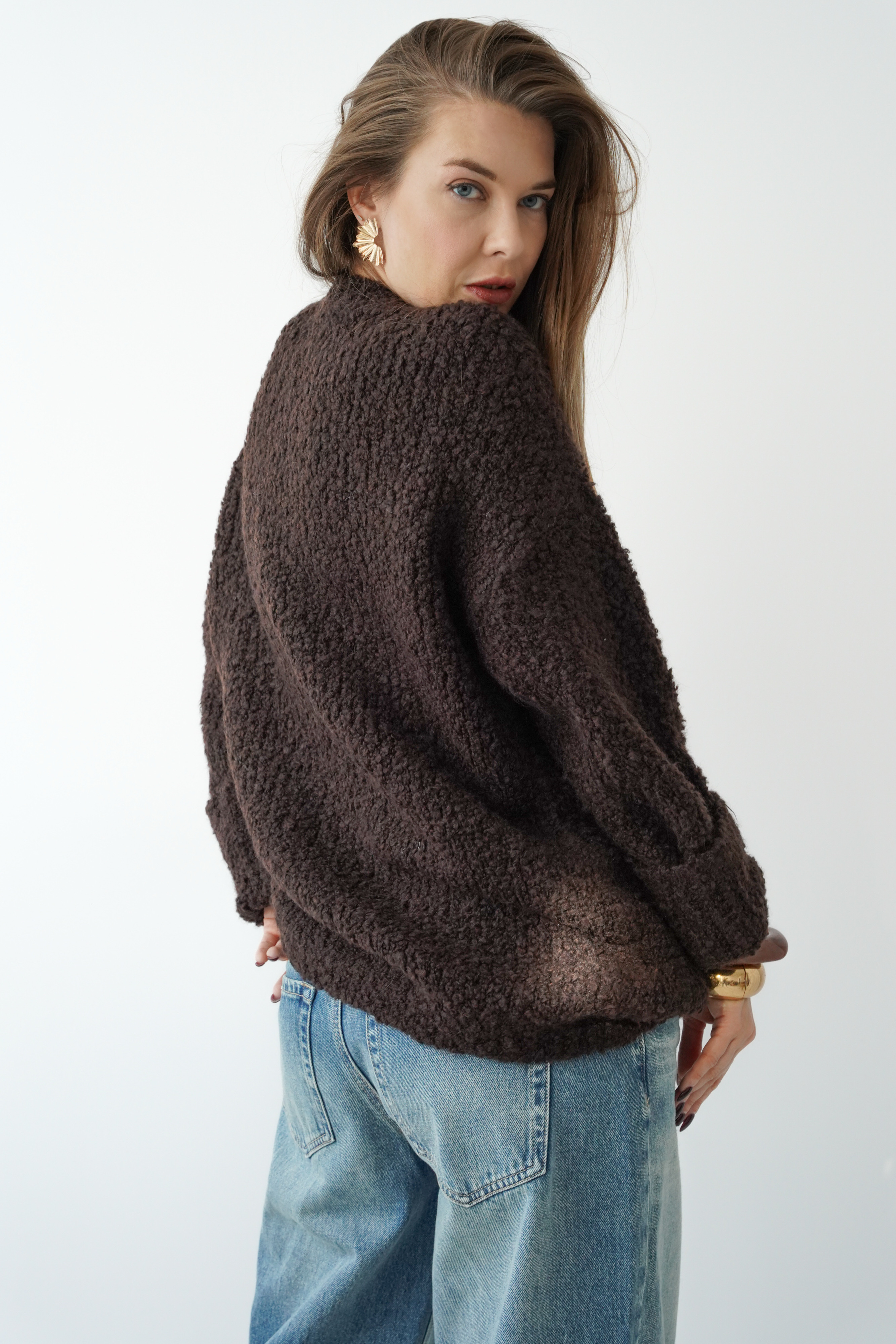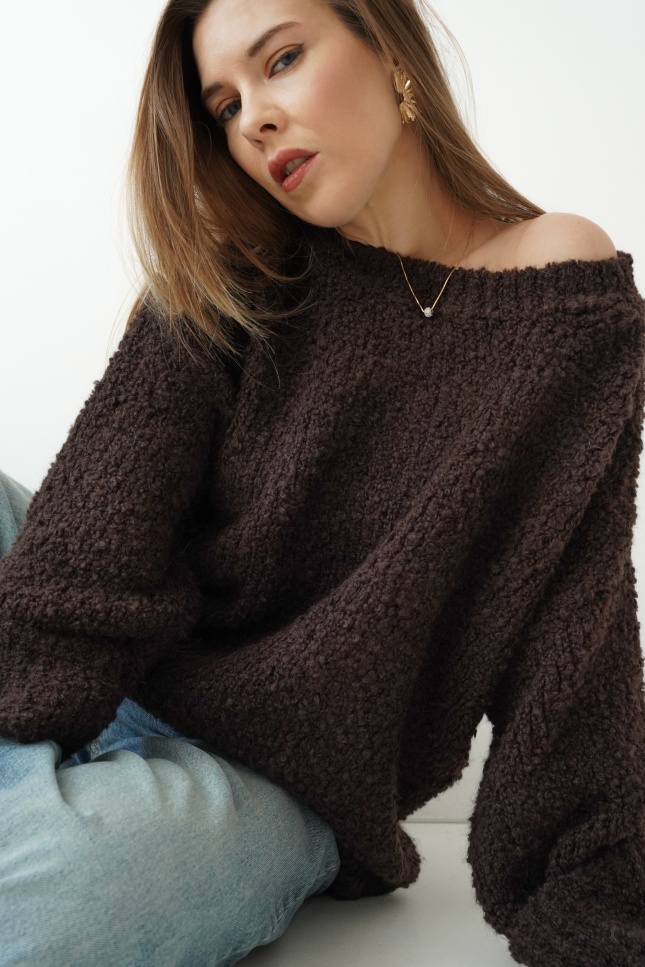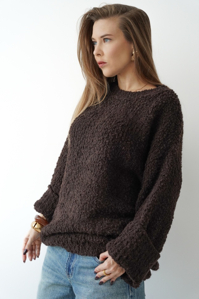 „NORDEN” to oversize’owy sweter o dłuższym kroju, wykonany z unikatowej przędzy typu bouclé, która nadaje mu puszystości i miękkości. Jego podwijane rękawy zakończone mankietem dodają nonszalancji i lekkości. To model inspirowany skandynawskim minimalizmem – ciepły, wygodny i pełen subtelnej elegancji. Idealny do noszenia na co dzień, w duchu quiet luxury.