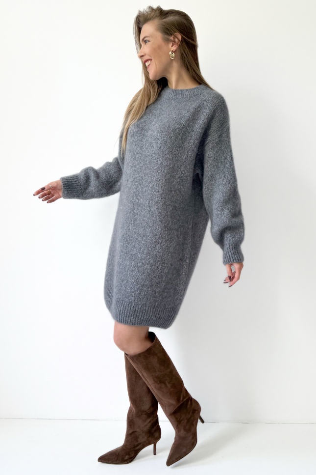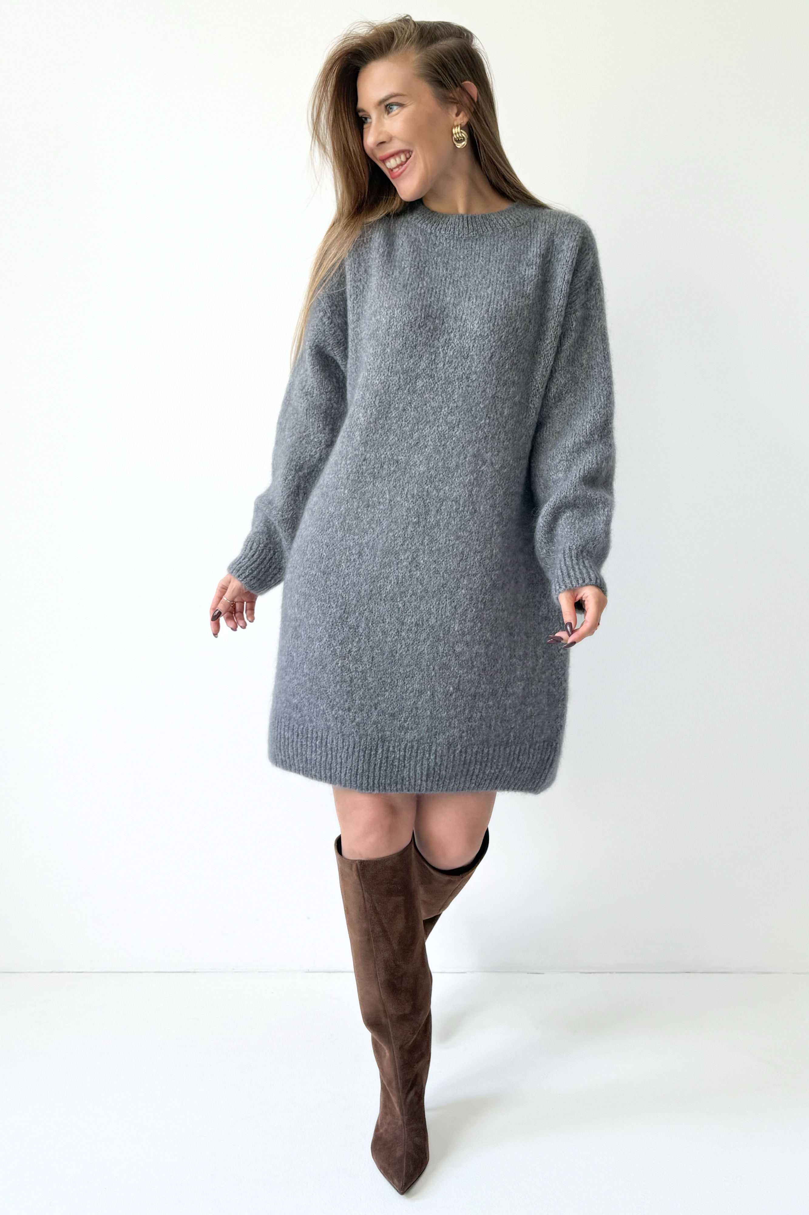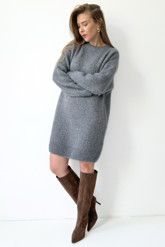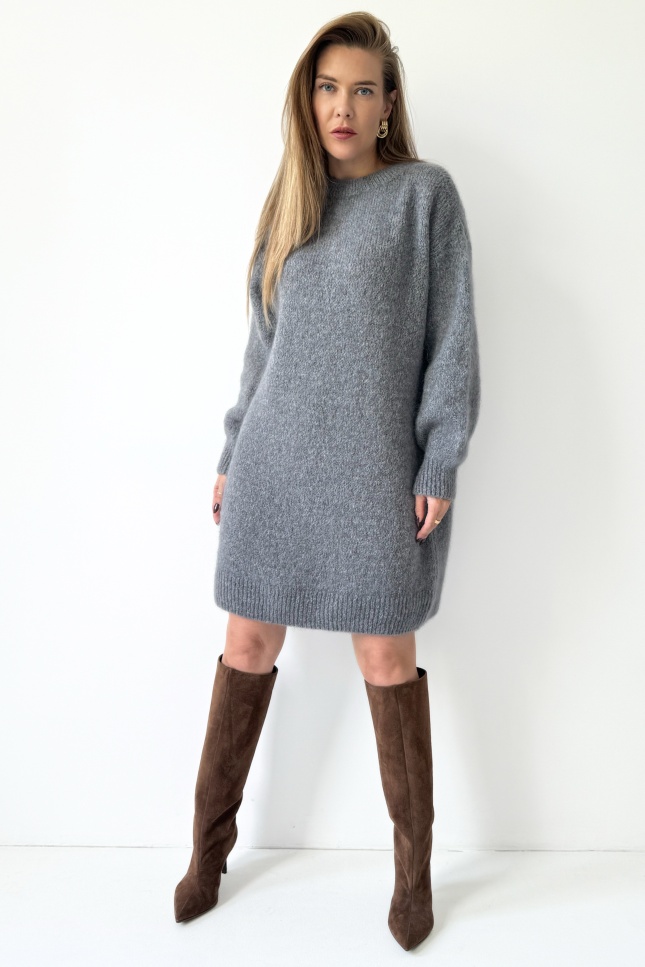 „Sophia” to puszysta, miękka sukienka z naturalnej przędzy z dodatkiem kid moheru i moheru, którą możesz nosić także jako tunikę. Luźny, kobiecy krój zapewnia swobodę i komfort, a subtelna faktura włókien dodaje jej wyjątkowej lekkości. Idealna na chłodniejsze dni – otula, nie tracąc elegancji.
