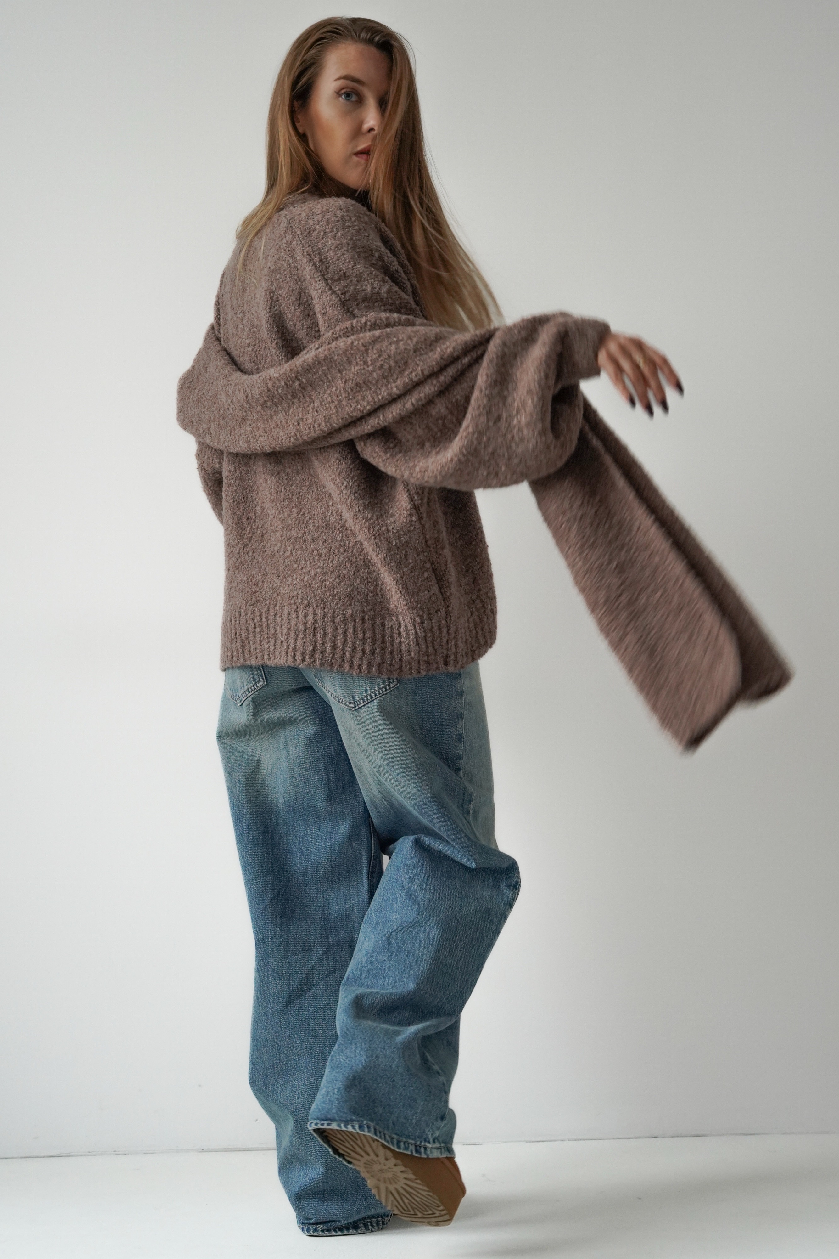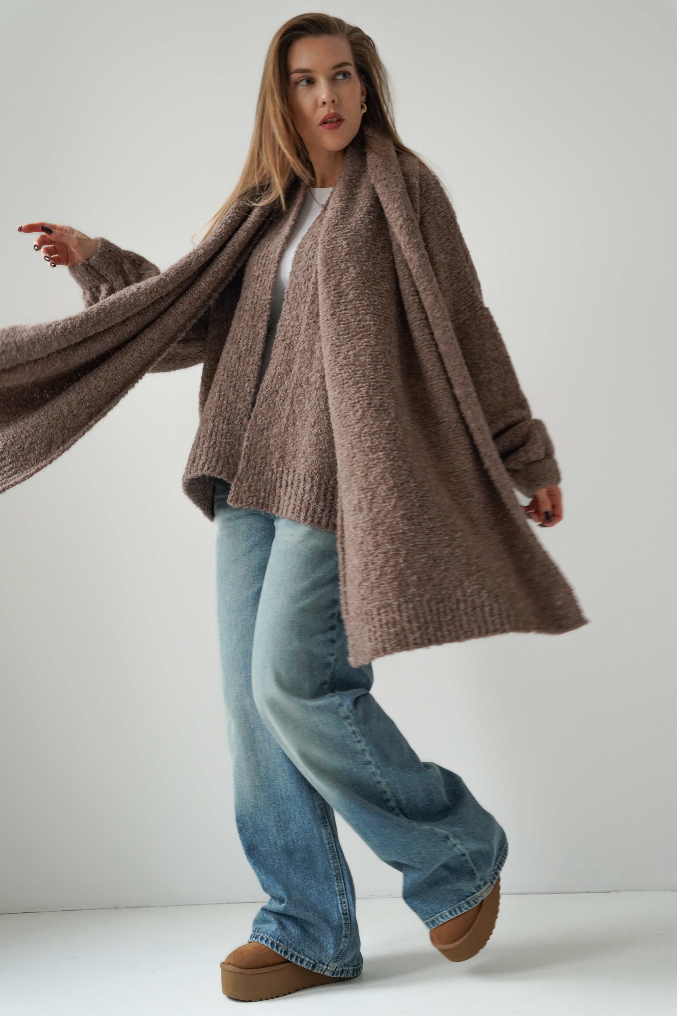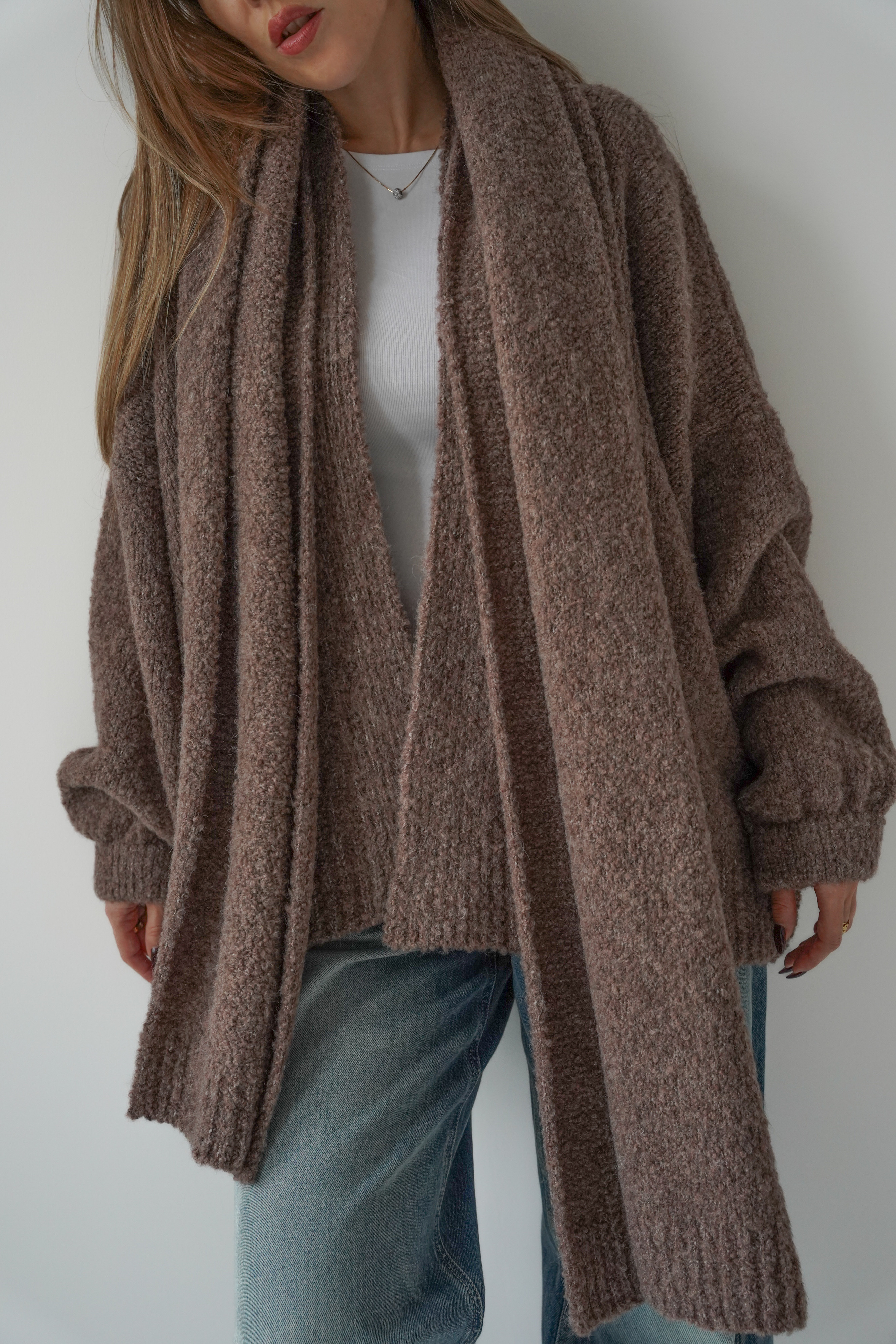 Miękki kardigan o klasycznym, luźniejszym kroju, wykonany z przyjemnej w dotyku dzianiny. W komplecie szeroki szal, który możesz wiązać na różne sposoby, tworząc stylizacje w duchu nowoczesnego komfortu. „Noa” łączy prostotę, elegancję i ciepło – idealny wybór na sezon AW 2025/26.
