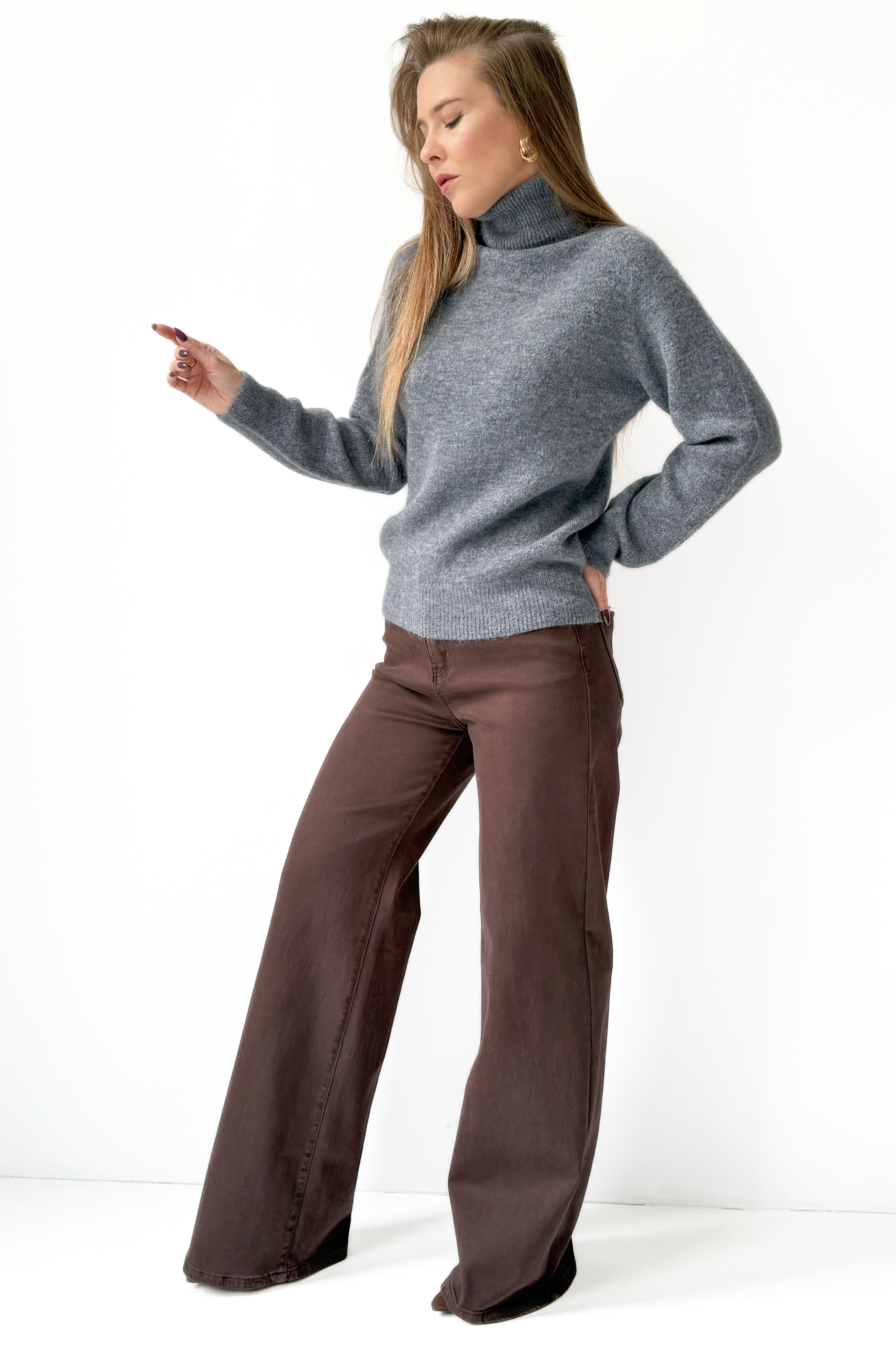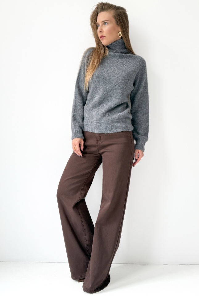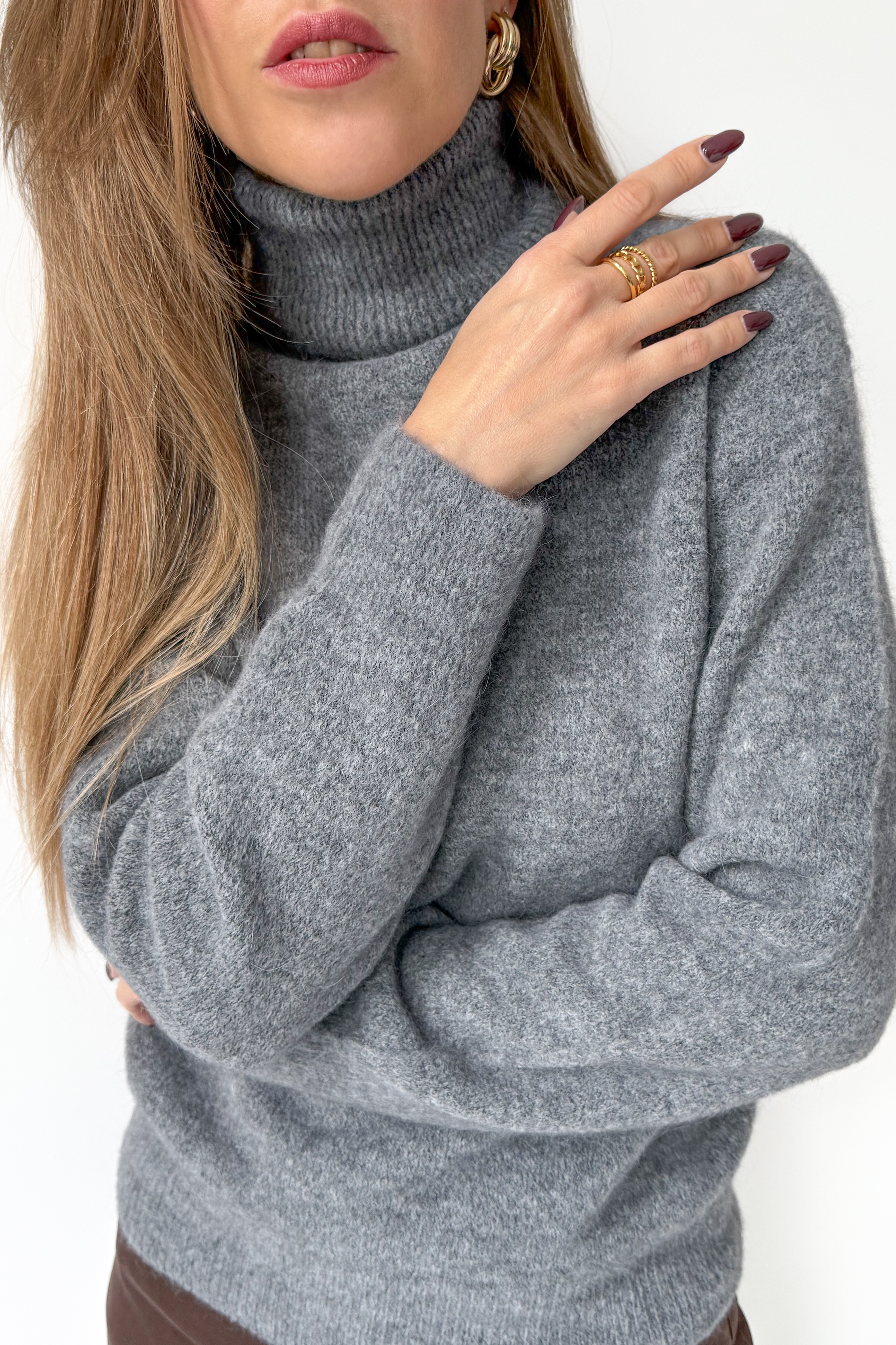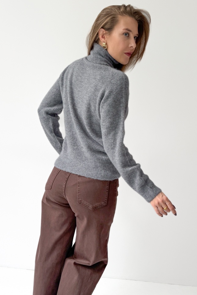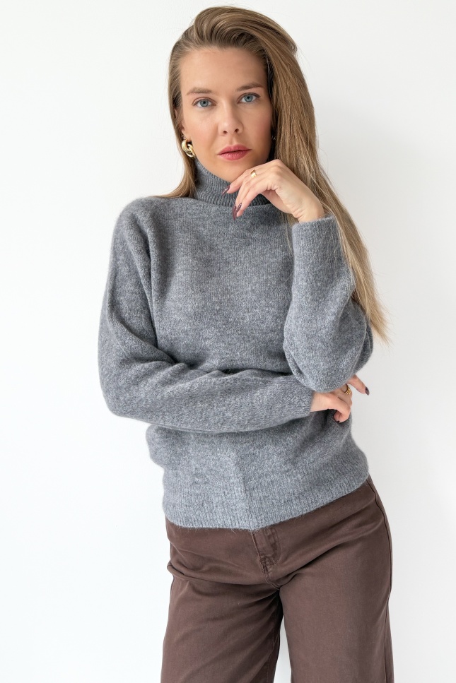 „Bella” to klasyczny golf wykonany z luksusowej mieszanki baby alpaki i wełny dziewiczej. Niezwykle miękki, lekki i przyjemny dla ciała – otula ciepłem, zachowując elegancki, minimalistyczny wygląd. Jego prosta forma i szlachetny materiał sprawiają, że to idealna baza do codziennych i bardziej stylowych zestawów sezonu AW 2025/26.