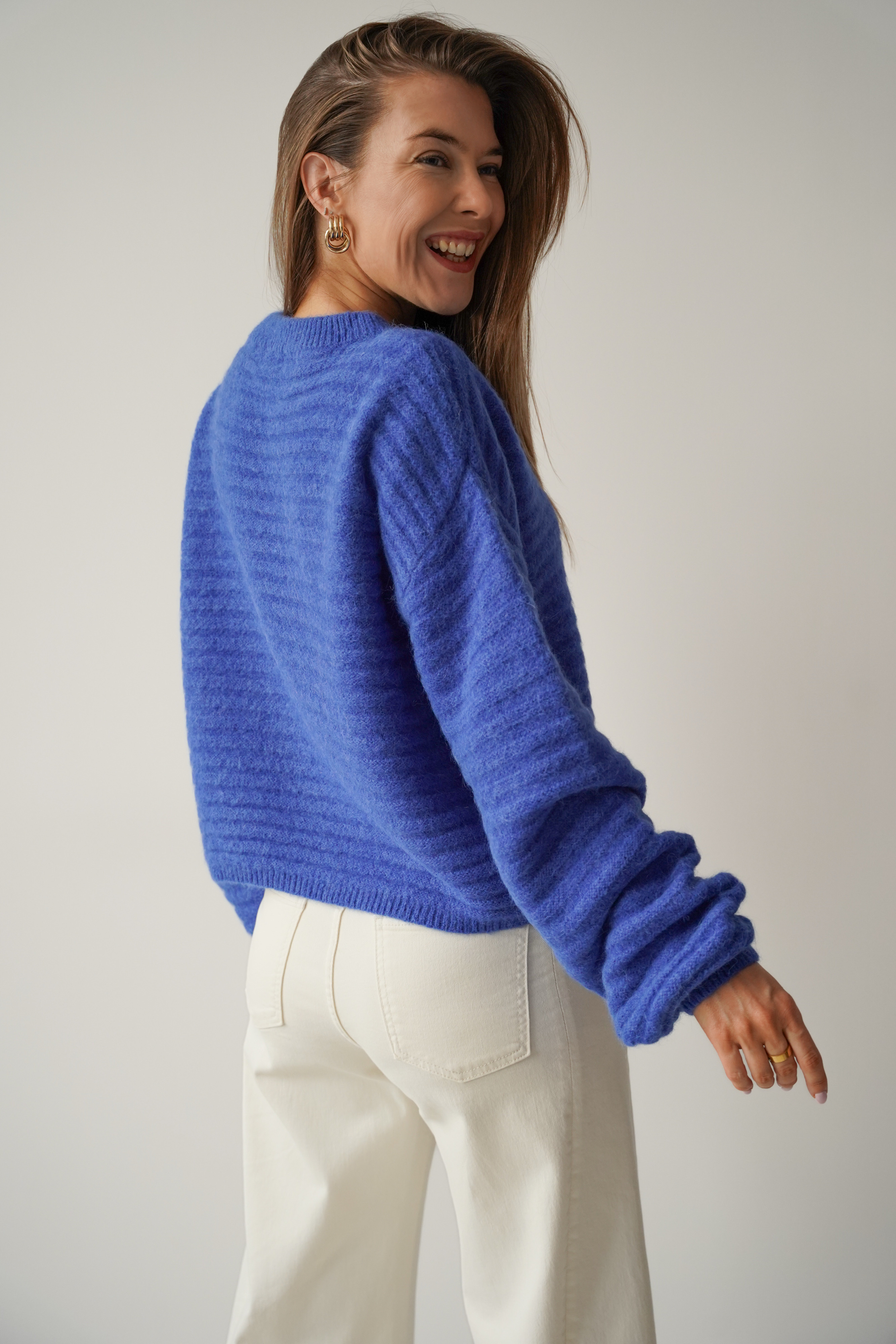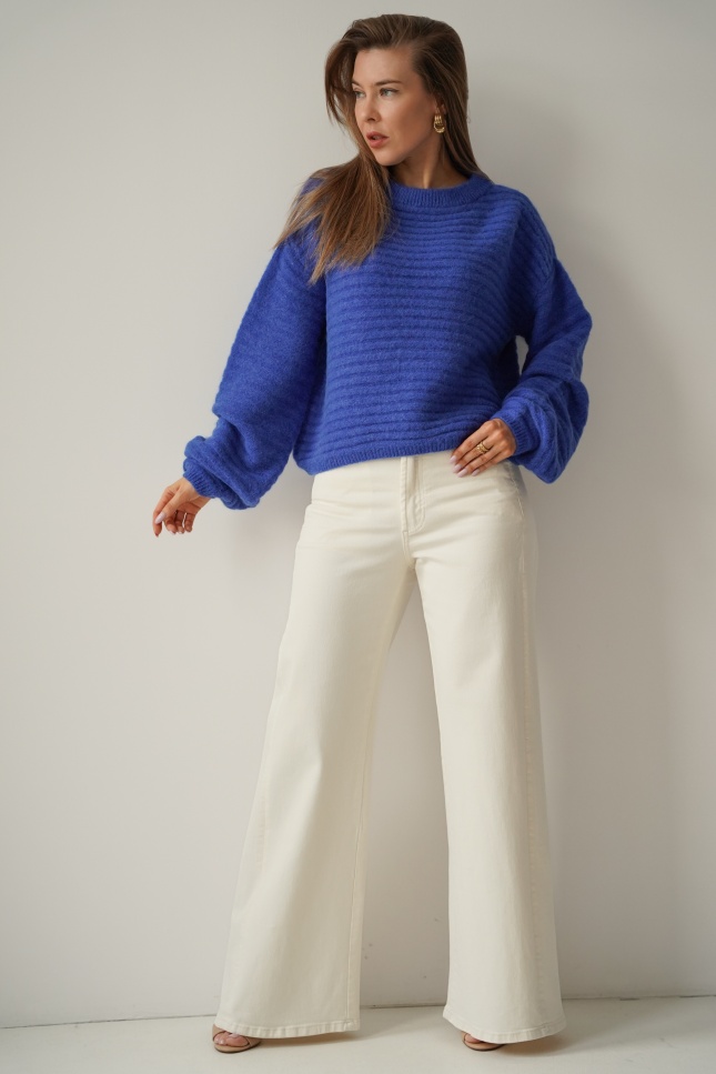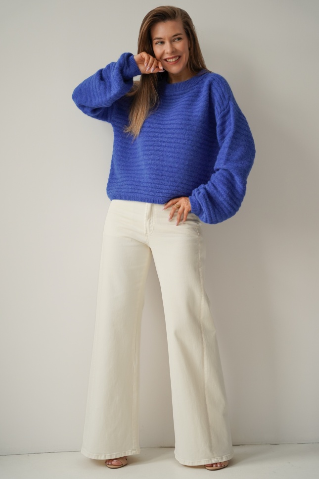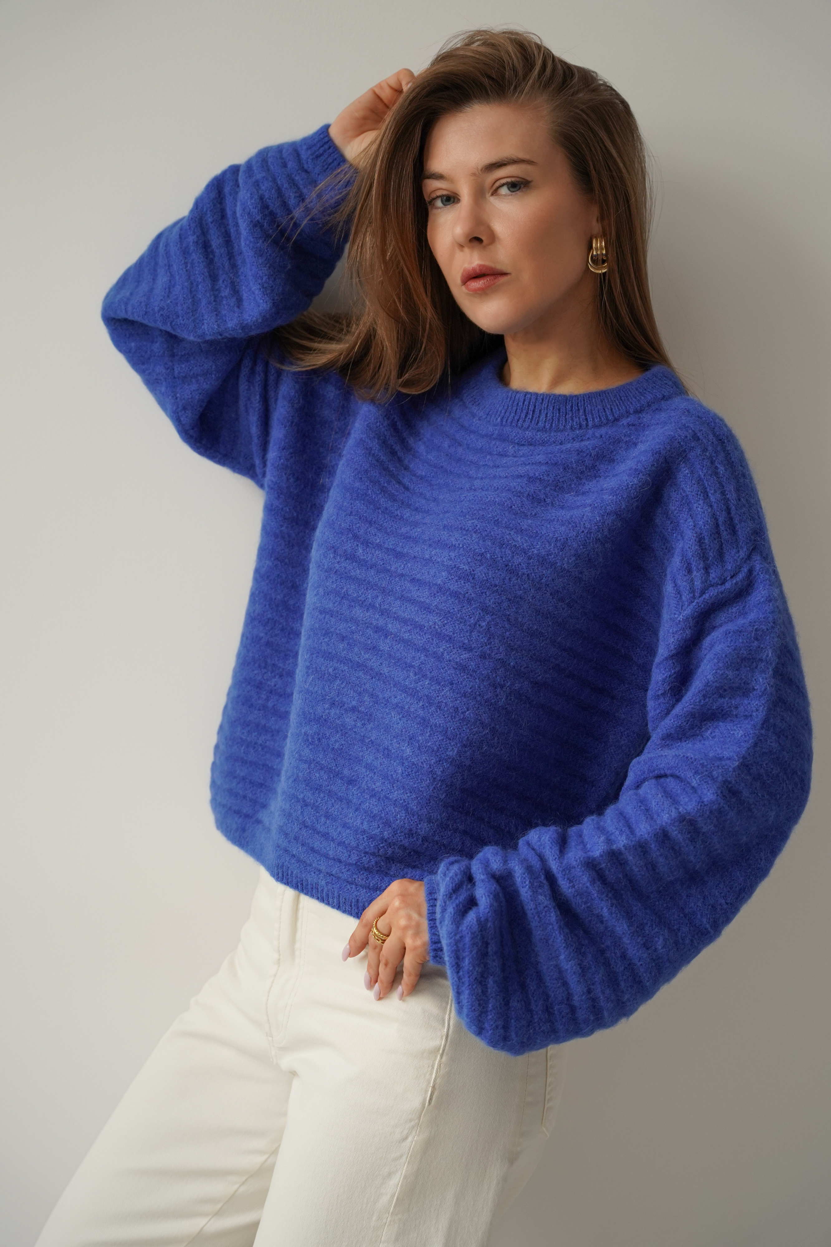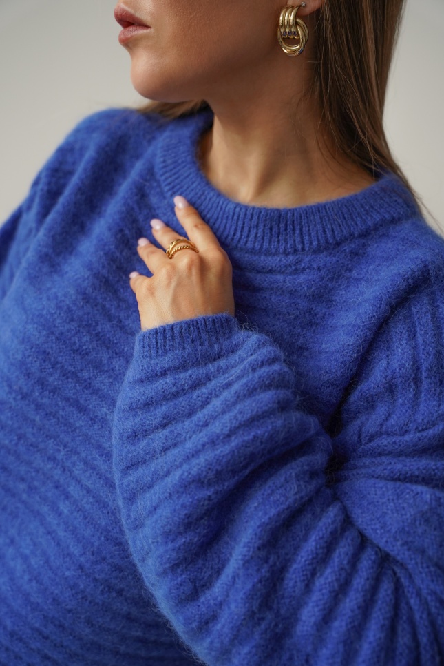 Kobiecy sweterek, o prostym, wygodnym fasonie, dziany we wzór prążka. Sweterek wykonany z eksluzywnej przędzy z SURI ALPAKĄ 58% oraz wełna w składzie, co nadaje mu niezwykłej miękkości. Urzeka swoim niebanalnym, subtelnym designem, który z pewnością sprawi, że każdy outfit nabiera stylowego wyrazu.