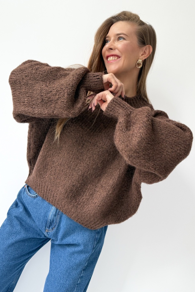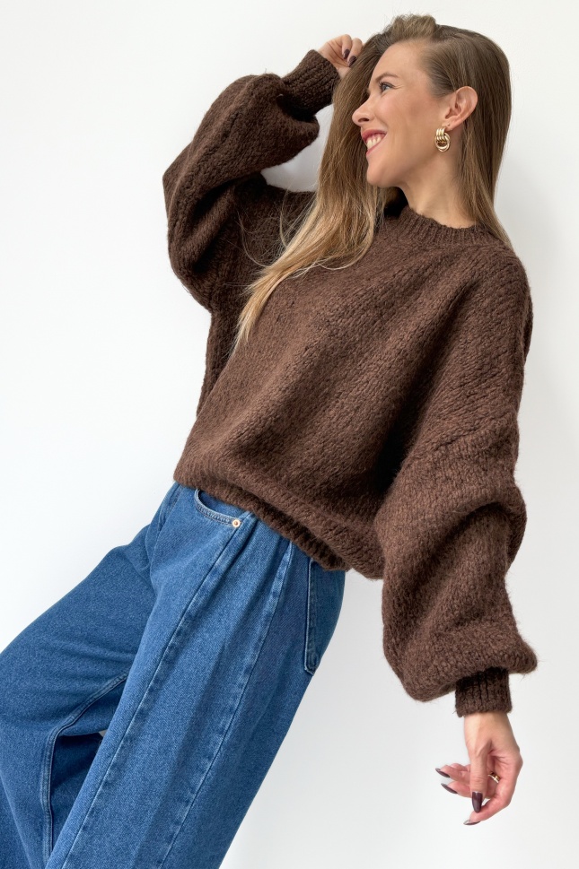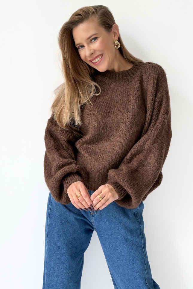 „Fluffy” to klasyczny sweter o kobiecym charakterze, który zachwyca puszystą fakturą i delikatnie bufiastymi rękawami. Wykonany z miękkiej, mięsistej przędzy z domieszką wełny i moheru – otula ciepłem, zapewniając wyjątkowy komfort noszenia. Subtelne ściągacze podkreślają fason, a jego ponadczasowy styl sprawia, że doskonale komponuje się z jeansami, spódnicą czy eleganckimi spodniami.