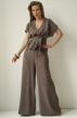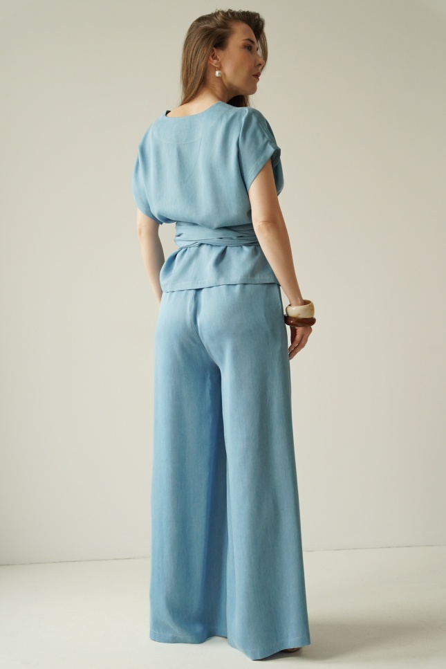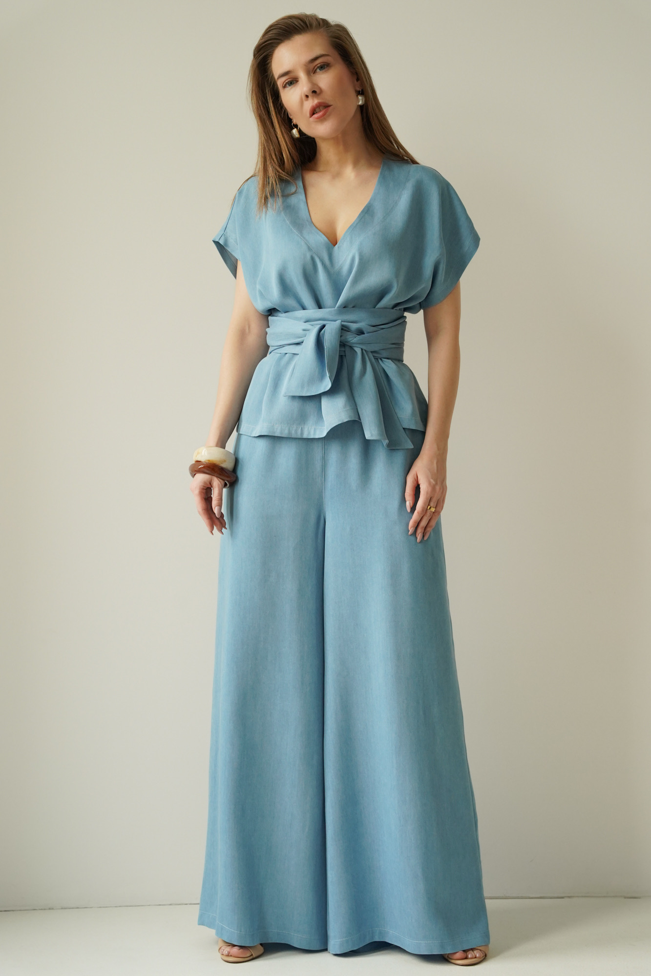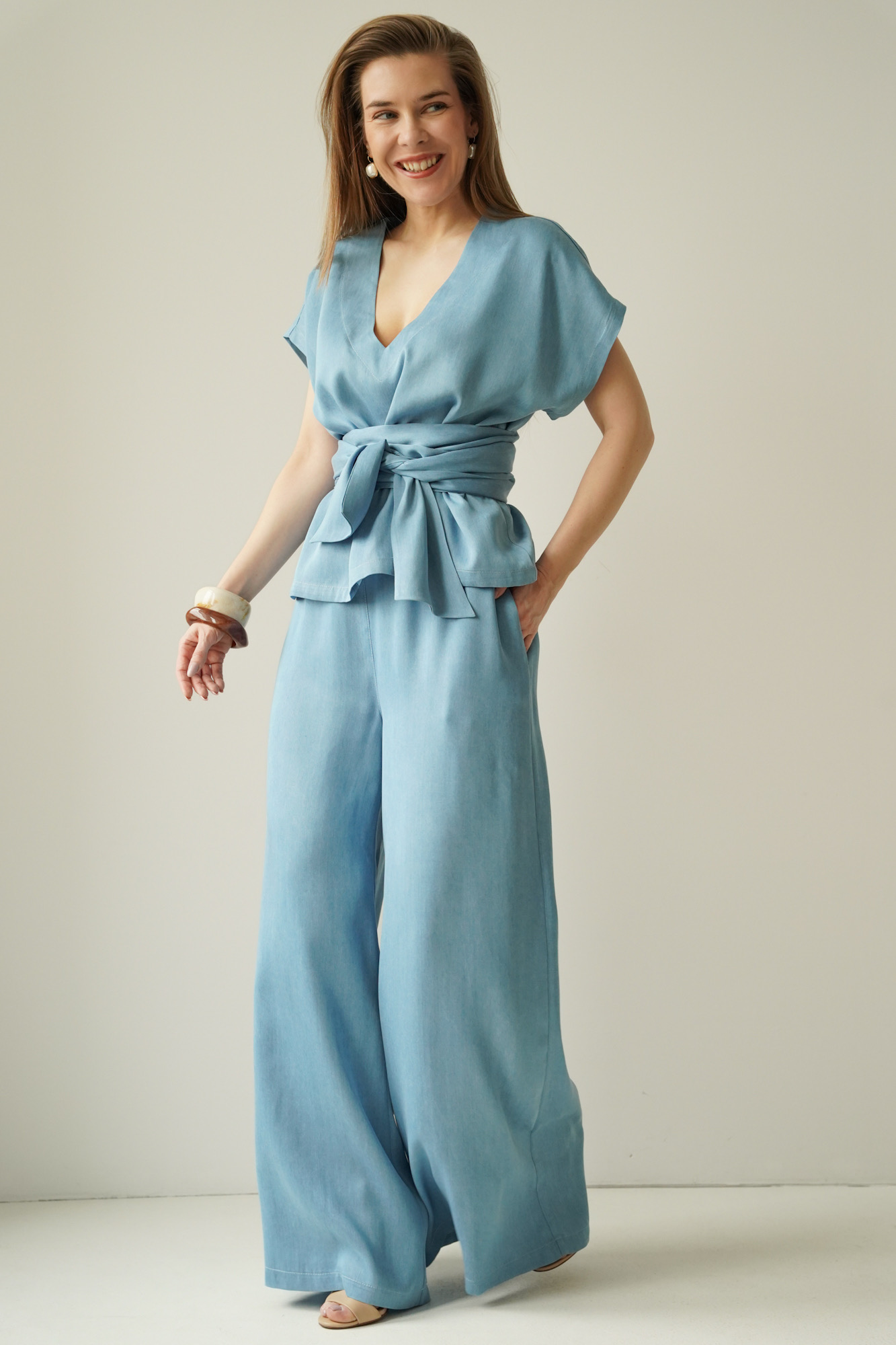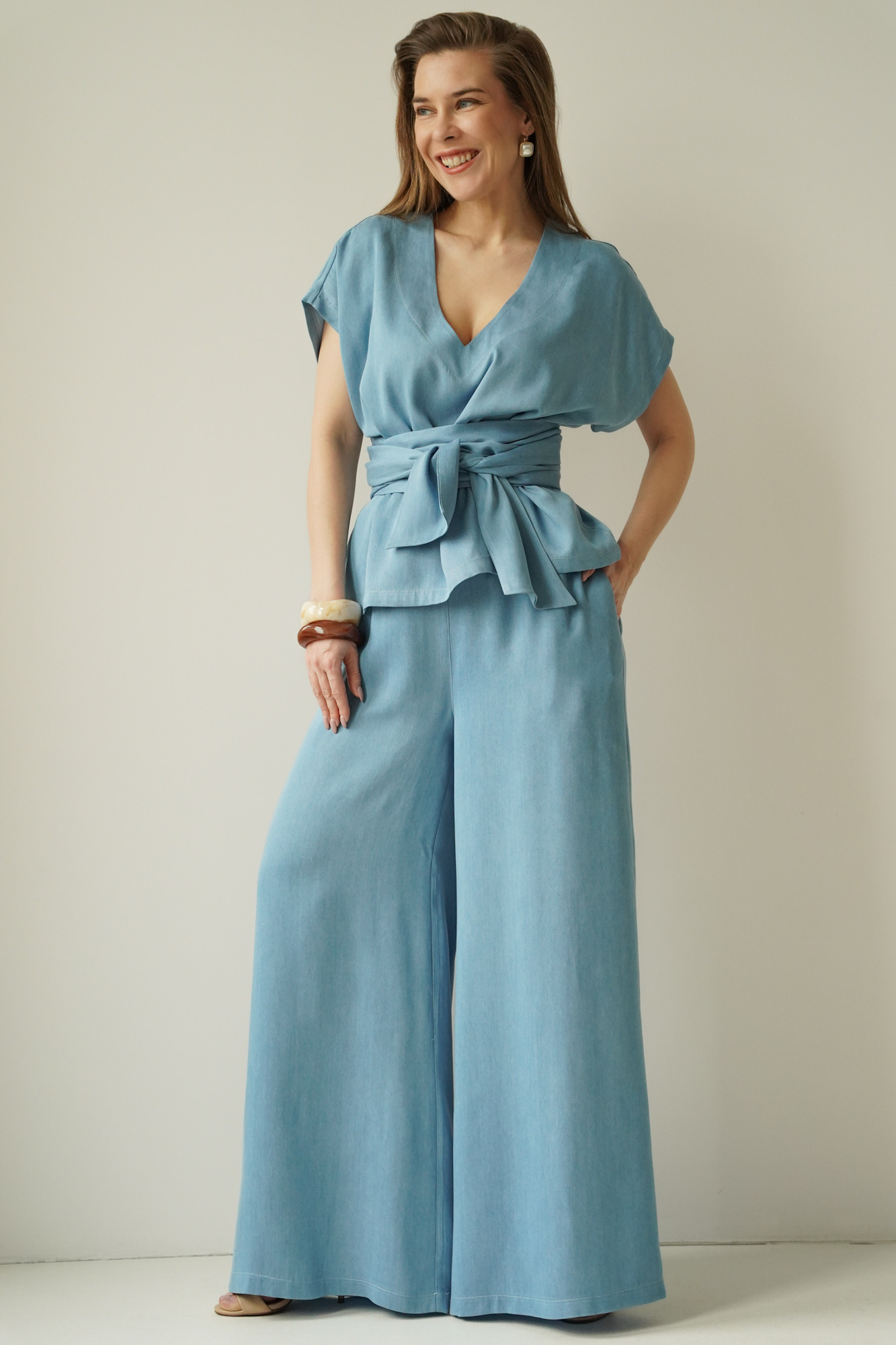 Składający się z prostych spodni z szerokimi nogawkami oraz bluzki z dekoltem w kształcie litery V, związywanej w talii szeroką, miękko układającą się szarfą, komplet pięknie podkreśla sylwetkę, nie tracąc przy tym na lekkości i swobodzie.