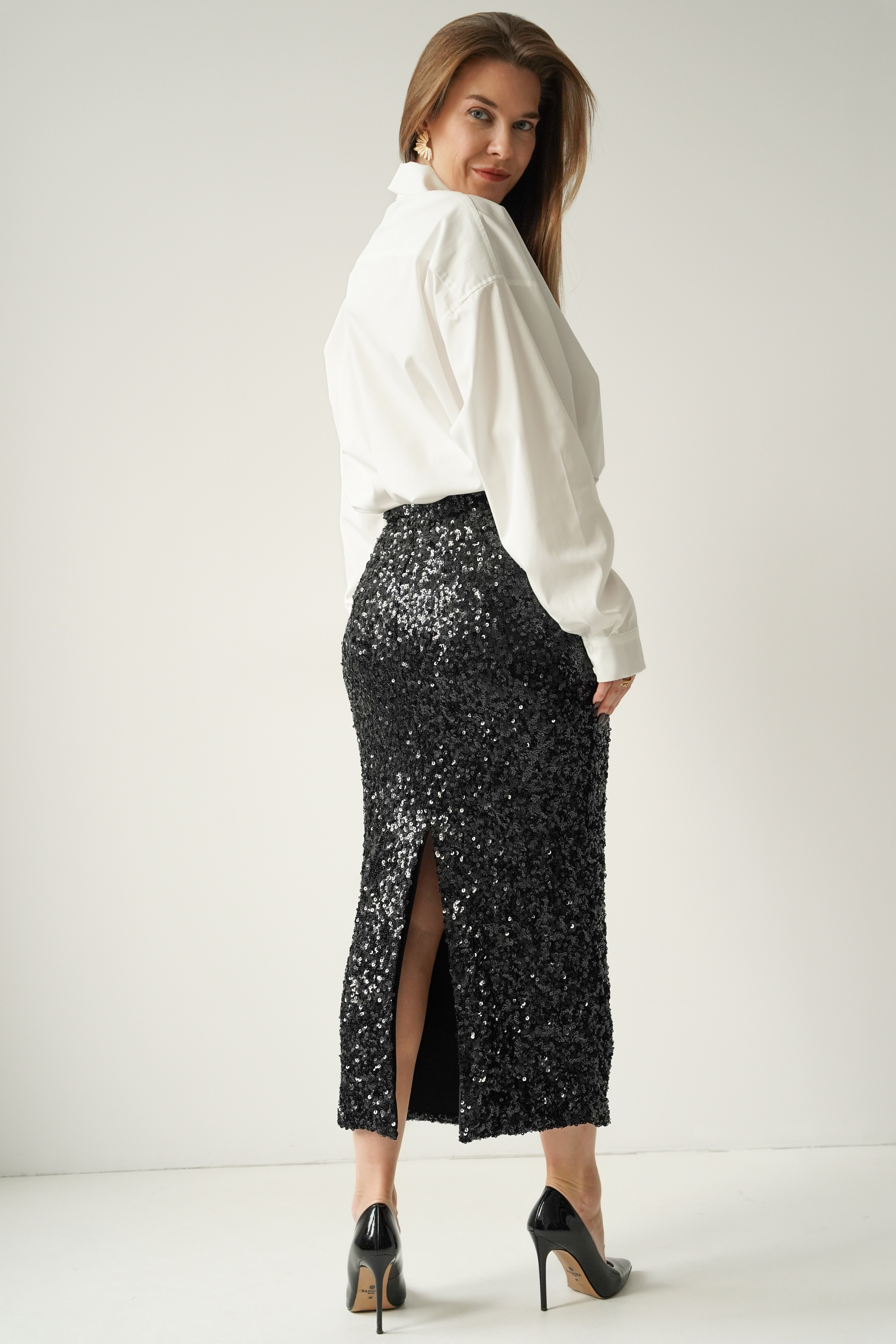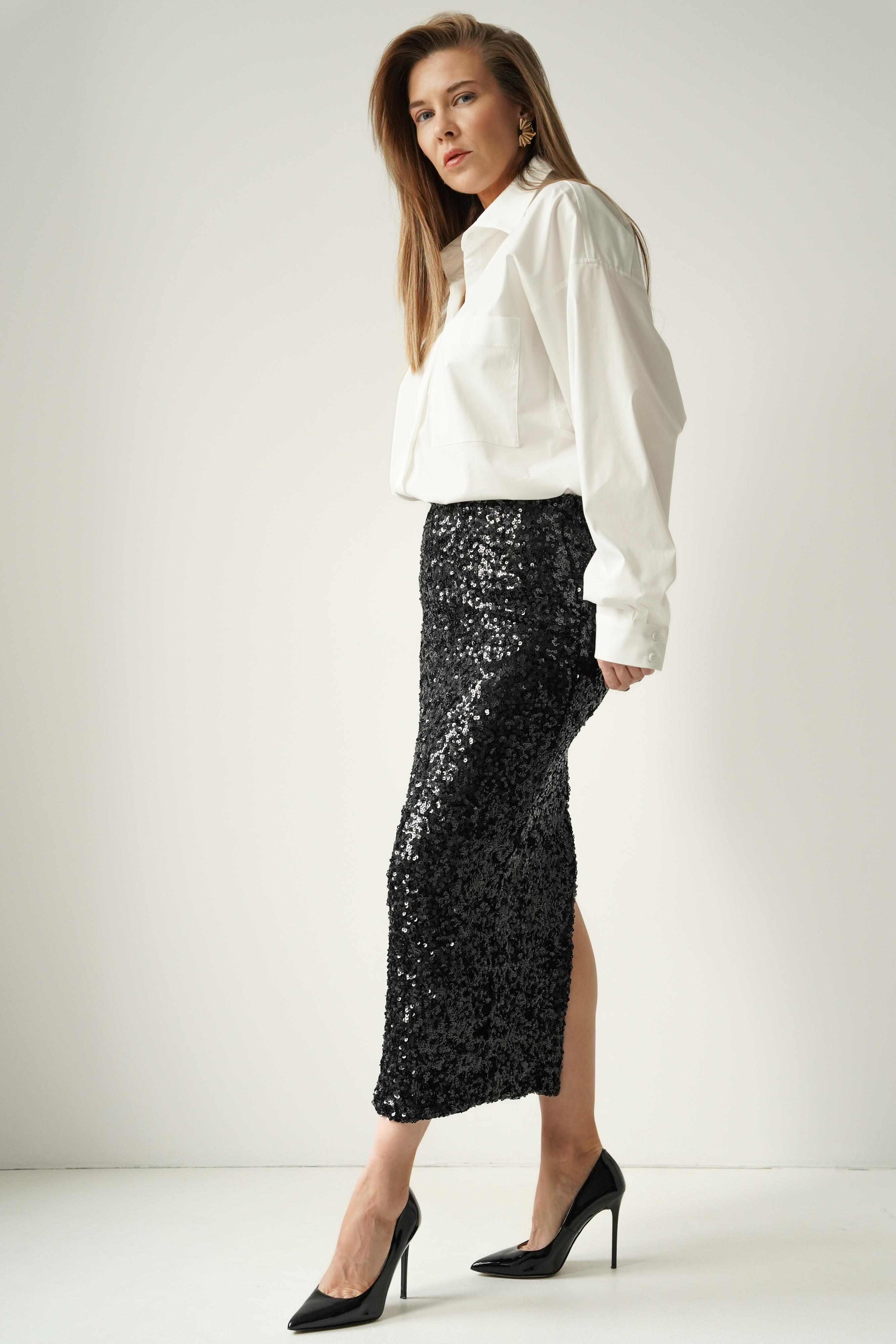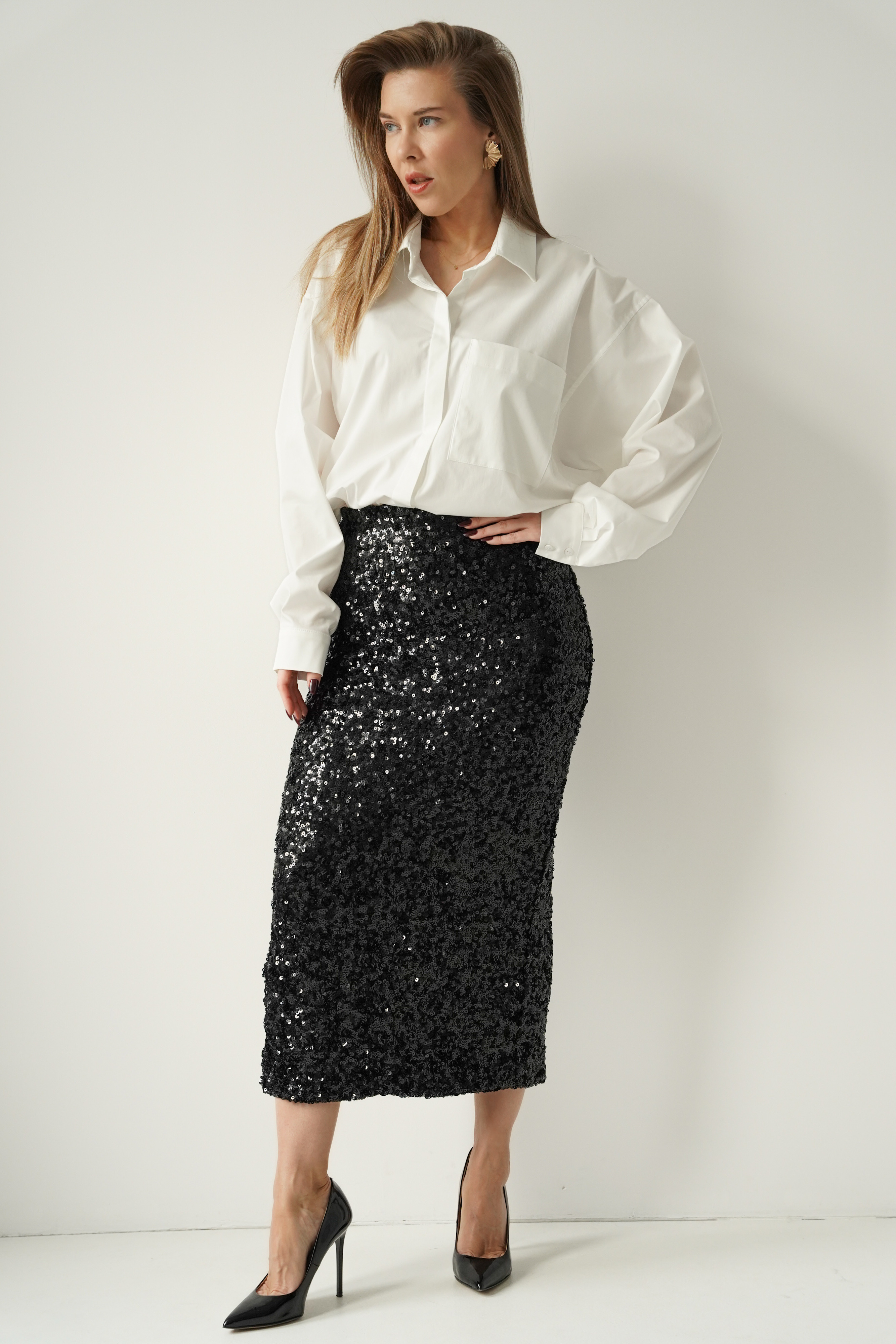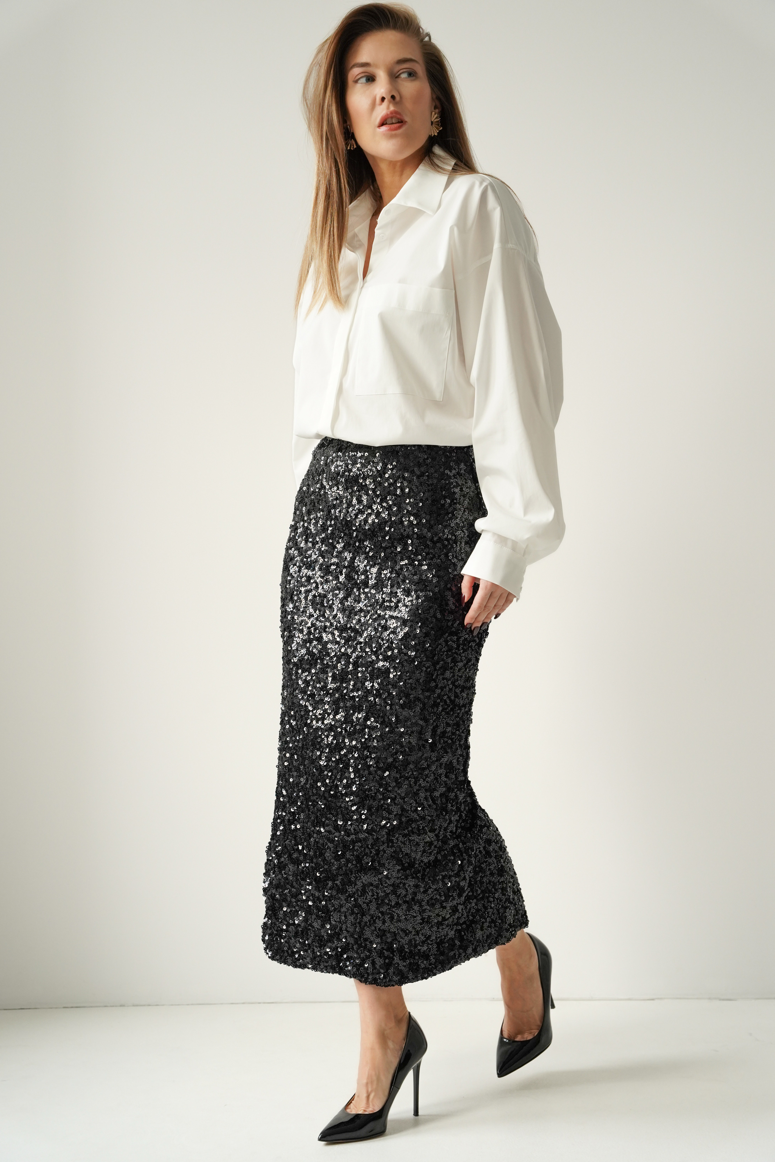 Noire – czarna cekinowa spódnica midi o kobiecej linii, z subtelnym rozcięciem. Elegancko połyskuje, pięknie pracuje przy każdym ruchu i doskonale sprawdza się na wieczorne wyjścia, świąteczne uroczystości i sylwestrowe noce. Komfortowa, elastyczna podszewka zapewnia idealne dopasowanie i wygodę przez cały wieczór.