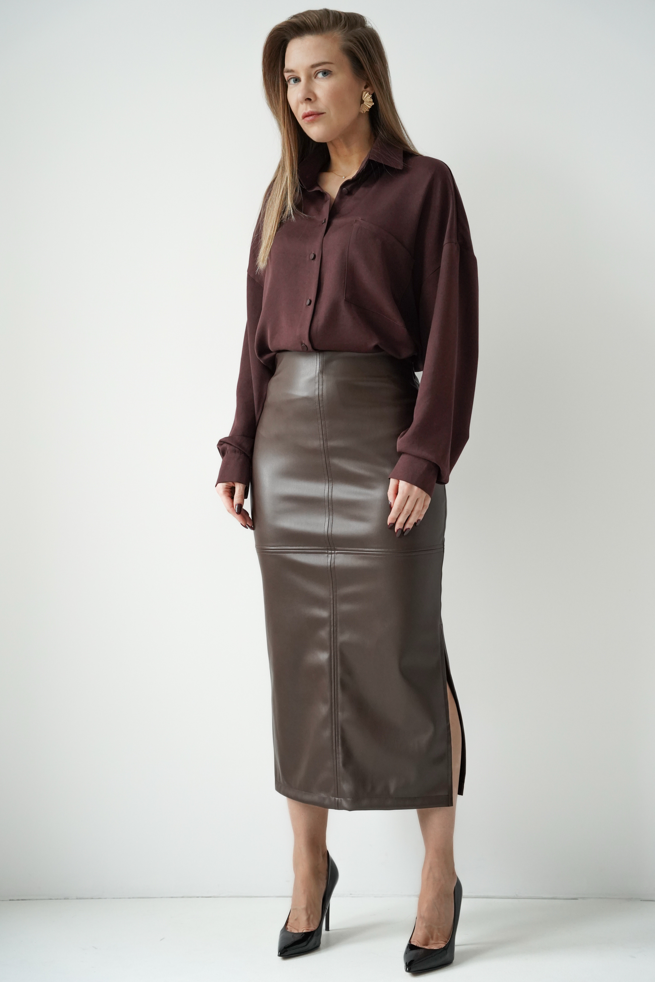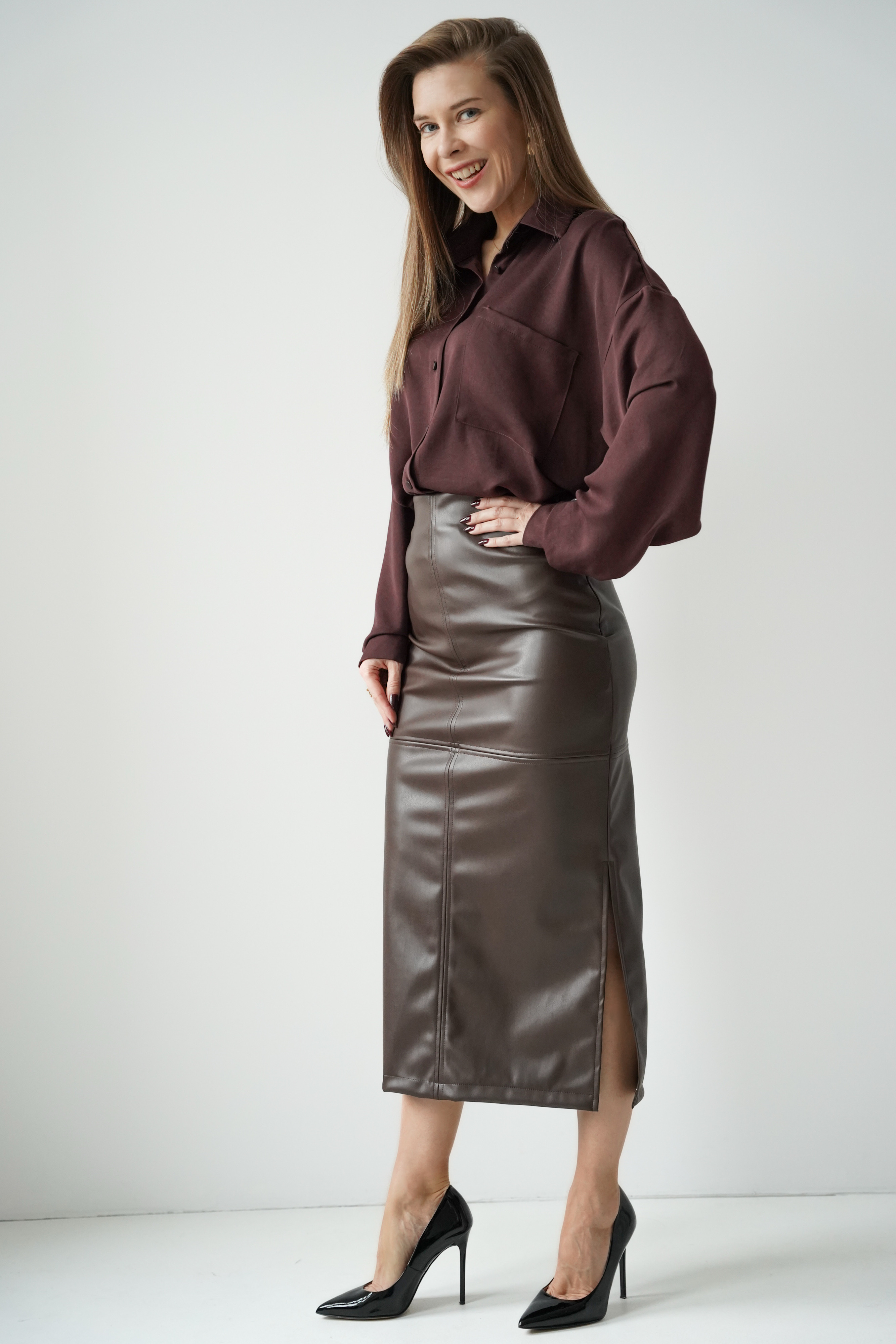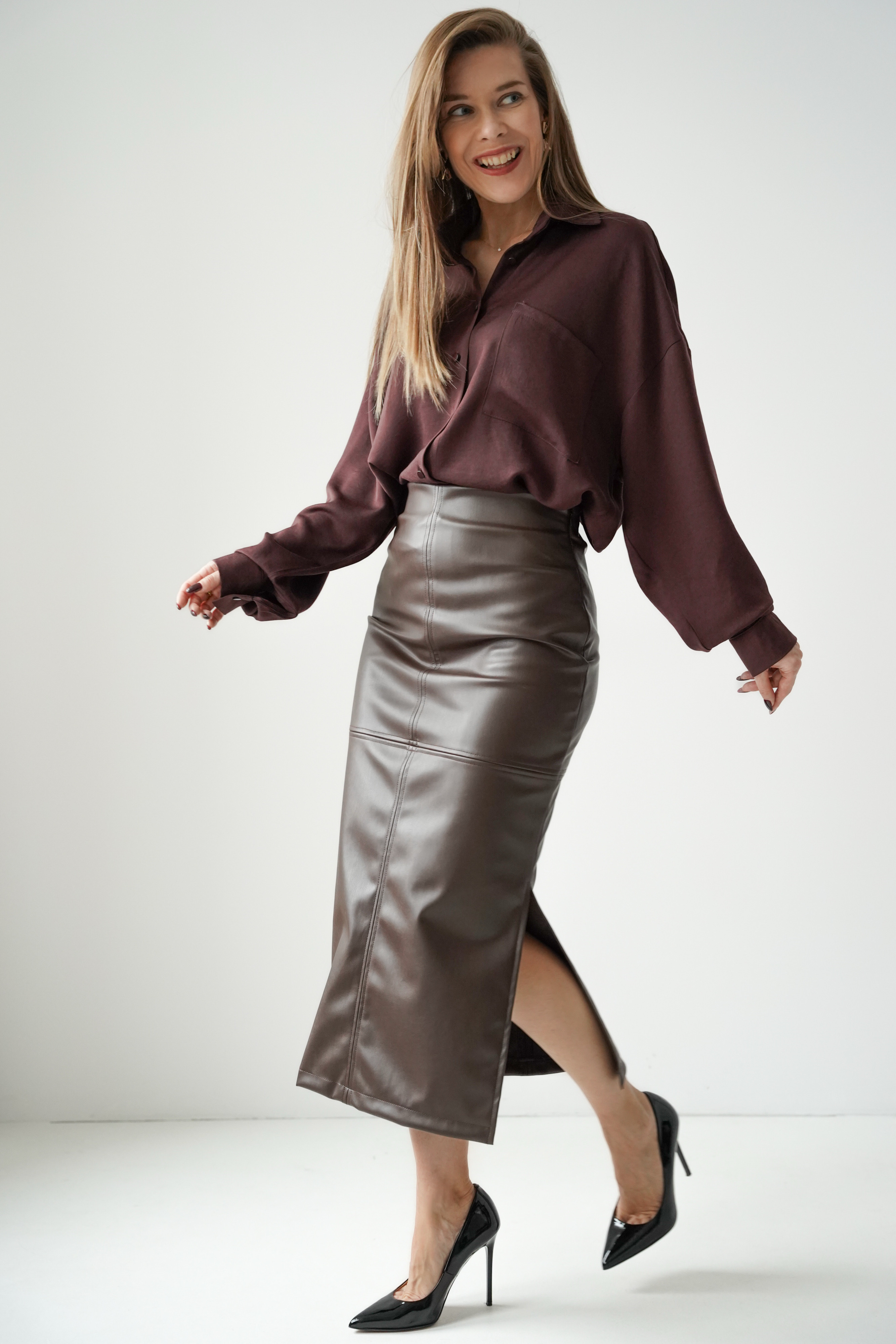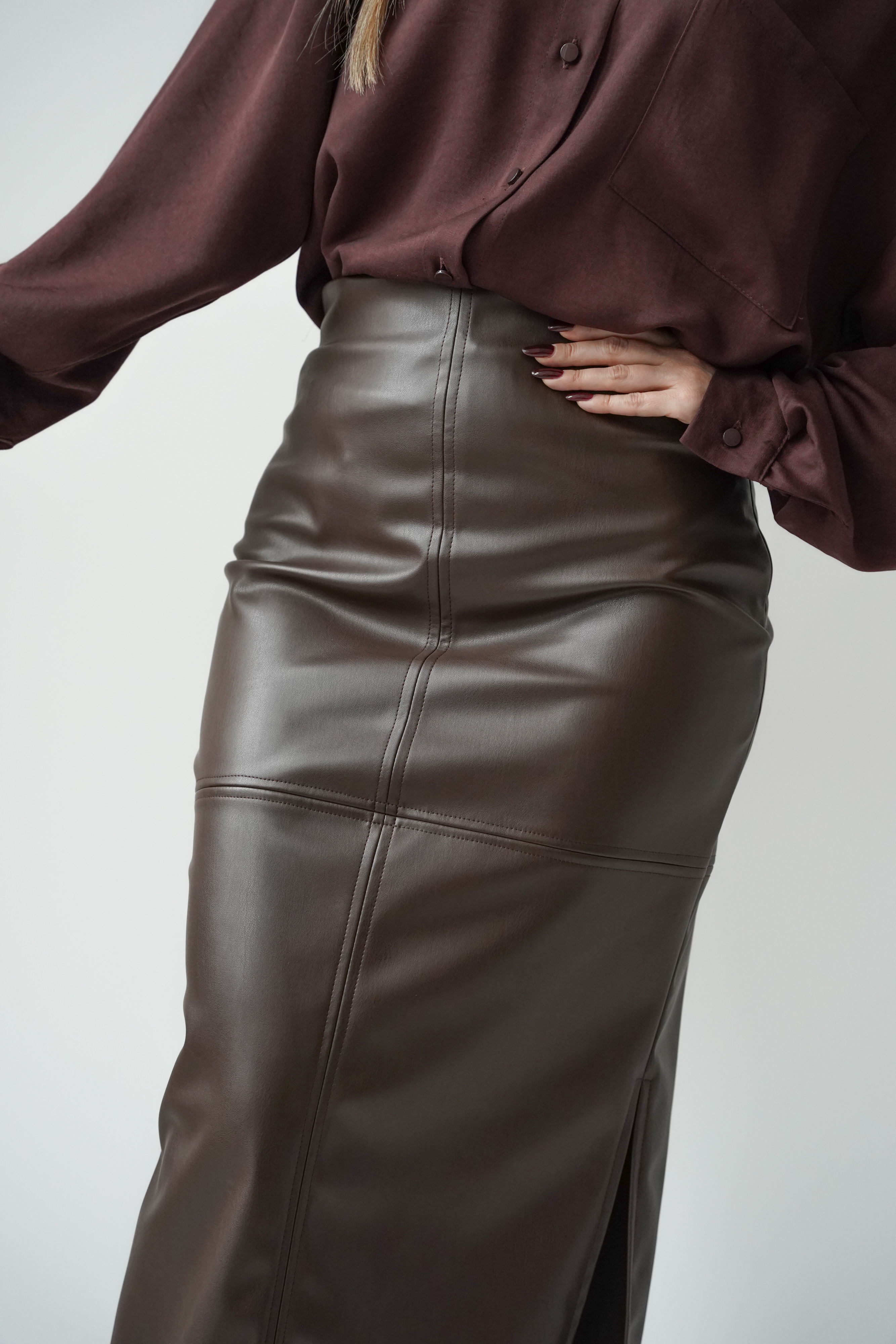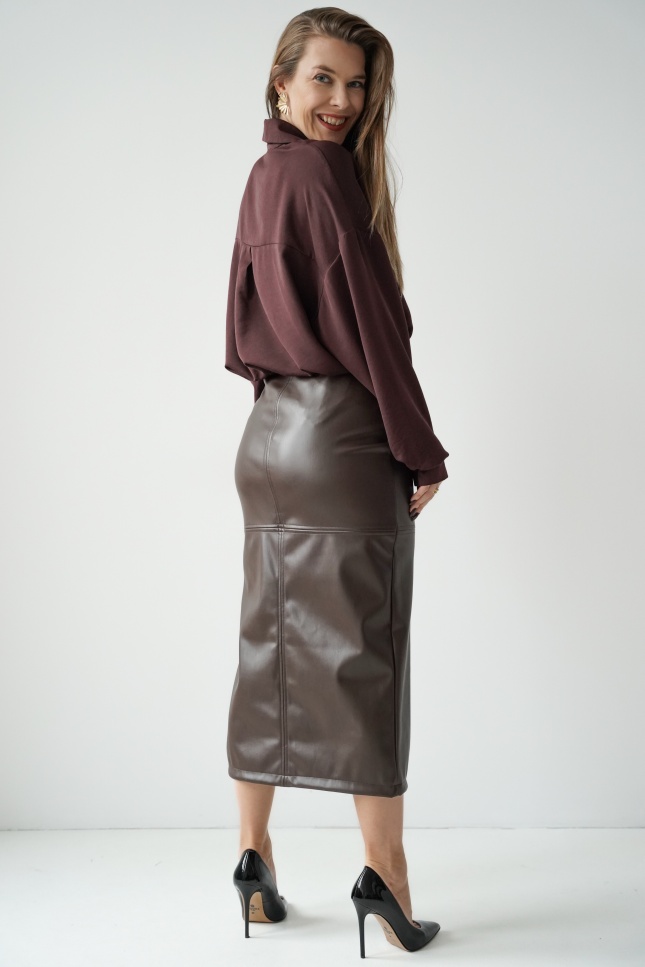 „CÉLENE” – ołówkowa spódnica midi z miękkiej eko skóry.