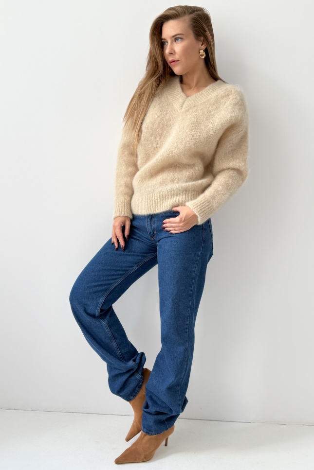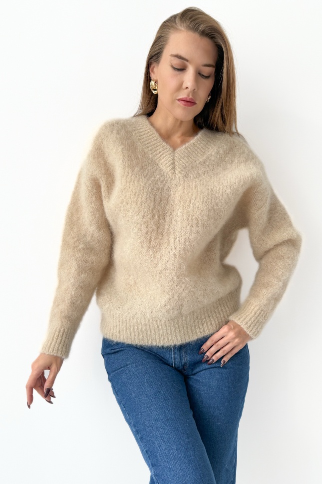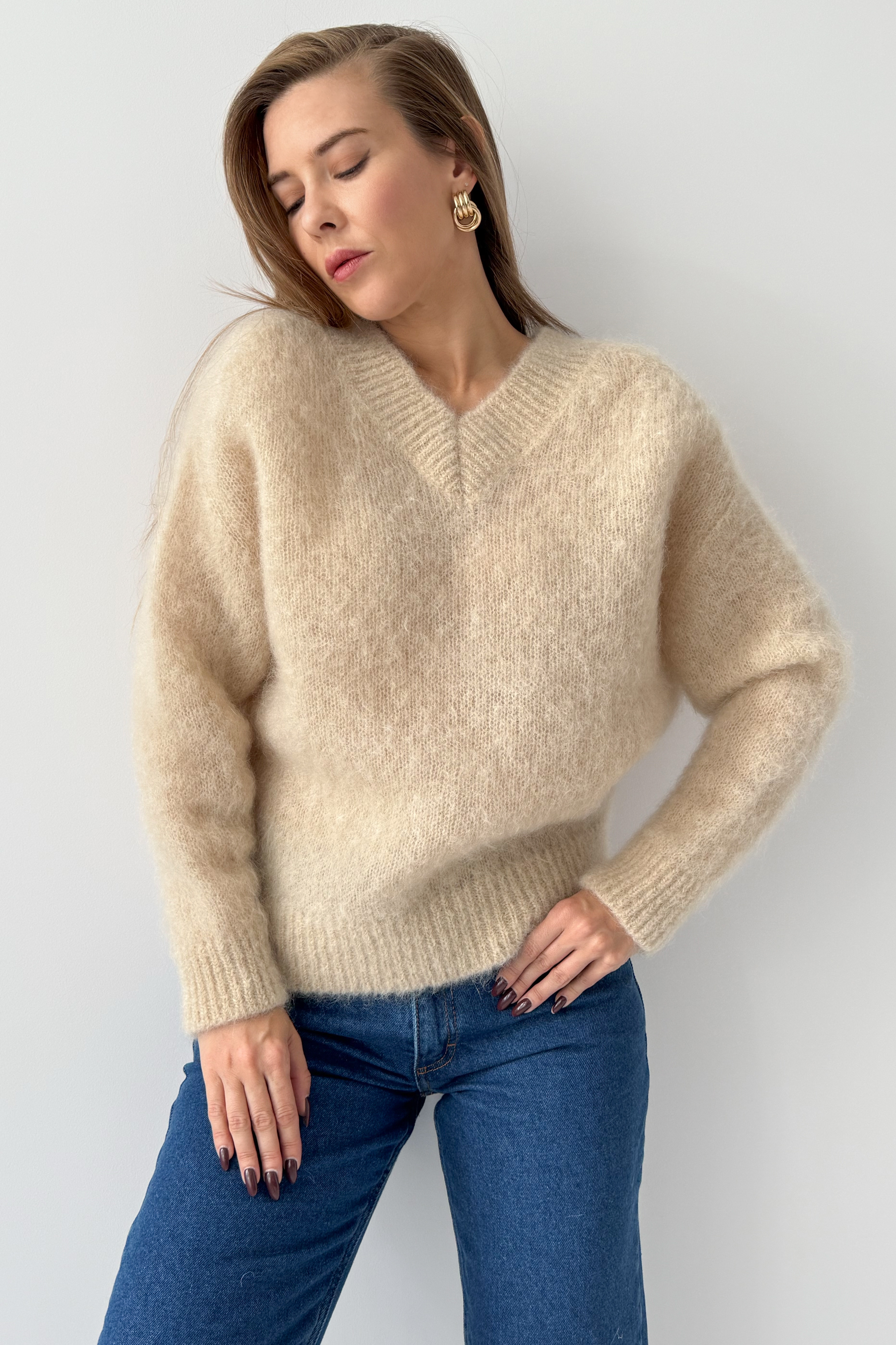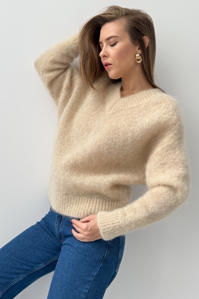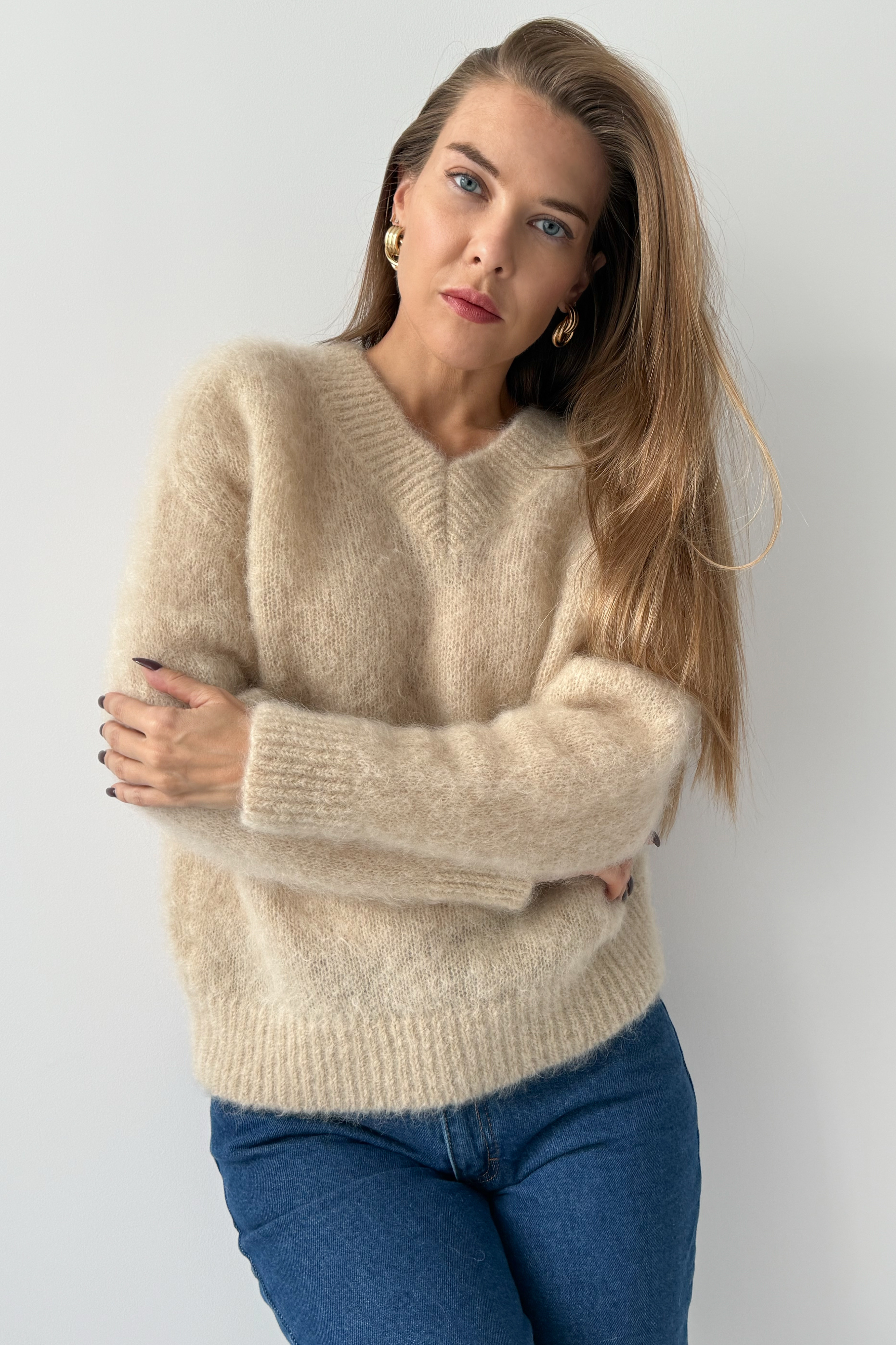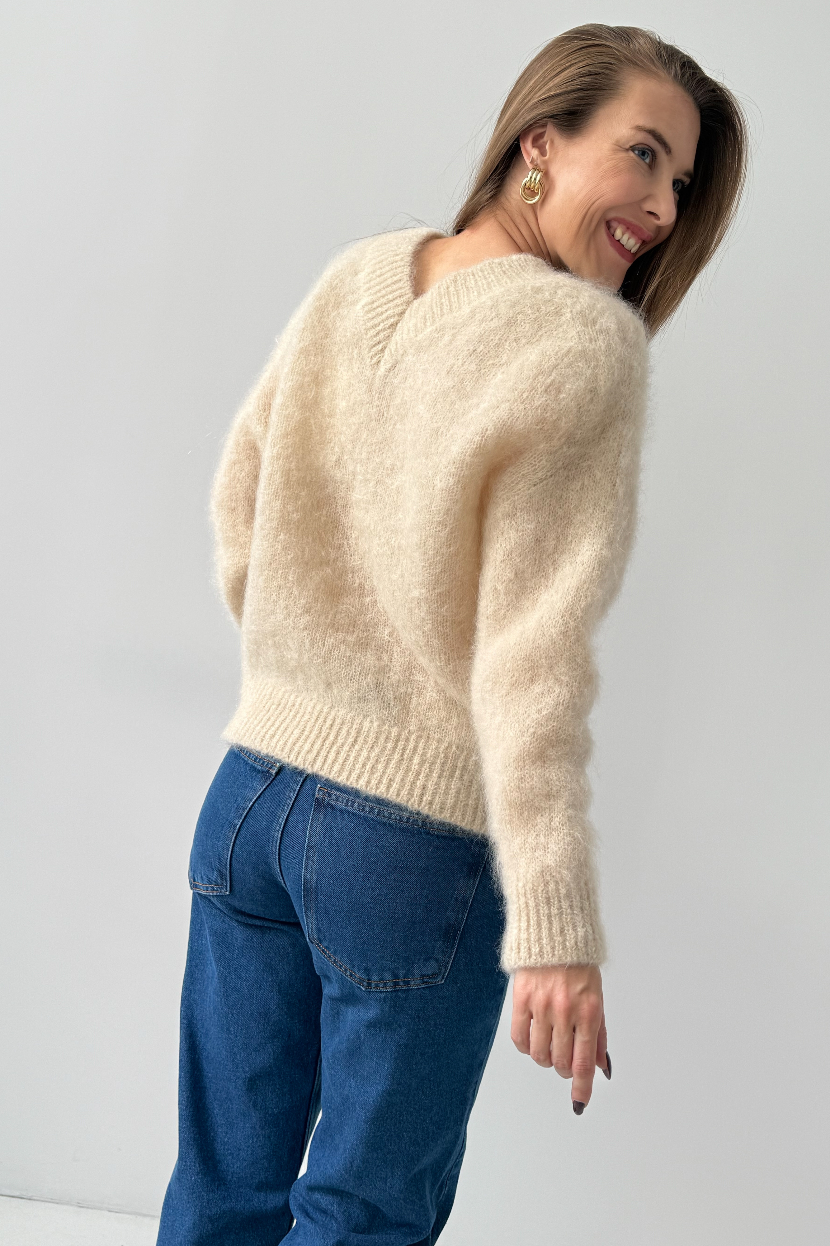 Puszysty sweter z super kid moher dekolt V Etre jasny beż