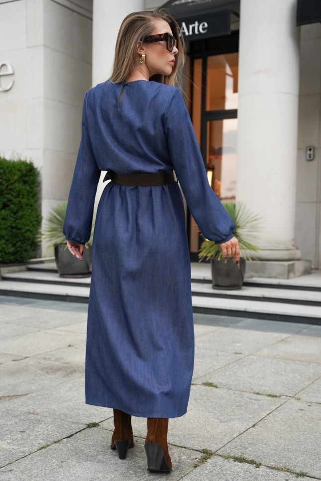 „Blue Horizon” to sukienka maxi, która łączy minimalistyczny krój z lekkością boho. Rozkloszowany dół dodaje sylwetce płynności, a szeroki pasek w talii pięknie podkreśla kobiece kształty. Wykonana z miękkiego denimu, jest uniwersalną bazą na sezon AW 25/26 – równie dobrze odnajdzie się w miejskim minimalizmie, jak i w boho elegancji.