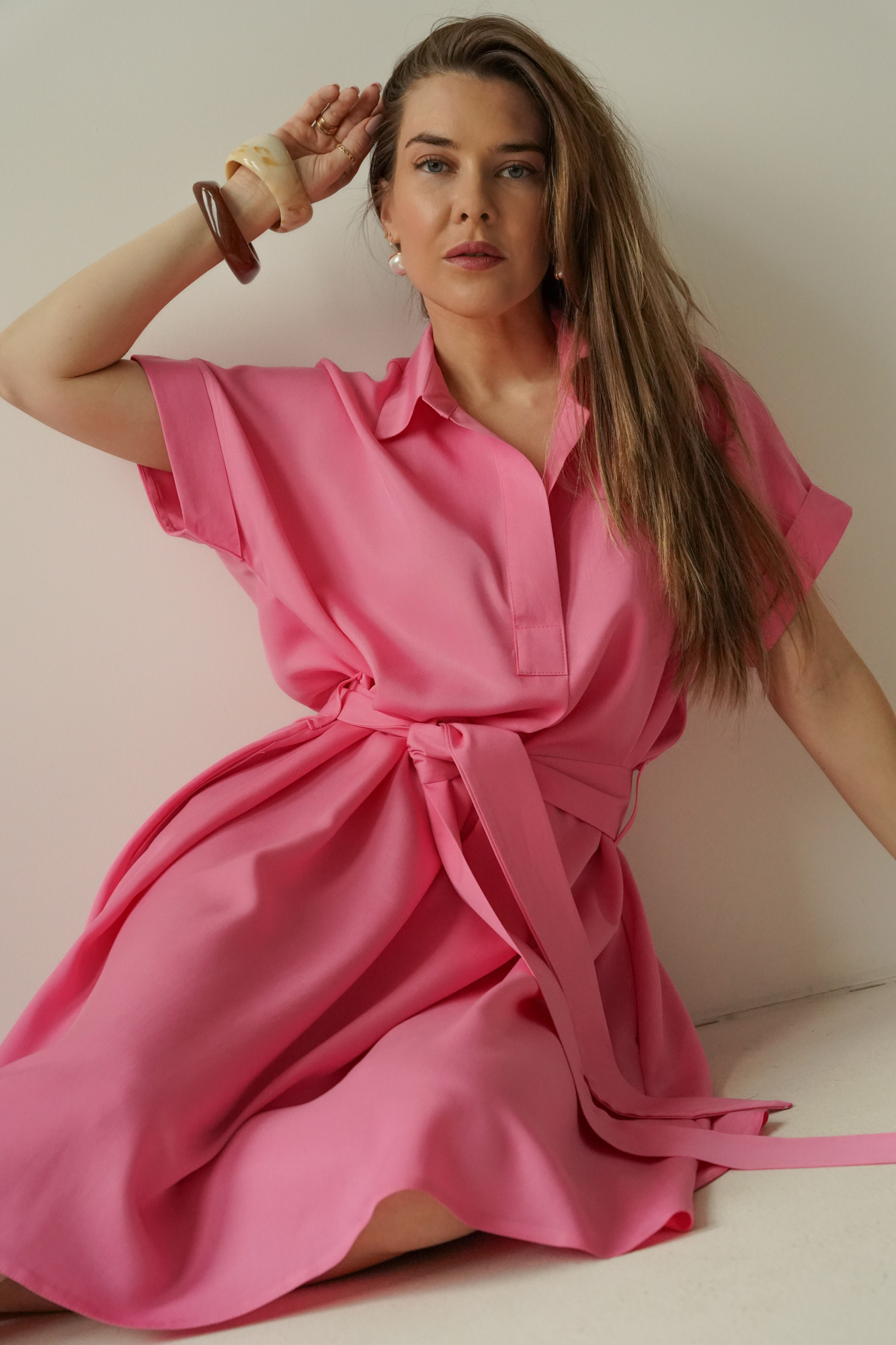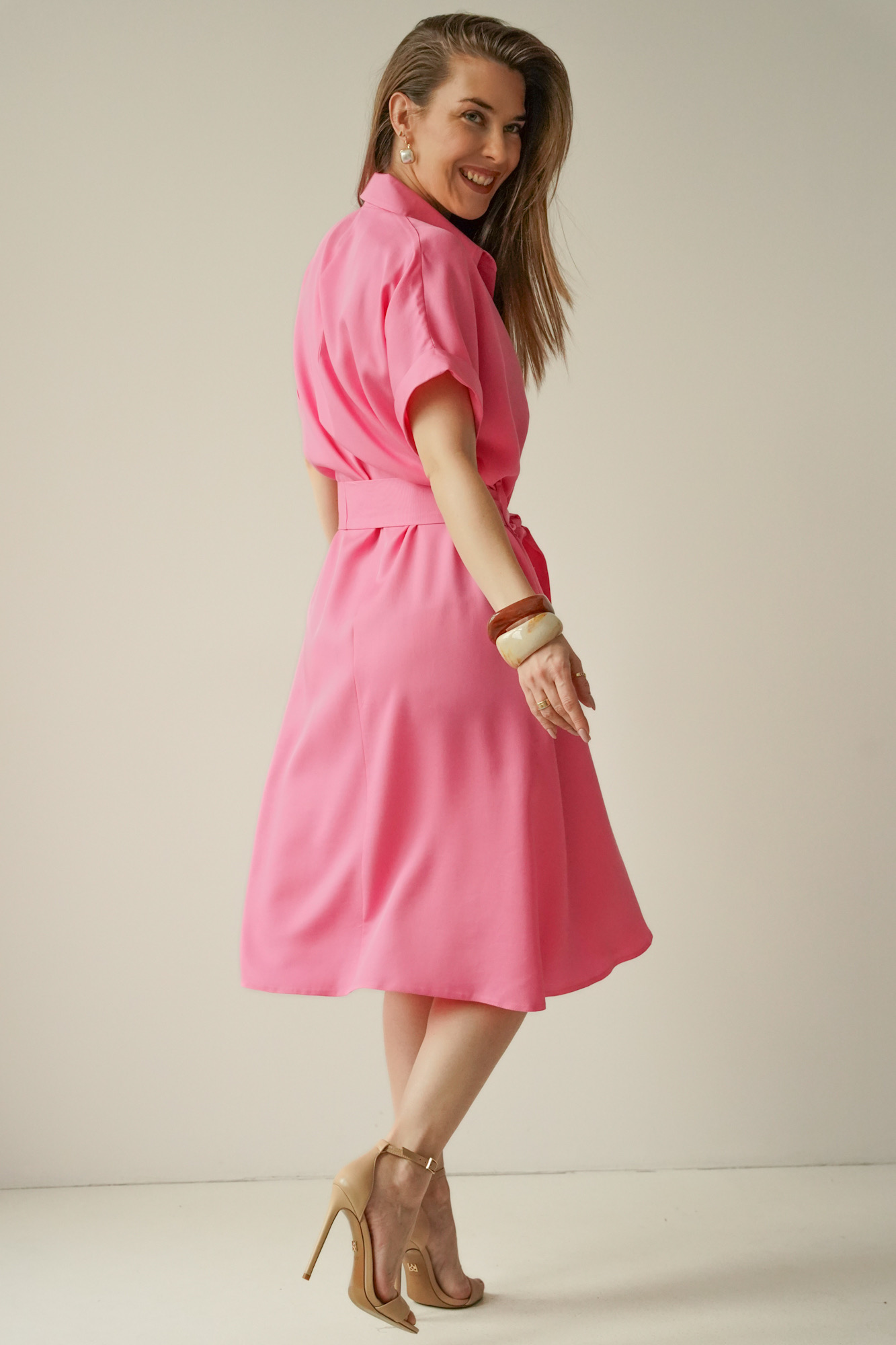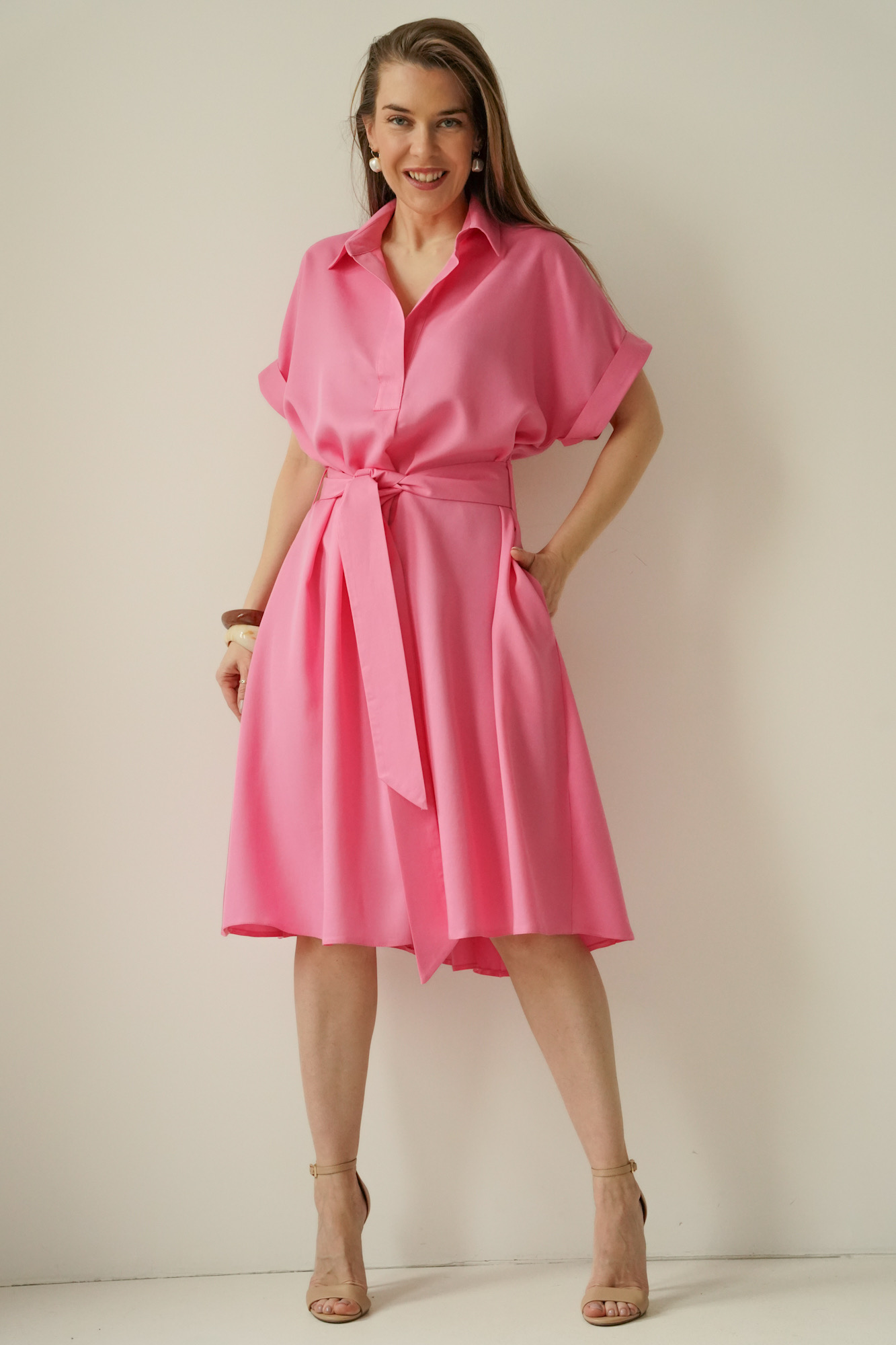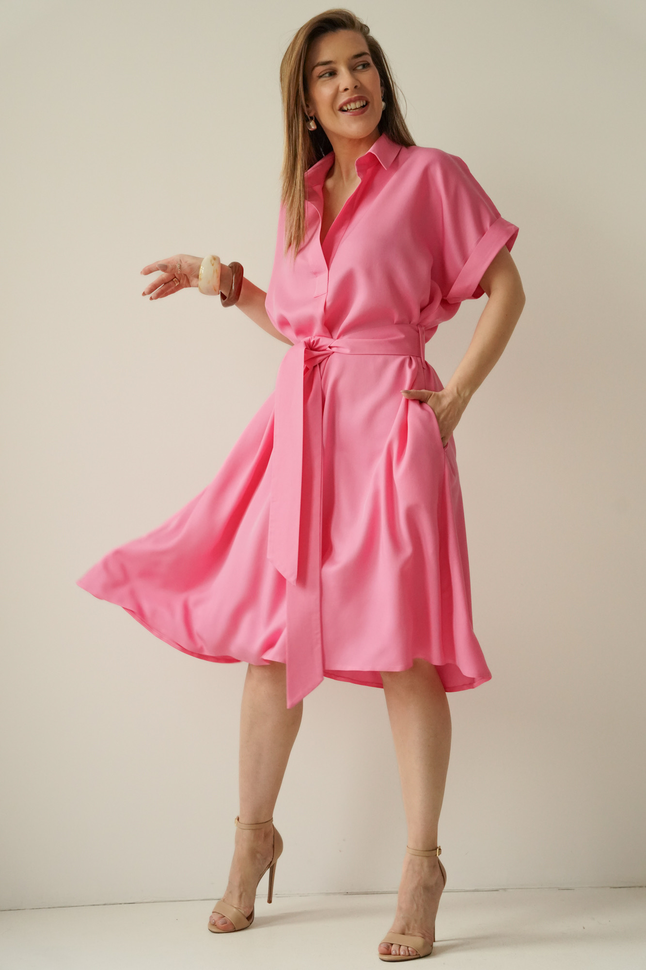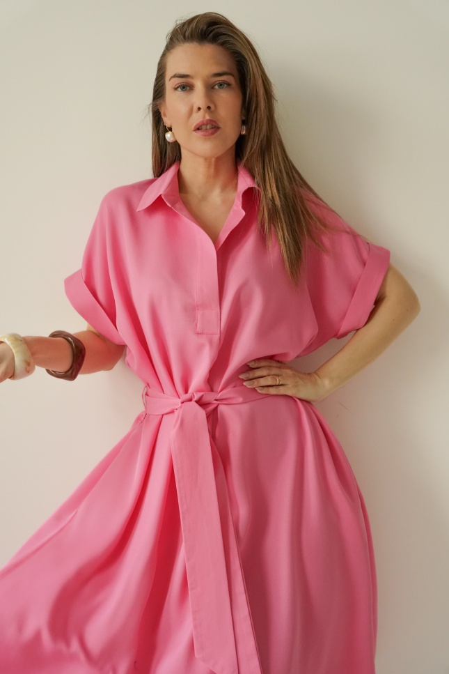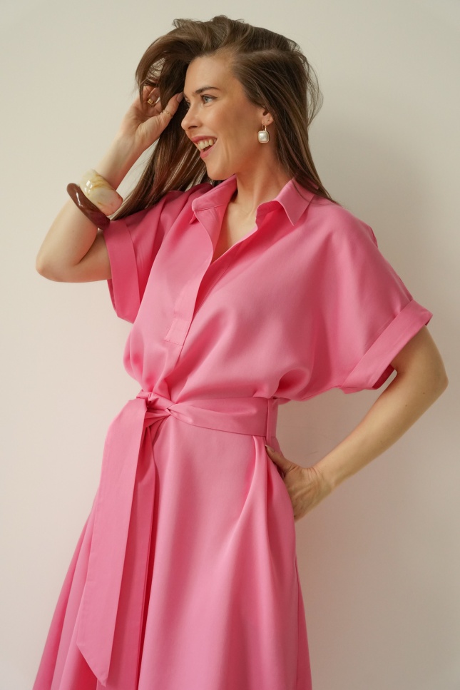 Talia podkreślona paskiem pozwala idealnie dopasować sukienkę do figury, a starannie dobrana tkanina 100% lyocell jest miękka, przewiewna i komfortowa w noszeniu.