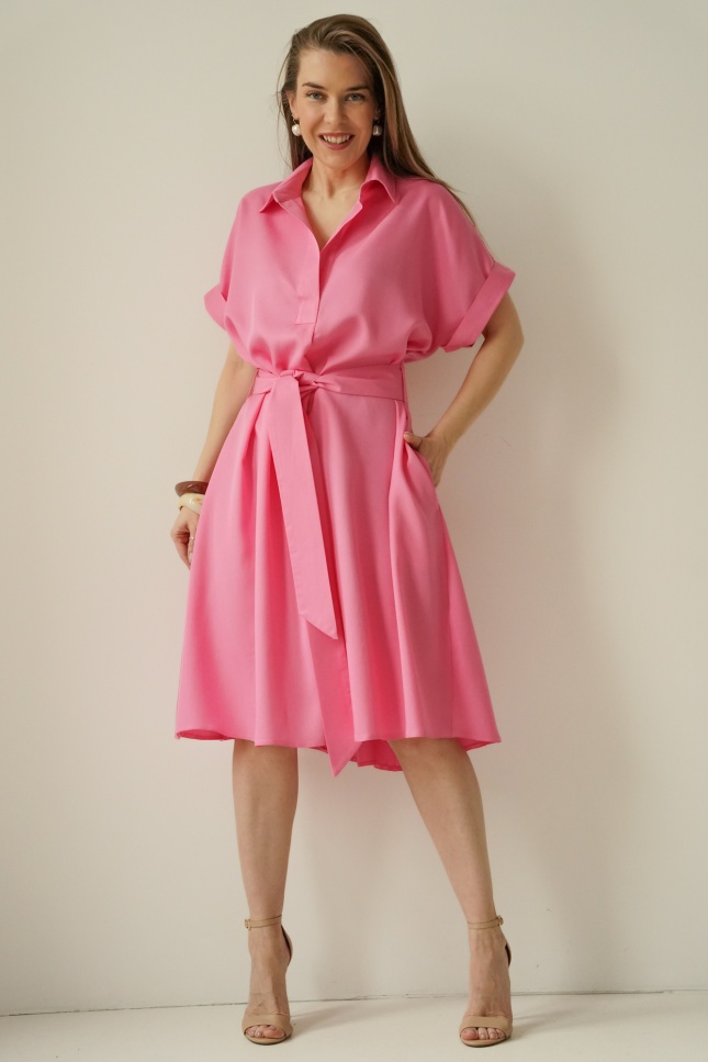 Uszyta w polskiej szwalni sukienka ELYN doskonale sprawdzi się zarówno w eleganckim looku do pracy, jak i w bardziej swobodnych stylizacjach na co dzień.