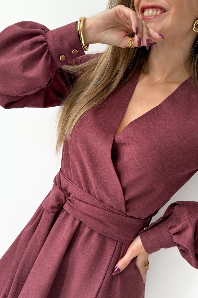 Kopertowy dekolt typu V i rozkloszowany dół nadają sylwetce lekkości, a elastyczna talia z szerokim paskiem pięknie ją podkreśla. Rękawy zakończone mankietem na guziki dodają elegancji. Uszyta z naturalnego materiału (90% tencel, 10% rayon) o aksamitnej, zamszowej strukturze – miękka, wygodna i niezwykle stylowa. Idealna zarówno na co dzień, jak i na wyjątkowe okazje.