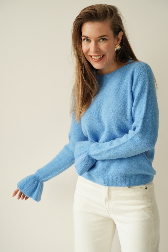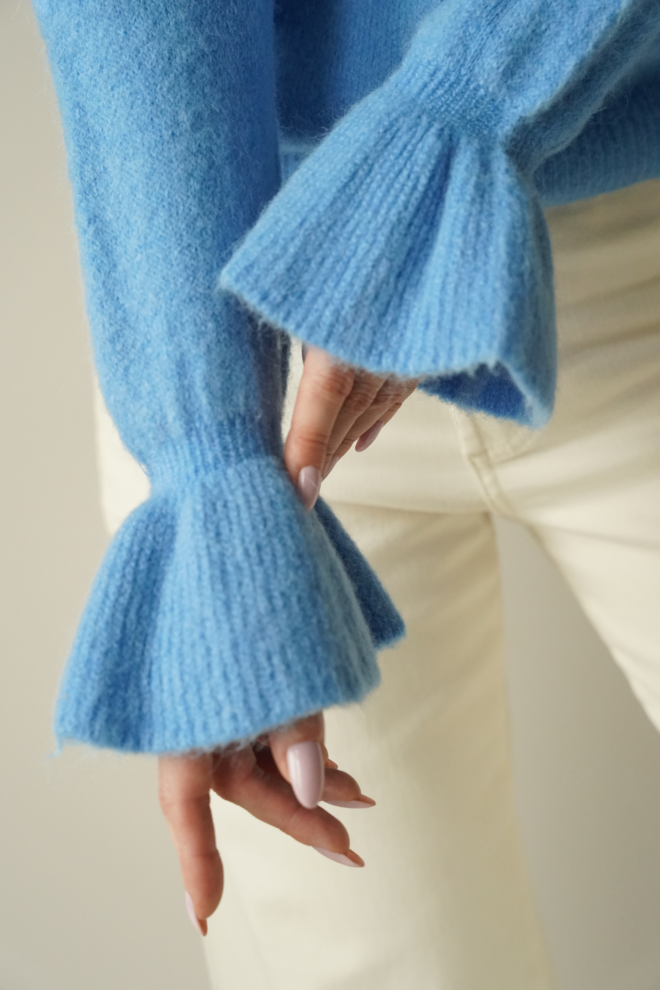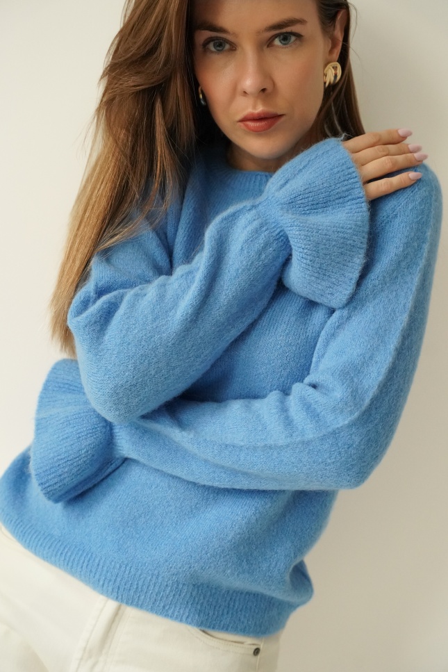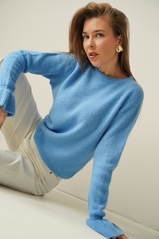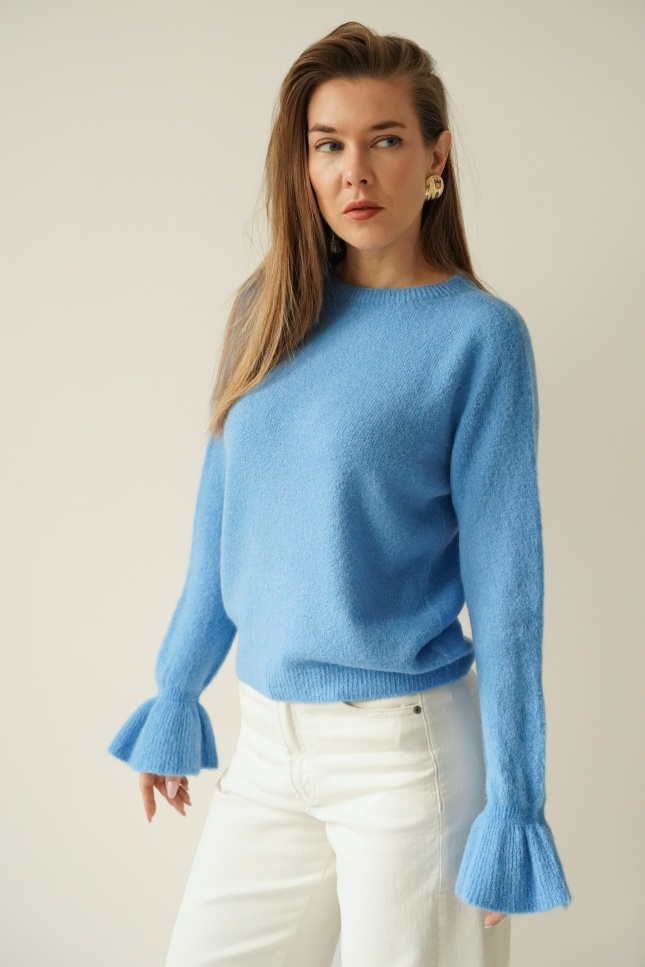 Sweter z falbankami baby alpaka i wełna dziewicza Elia błękitny