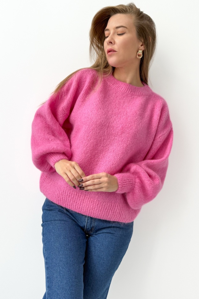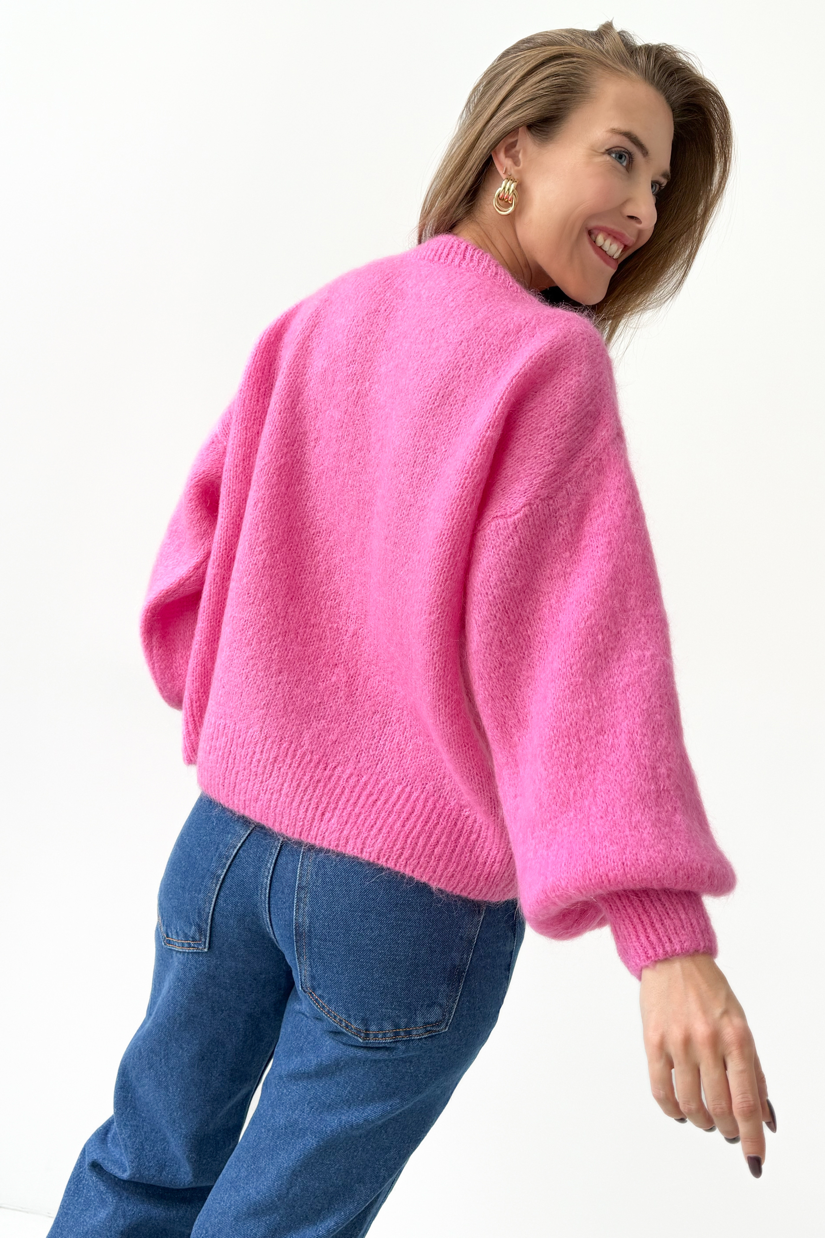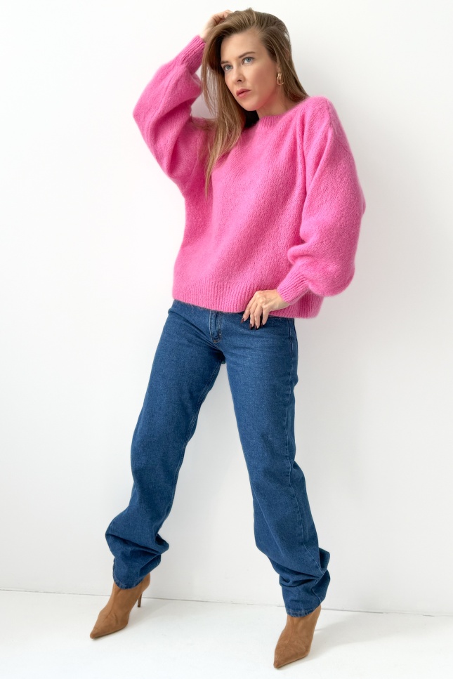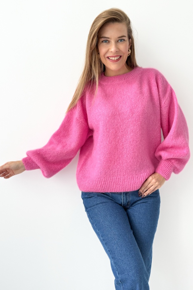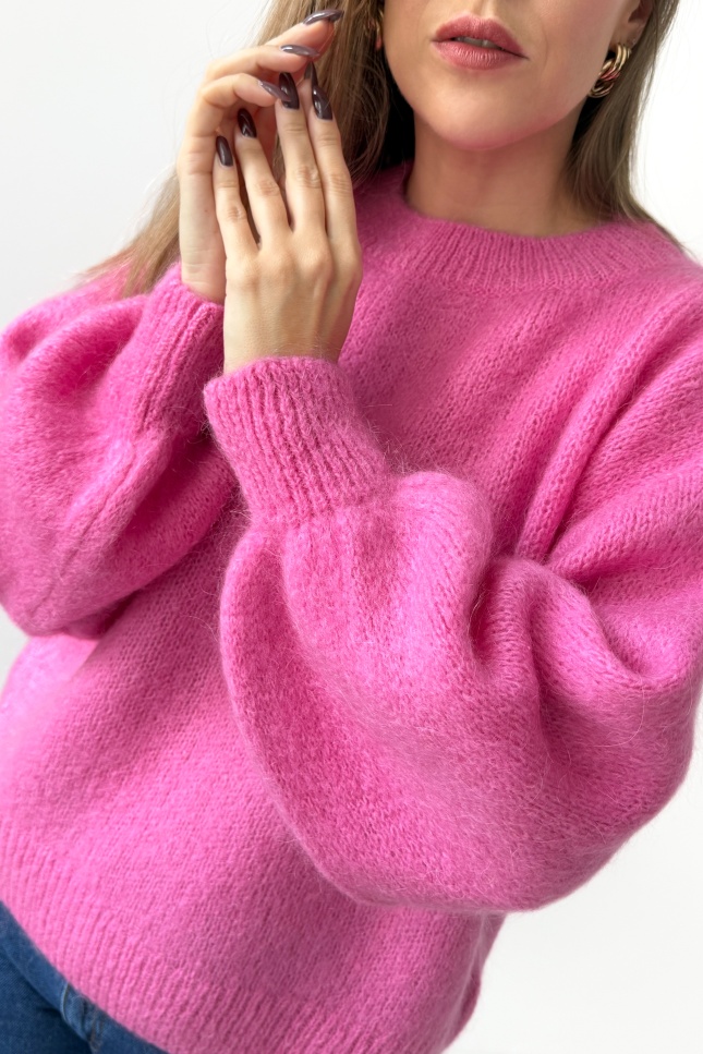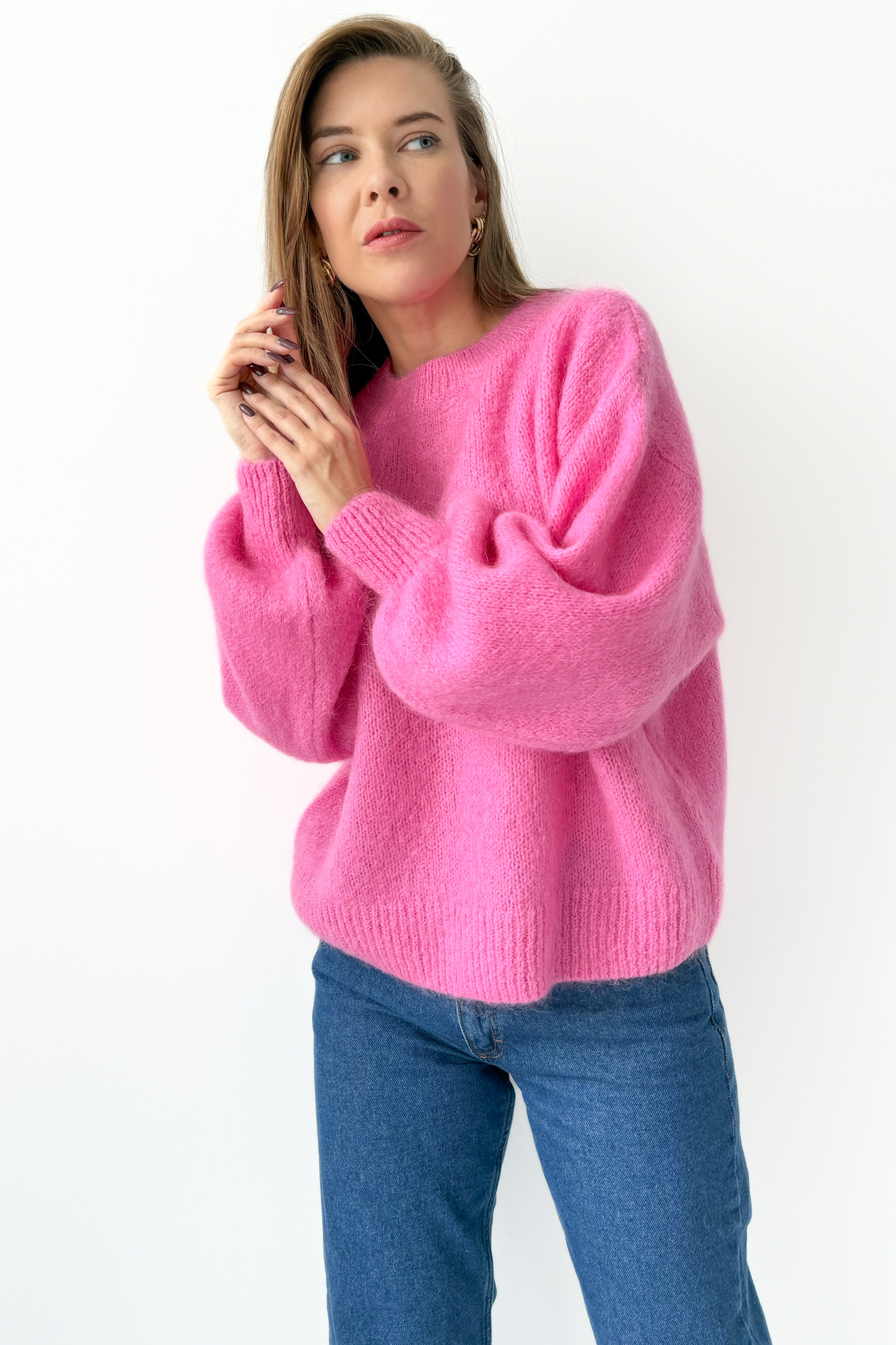 „Eva” to klasyczny sweter z subtelnie bufiastymi rękawami, który łączy prostotę formy z eleganckim detalem. Wykonany z naturalnej przędzy z dodatkiem kid moheru, moheru i wełny, zachwyca miękkością, lekkością i przyjemnym ciepłem. Ponadczasowy fason sprawia, że doskonale komponuje się zarówno z jeansami, jak i eleganckimi spodniami czy spódnicą – to sweter, który zawsze wygląda stylowo.