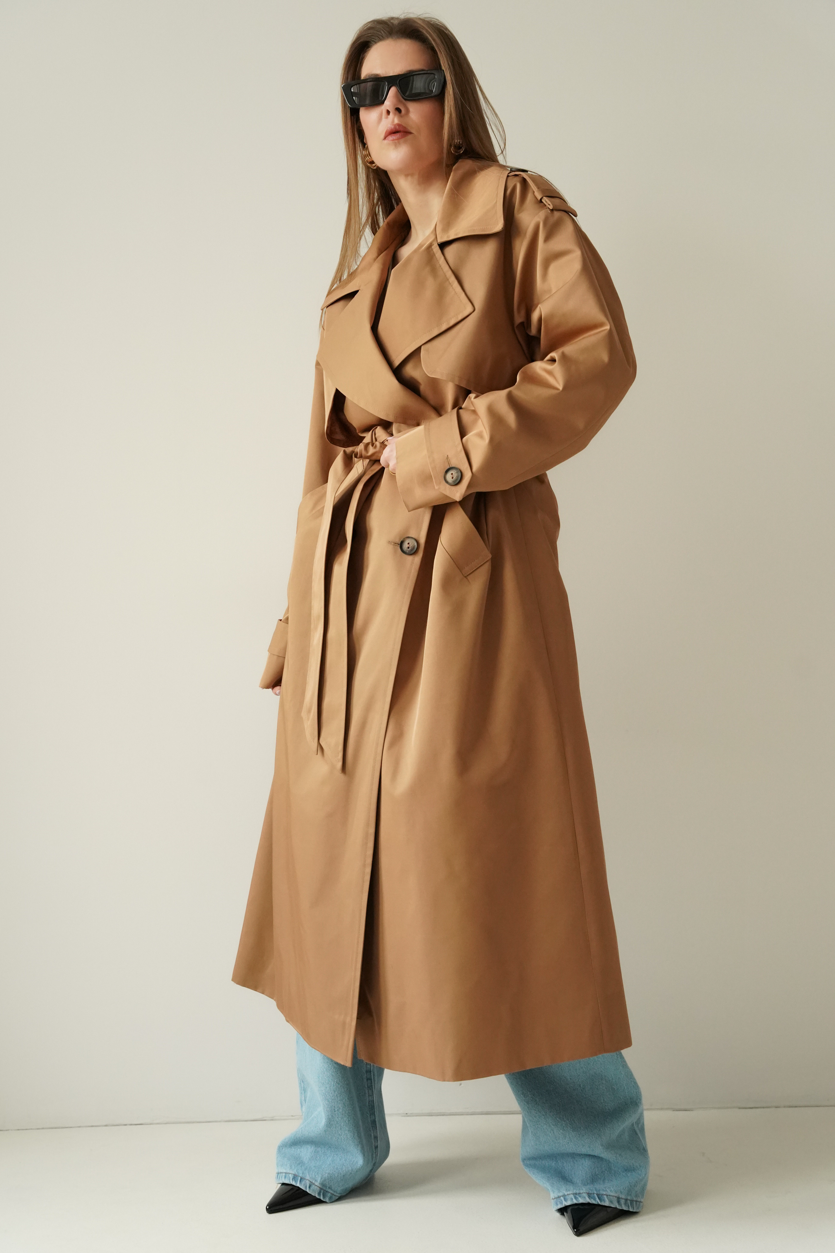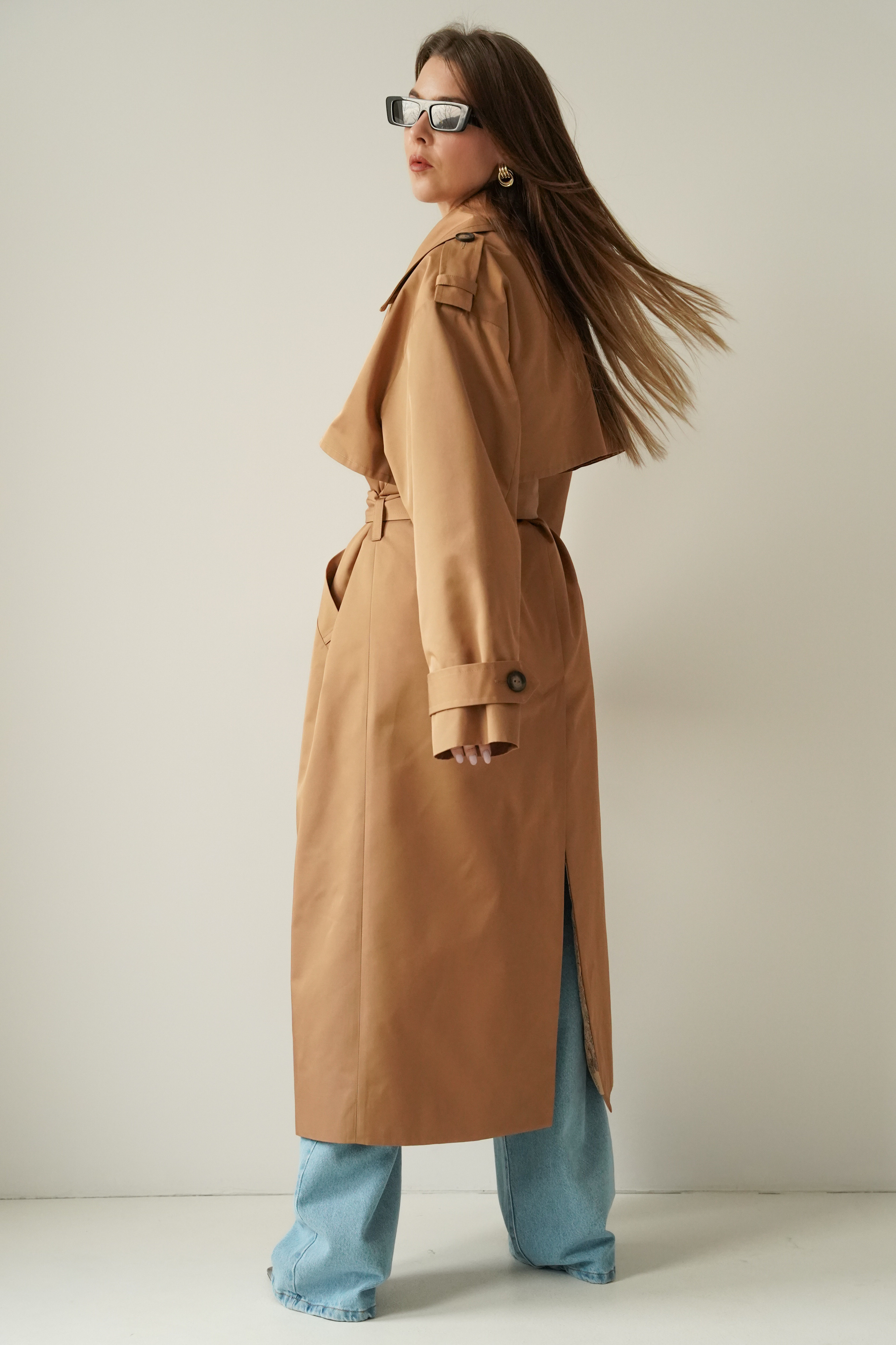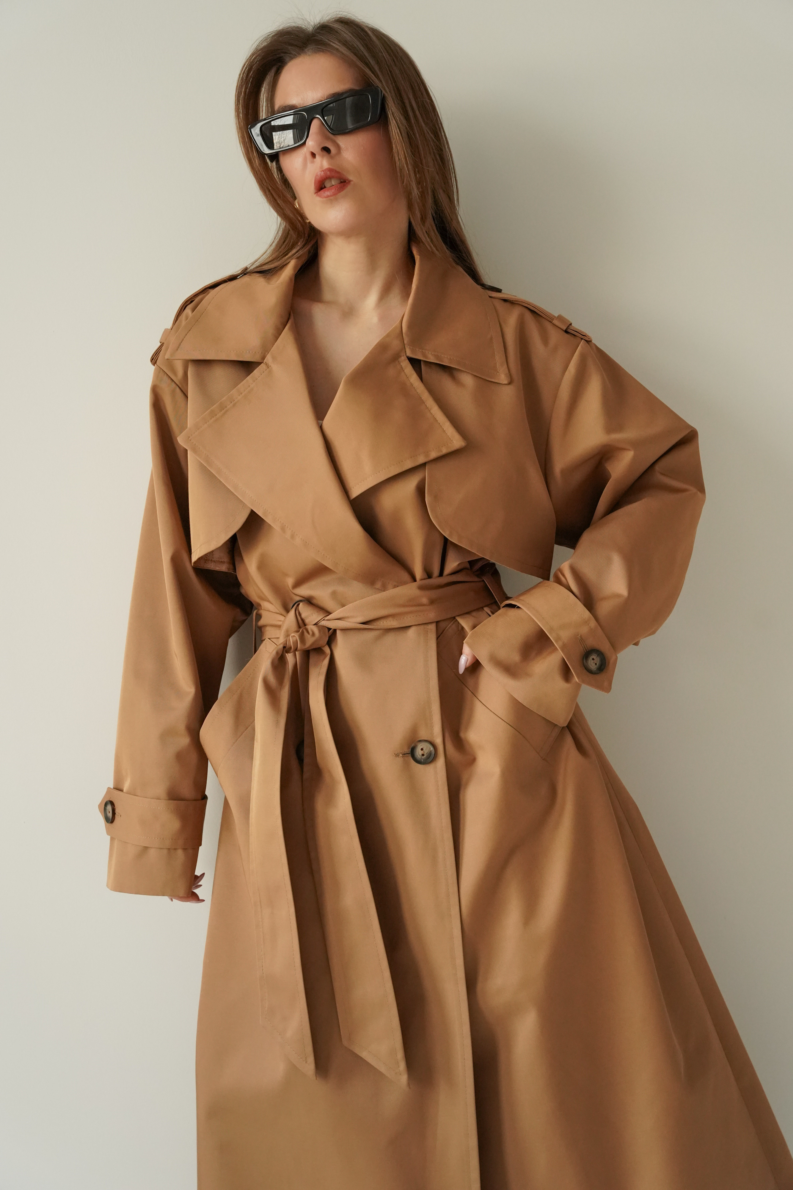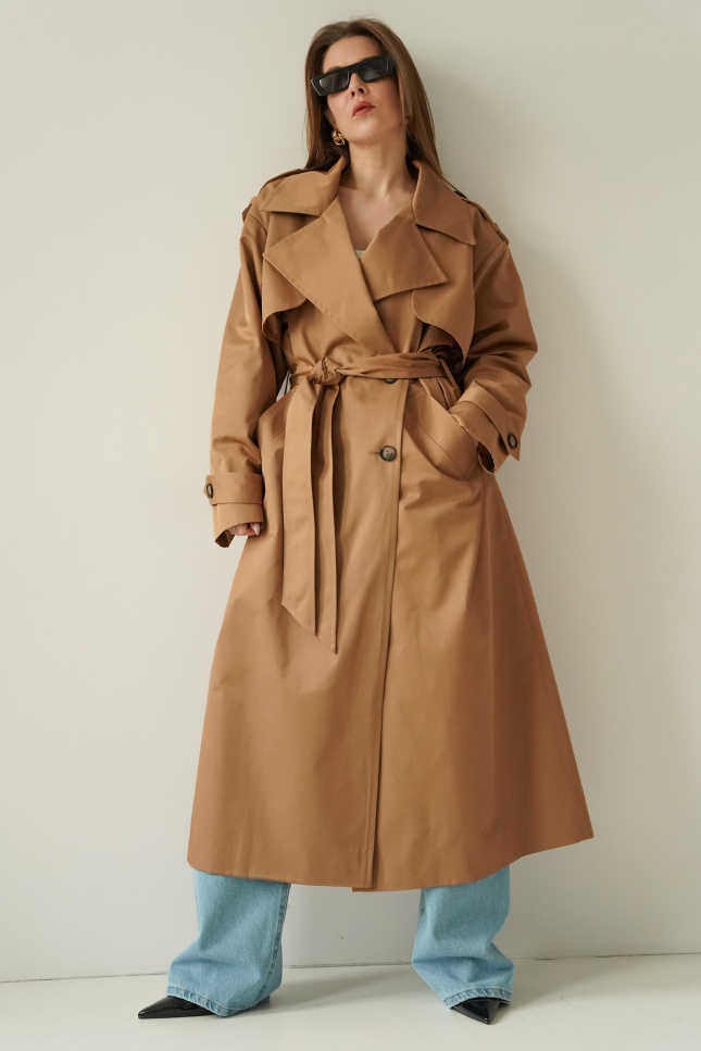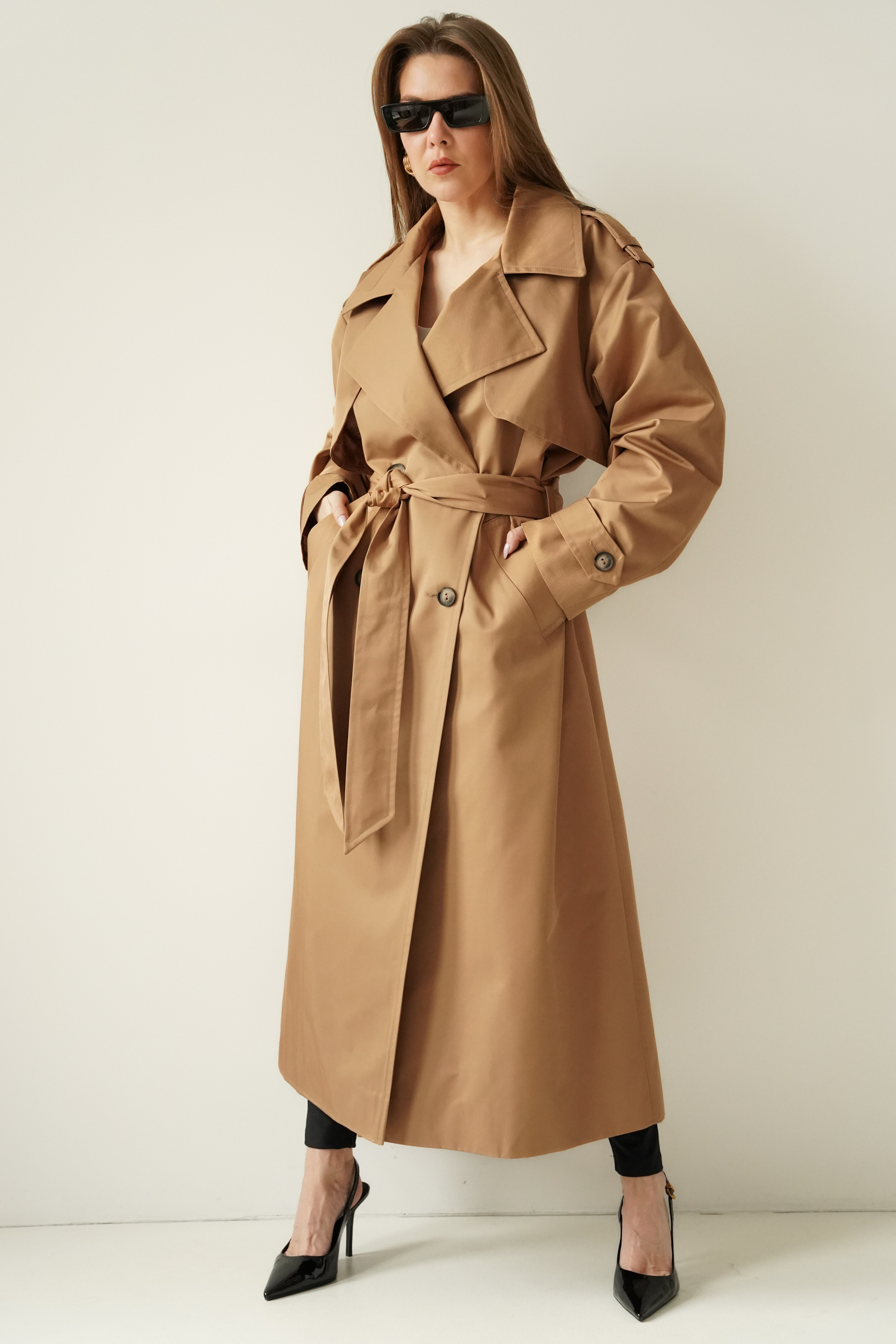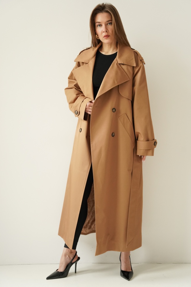 Nowoczesny trencz maxi o klasycznej, dwurzędowej konstrukcji. Uszyty z bawełnianej tkaniny (75%), z komfortową podszewką z 100% wiskozy. Pasek w talii, kieszenie boczne, pagony na ramionach i rozcięcie z tyłu. Model ponadczasowy, zaprojektowany na lata.