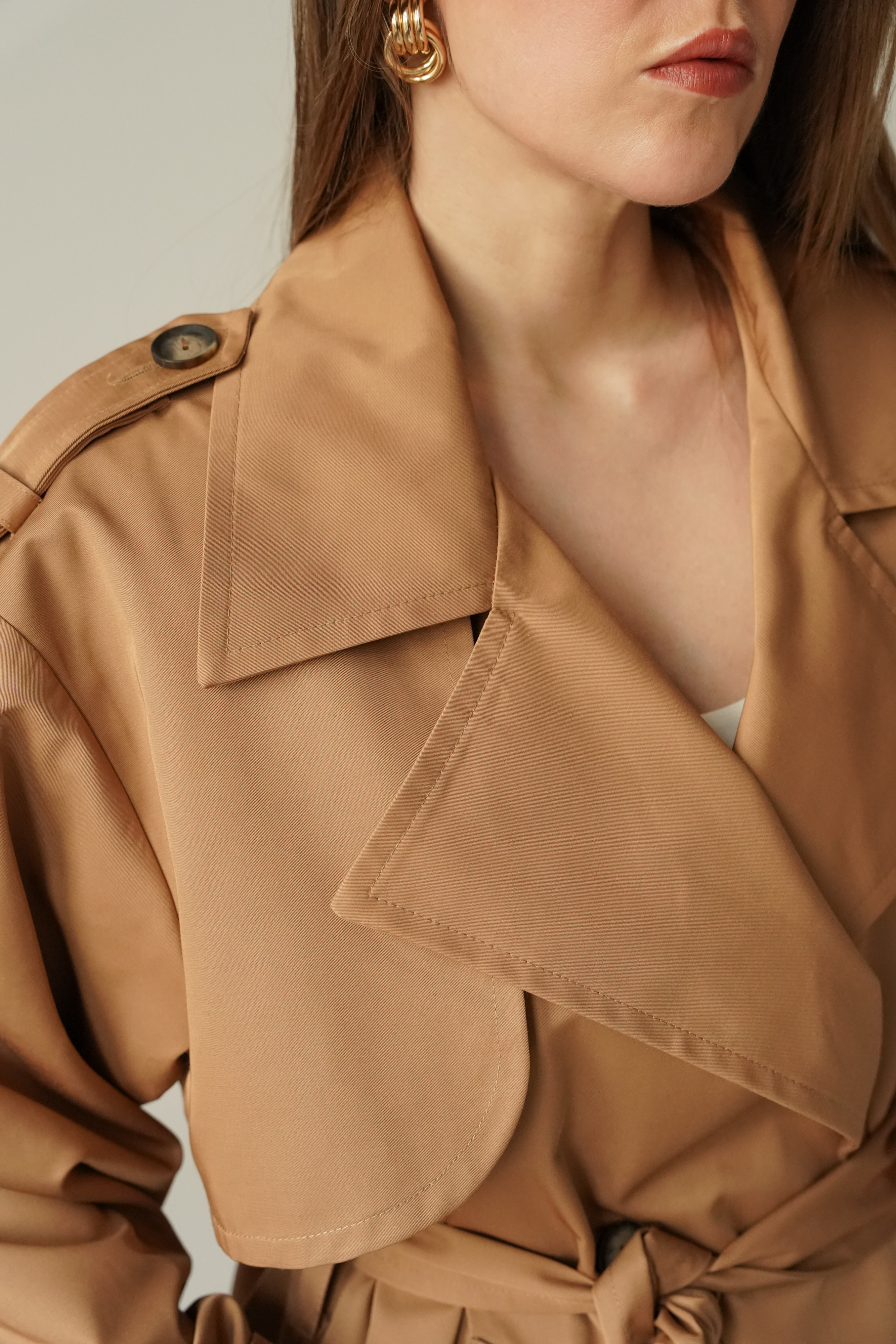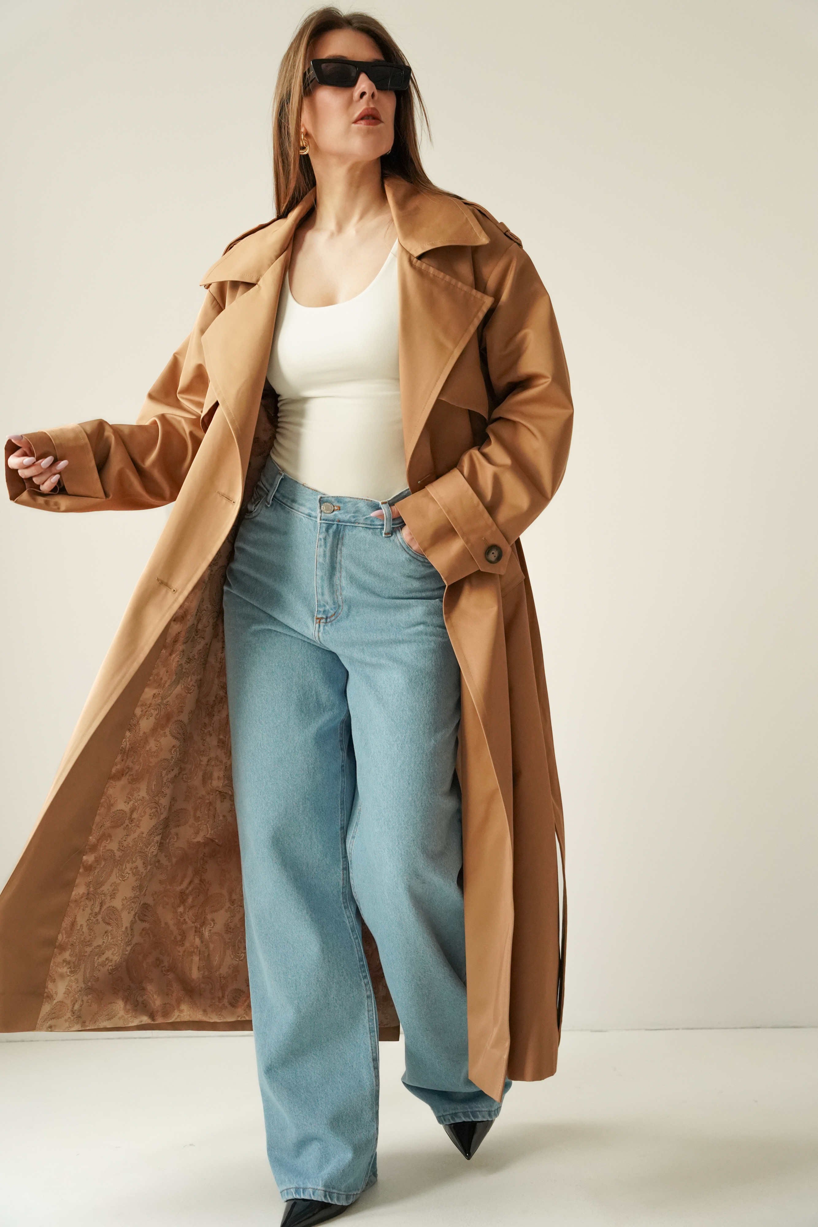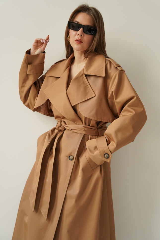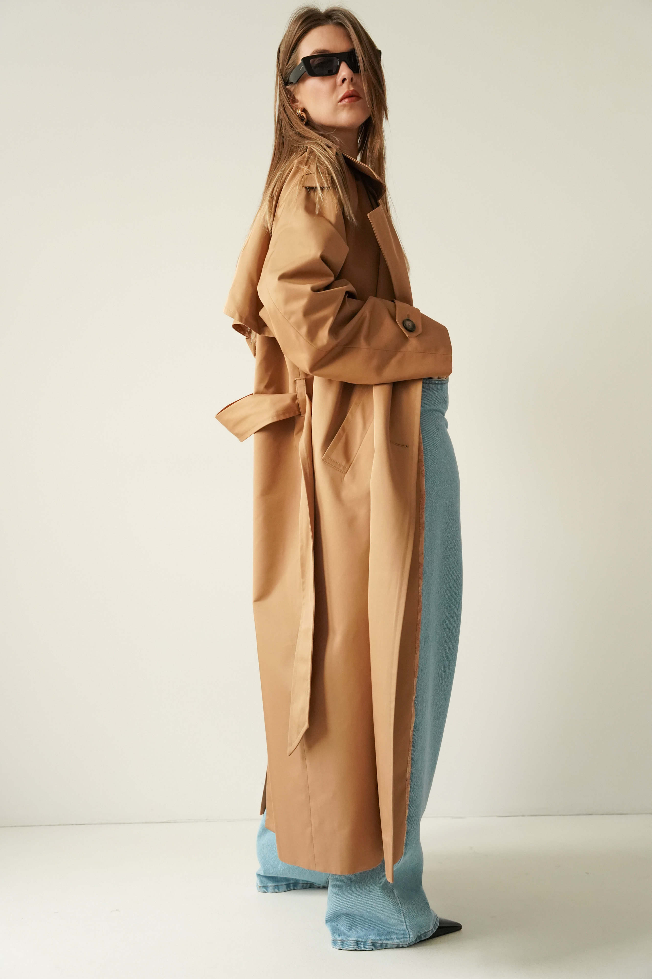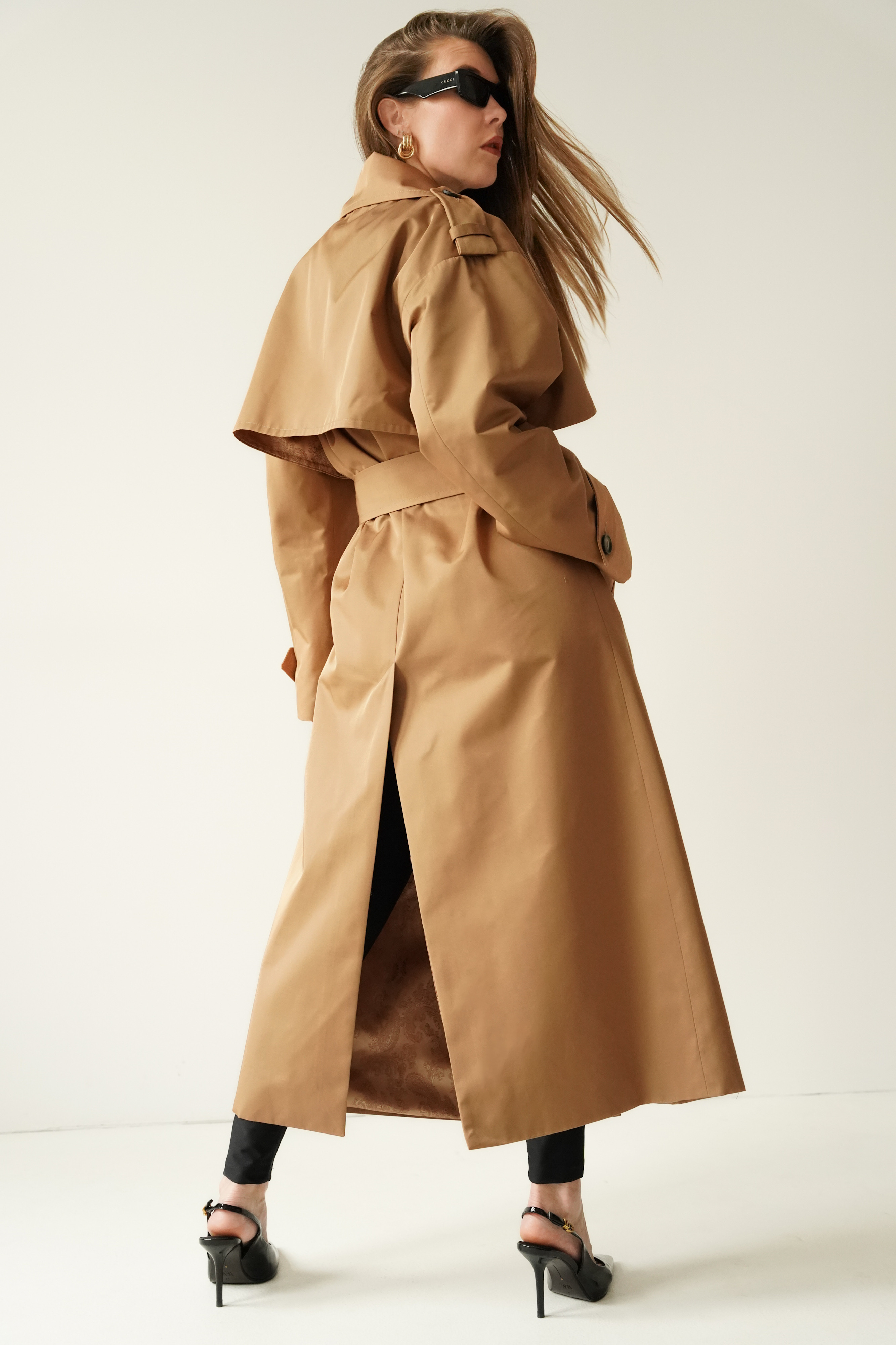 Nowoczesny trencz maxi o klasycznej, dwurzędowej konstrukcji. Uszyty z bawełnianej tkaniny (75%), z komfortową podszewką z 100% wiskozy. Pasek w talii, kieszenie boczne, pagony na ramionach i rozcięcie z tyłu. Model ponadczasowy, zaprojektowany na lata.