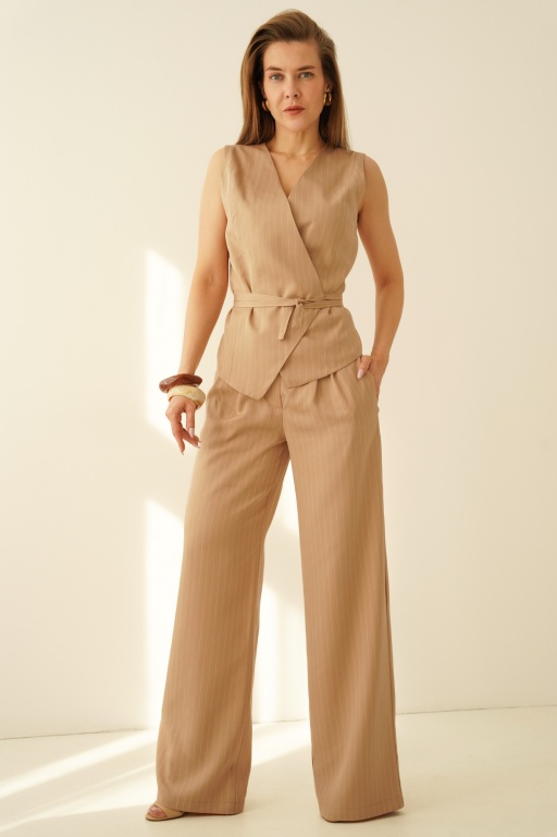 Elegancki komplet w prążek z wiązaną kamizelką i spodniami palazzo Clara piaskowy