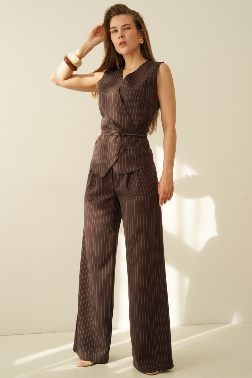 Elegancki komplet w prążek z wiązaną kamizelką i spodniami palazzo Clara czekoladowy