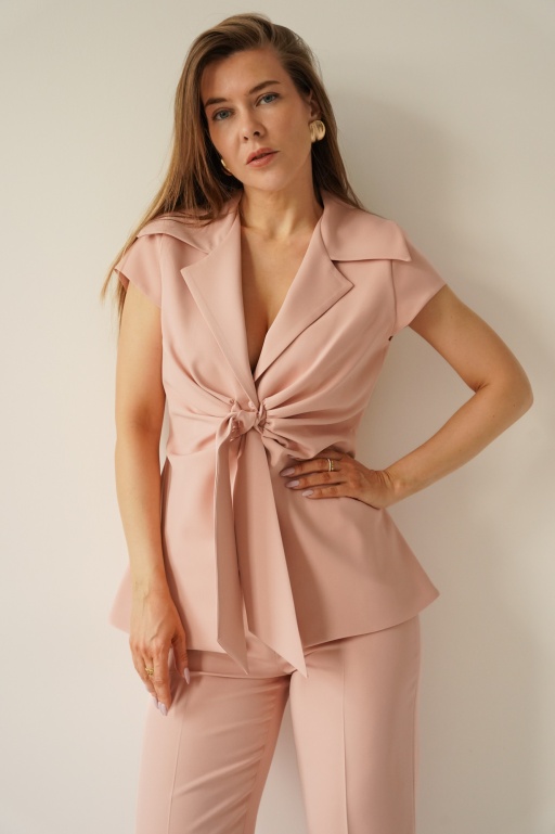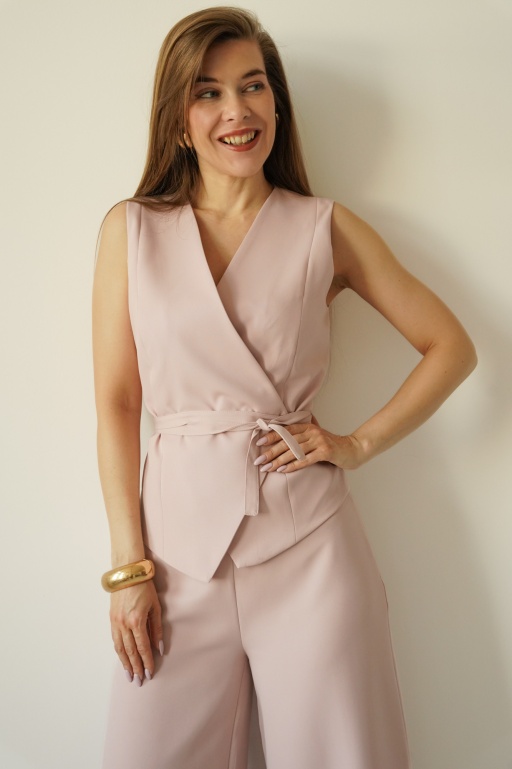 Elegancki komplet z wiązaną kamizelką i spodniami palazzo Coco pudrowy