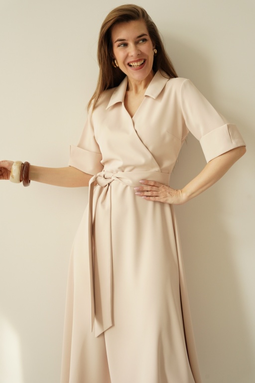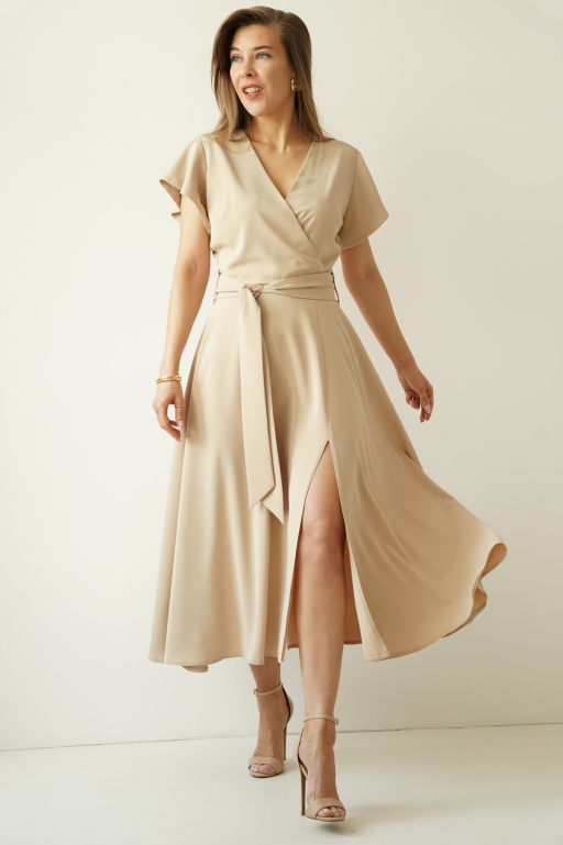 Kobieca elegancka rozkloszowana sukienka z kopertowym dekoltem Charm beżowa