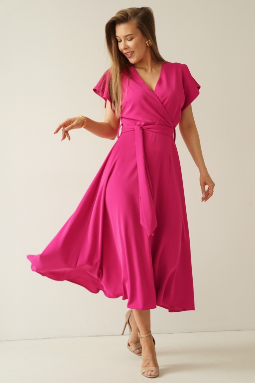 Kobieca elegancka rozkloszowana sukienka z kopertowym dekoltem Charm fuksja
