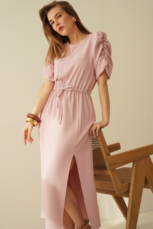 Elegancka kobieca sukienka z bufiastymi rękawkami Celine pudrowy róż