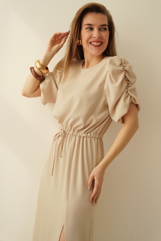 Elegancka kobieca sukienka z bufiastymi rękawkami Celine beżowa