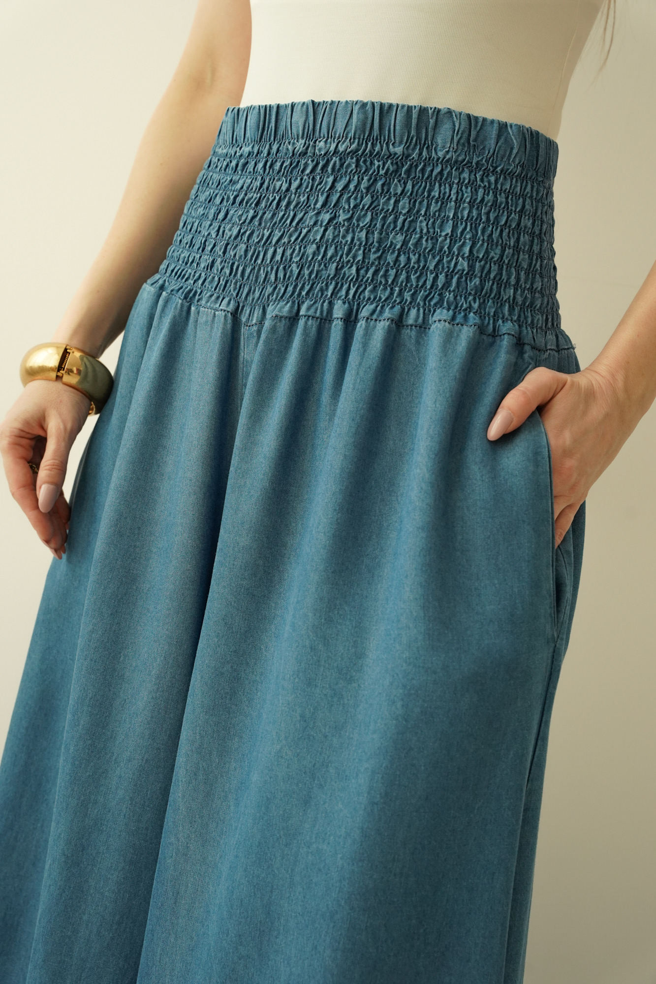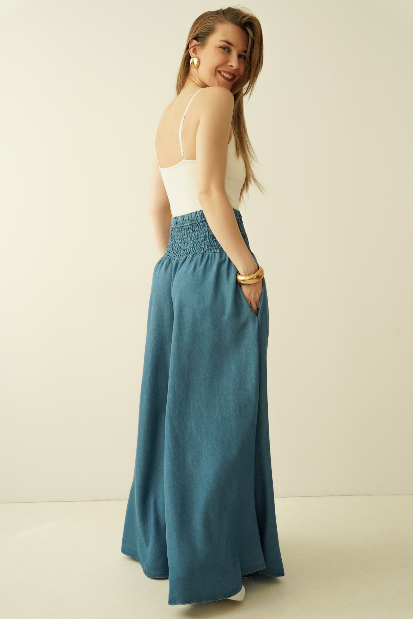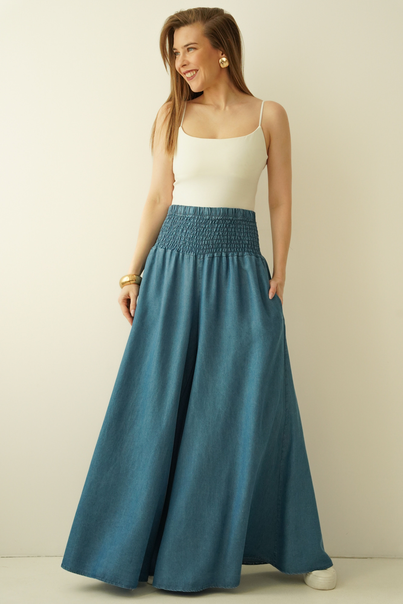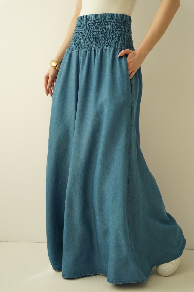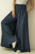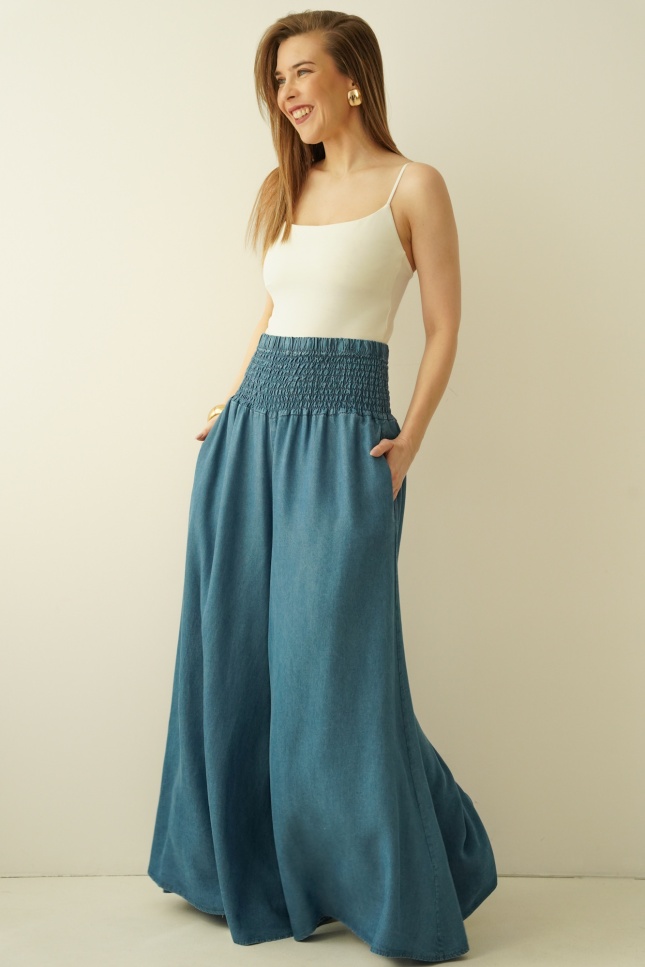 Spodnie Sienna to oryginalny model o ultra szerokich nogawkach imitujących spódnicę, uszyty ze zwiewnego, naturalnego 100% lyocellu. Wysoki stan z charakterystycznym gumkowaniem pięknie podkreśla talię i zapewnia komfort noszenia. Lekka, lejąca tkanina subtelnie pracuje w ruchu, nadając sylwetce kobiecej miękkości i elegancji. To idealny wybór do stylizacji boho, premium casual i nowoczesnych miejskich looków.